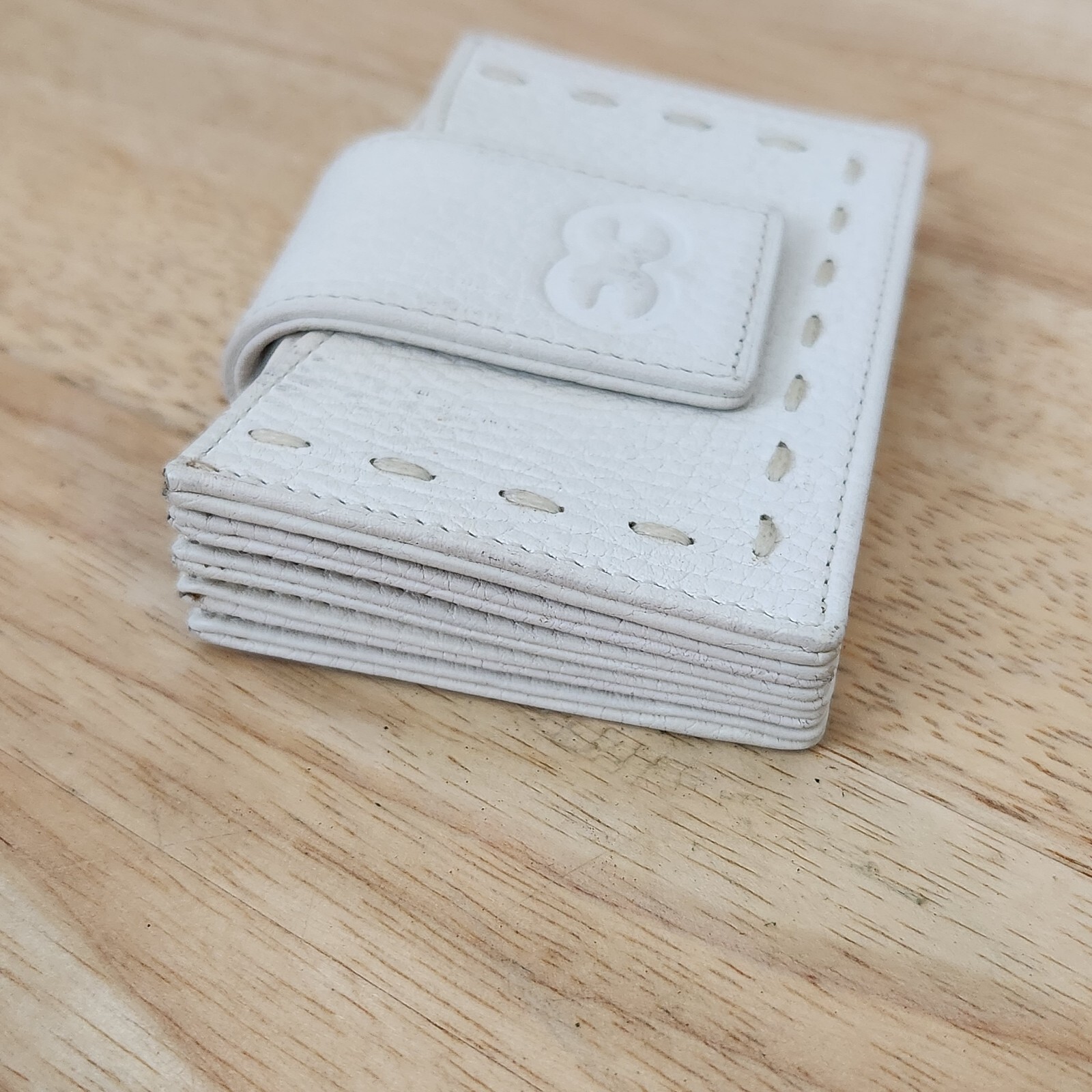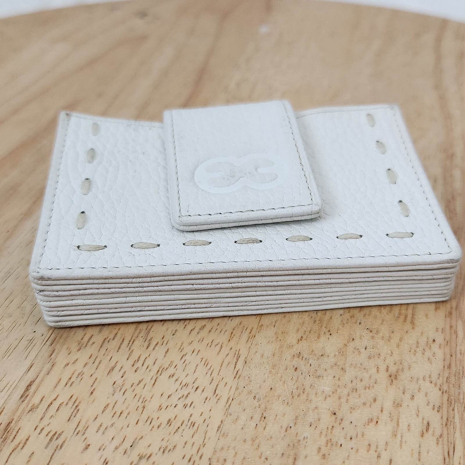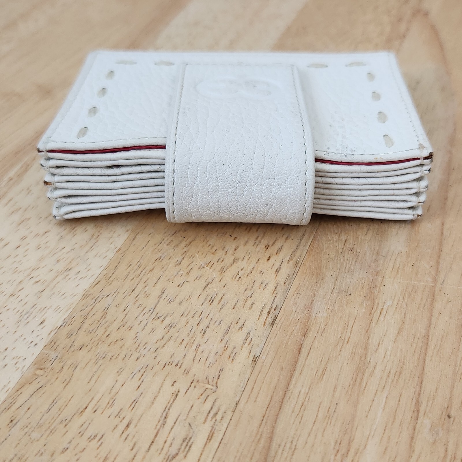 This chic Escada card holder is a stylish and practical find! The pebbled leather feels luxurious, and the accordion design expands nicely to hold cards securely. Though pre-owned with slight pink staining, it’s in great shape overall—perfect for tossing in a small bag. Love the compact yet functional design, and the white color stays timeless. A great deal for a designer piece!
