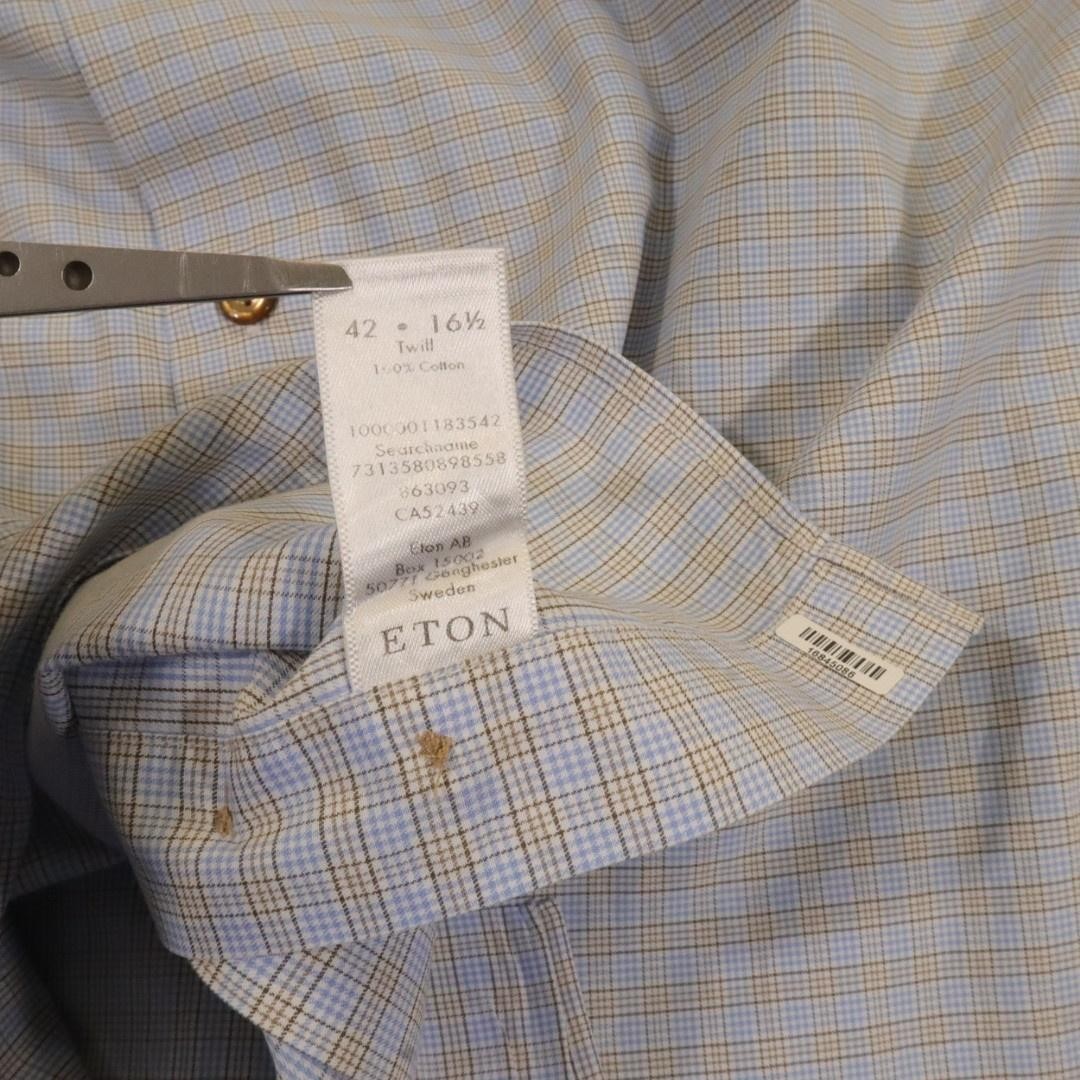 Brand: Eton Style: Mens long sleeve dress shirt in the Contemporary fit with spread collar and button front. Color/Pattern: Light blue base with tan and brown micro check plaid and contrasting brown buttons. Tag size: 42 / 16.5 neck, 34/35 sleeve; contemporary fit with a regular tailored silhouette. Material: 100% cotton twill