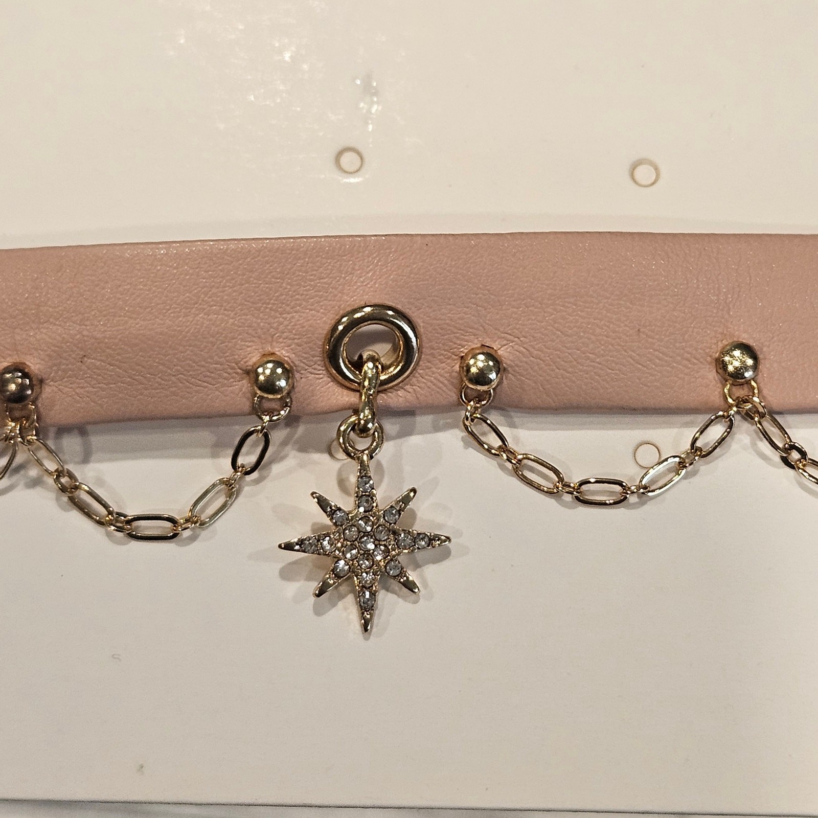 Ettika Sleeping Beauty Pink Leather Choker Necklace Star Charm Celestial Boho Who needs a knight in shining armor when the Ettika Sleeping Beauty Pink Leather Choker Necklace is around?! This pink genuine leather choker has gold studs, dangling chain, and a rhinestone encrusted star charm at center. Necklace measures 10" around with a 5" extender chain. Genuine leather. Gold-plated. Balance man made materials. Lobster clasp closure. Adjustable New with tags, no flaws. Sold at Lulus. Smoke free, dog friendly home. sun stars celestial boho bohemian editorial fantasy fashion twee quirky cottage rock punk concert