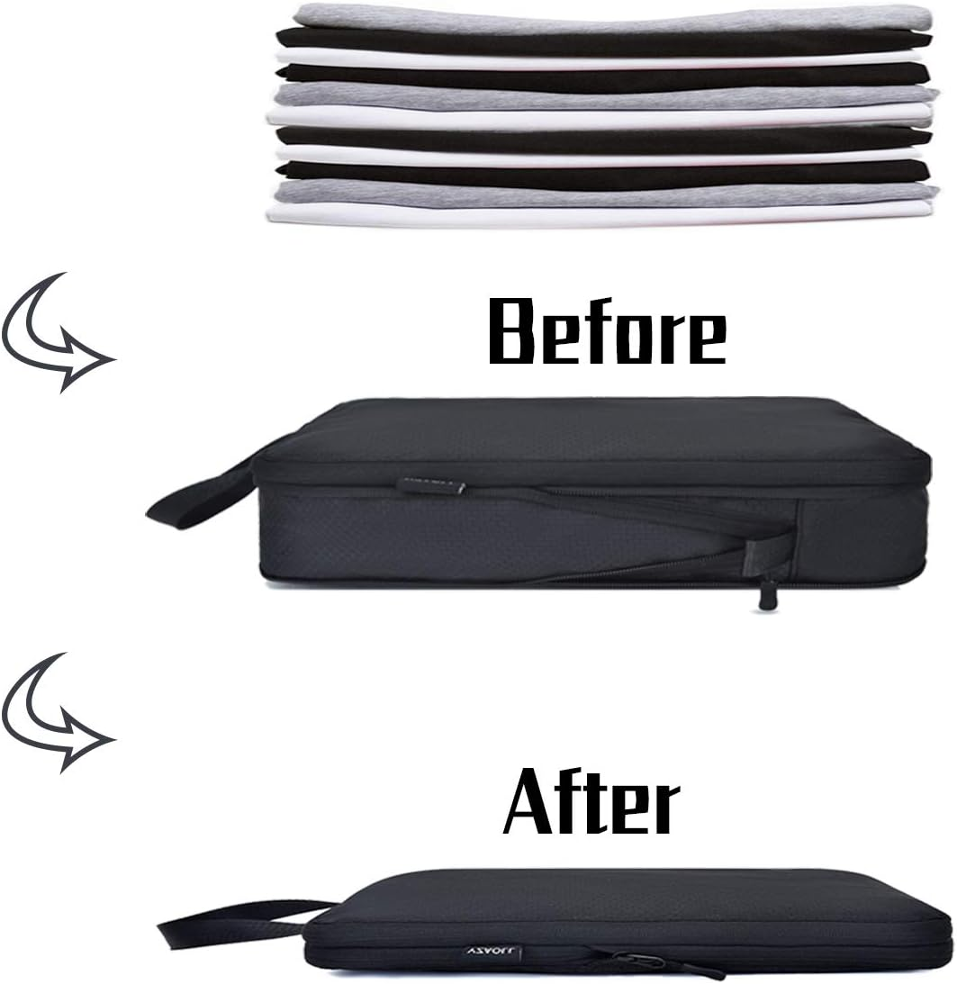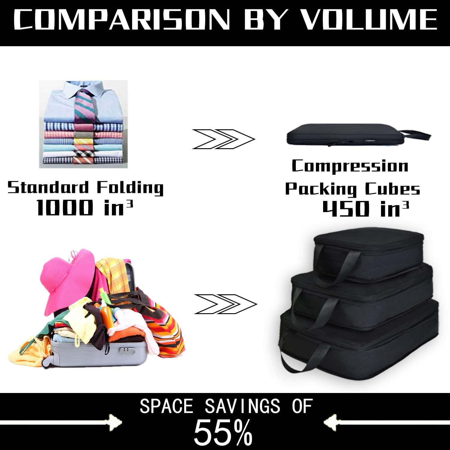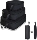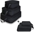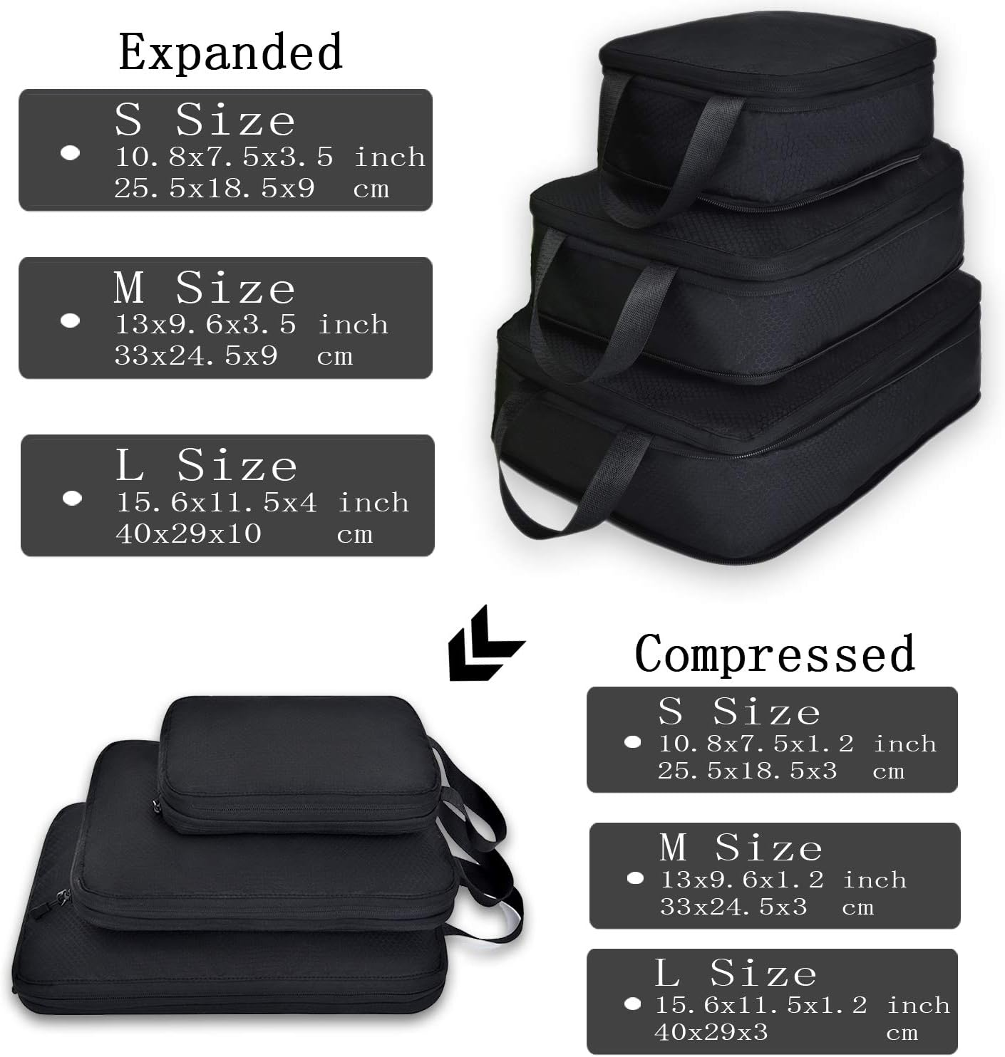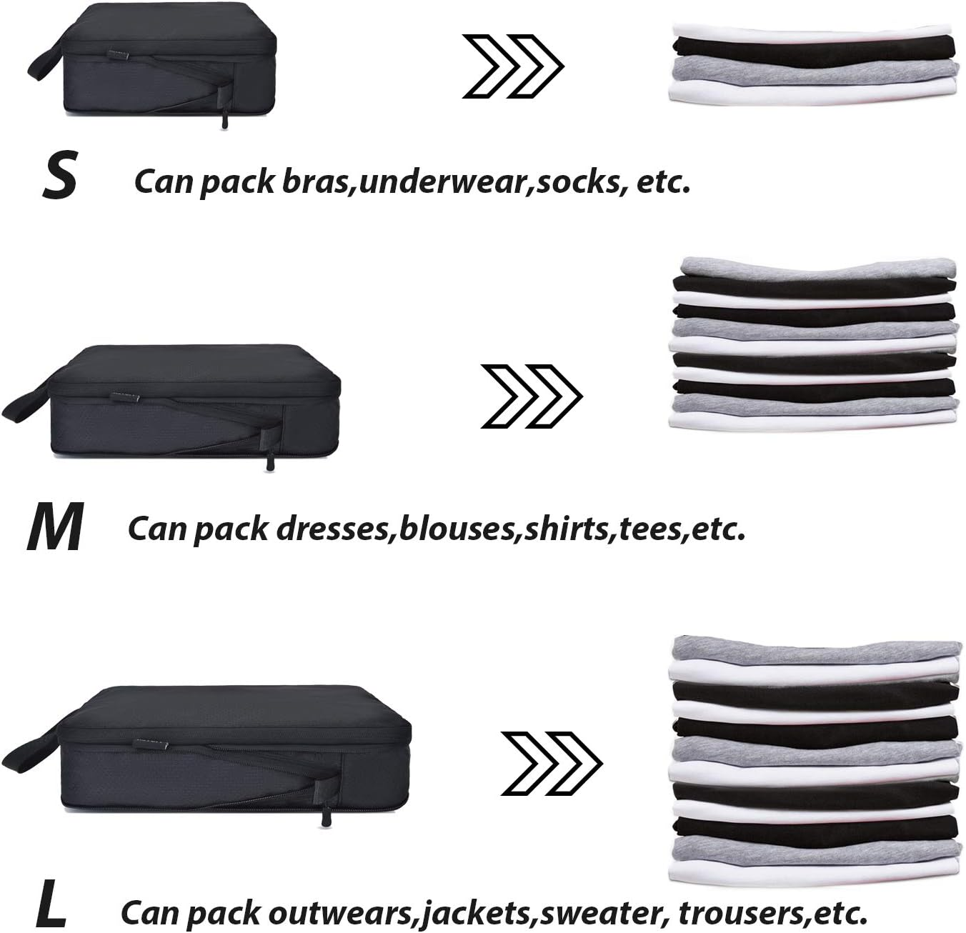 Nylon ✅【PACK MORE IN LESS SPACE】Space saving by compression,Save up to 55% space by compressing the packing cubes via the exterior compression zippers. ✅【DIFFERENT SIZES TO MEET DIFFERENT NEEDS】Luggage organizers in different sizes and color,Fast locating everything you put in the suitcase and backpacks. Large Compressed Size: 15.6x11.5x1.2inch, Expanded Size: 15.6x11.5x4inch;Medium Compressed Size 13x9.6x1.2inch, Expanded Size: 13x9.6x3.5inch; Small Compressed Size 10.8x7.5x1.2inch, Expanded Size: 10.8x7.5x3.5inch. ✅【MORE DURABLE & ULTRALIGHT】Super light nylon fabric and considerate designed construction ensures storing your clothes neatly in luggage without adding extra weight premium sturdy & smooth zipper with extended cord ensure fast & easy opening and closing of the packing cubes. ✅【WATER-RESISTANT & DUSTPROOF】High-density fabric provides travel packing bags excellent performance in water resistance and dustproof, unlike other mesh packing cubes. ✅【FAST LOCATING & ABSOLUTELY CLEAR】Luggage organizers in different sizes and color,Fast locating everything you put in the suitcase and backpacks, Separating your clothes,such as Jackets,Sweaters,Underwears,Socks into Different Packing Cubes for easy access. ✈️【4 Different Sizes/7 Packing Cubes】1 Toiletry Bag(9.2"x 5.7"x 3")+2 Large(14.9"x 10.2"x 3.9")+2 Medium(12.6"x 9.9"x 3.6") +2 Small(11"x 7.9"x 3.6").You could pack your clothes in different cubes according to your needs. Product Description DIFFERENT SIZES TO MEET DIFFERENT NEEDS Large Compressed Size: 15.6x11.5x1.2inch, Expanded Size: 15.6x11.5x4inch; Medium Compressed Size: 13x9.6x1.2inch, Expanded Size: 13x9.6x3.5inch; Small Compressed Size :10.8x7.5x1.2inch, Expanded Size: 10.8x7.5x3.5inch. PACK MORE IN LESS SPACE Space saving by compression,Save up to 55% space by compressing the packing cubes via the exterior compression zippers.