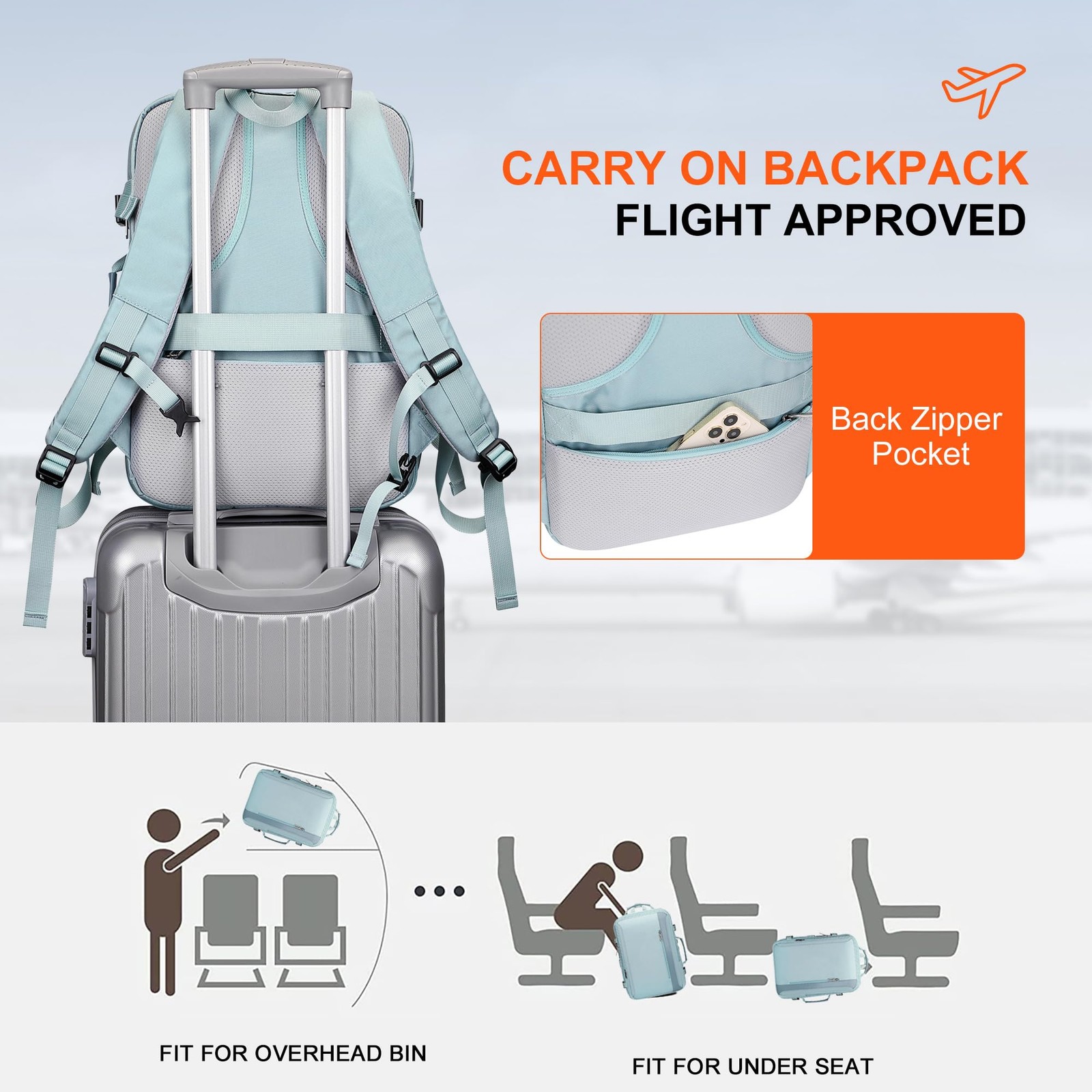Descriptions: Travel Backpack for Women Men Airline Approved Carry on Backpacks Personal Item Luggage Bag Material: High quality and breathable, lightweight nylon material fabric. Size Approx:11 inches(L)x8.6 inches(W)x 17 inches(H). Net weight Approx: 1.16 kg/2.5lbs. Max size could fit: It can fit in a 11 inch iPad and 16inch laptop. Multipurpose: carry on travel backpack, laptop backpack, gym bag, luggage backpack. Condition: New high quality travel laptop backpack, gym backpack, suitcase backpack. Occasion: Casual, shopping, work or office, etc. Audience: study travel backpack for women, men, adults, ladies, madam, female, etc. Large Capacity Backpack structure: 1 front accessory compartment 1 main compartment 1 Laptop and iPad compartment 1 separate laptop compartment 1 side pocket Package include: 1 Travel Laptop Backpack Remarks: 1. This product is made of top quality and lightweight nylon material fabric. 2. Please confirm the size according to our description. 3. Please allow little color difference due to different cameras or environments. This bag is only suitable for adults. Flight Approved: Size: 11 inches(L)x8.6 inches(W)x 17 inches(H). The main compartment of this carry on luggage backpack features a wide 180° flap opening for efficient airport security checks. It meets the requirements of most airlines, making it an ideal choice for your trip. Lightweight and Long Lasting Used: our laptop bag is crafted from sturdy and lightweight nylon material, only 1.16 kg/2.5lbs, easily meeting your demands of frequent travel. It's designed for comfort with adjustable shoulder straps and a breathable padded back panel, ensuring a comfortable carry during extended journeys. Large Capacity and Organized: This underseat backpack offers 3 large compartments for organization. 1 front compartment designed with multiple small pockets to maintain an orderly arrangement of your belongings. 1 main compartment ample space for everyday items such as clothing. 1 separate laptop compartment that fits 16 inches laptop and 11 inches iPad. This large backpack has over 10 pockets, including 1 side pocket for a water bottle or umbrella. Expandable and Safe: This travel laptop back packs are designed to expand from 8.6 inches to 11.75 inches, offering a generous capacity when unzipped for additional storage space. Moreover, a secure theft deterrence pocket on the back of this backpack ensures a safe spot for your wallet, passport, and ID card, safeguarding your valuables from theft during travel or while waiting in line. USB Port and Wet bag: This flight carry on bag features an external USB charger port and an internal charging cable, providing an easy way to power your phone during travel(Please be aware that a power bank is not included). The included wet bag, crafted from high quality water repellent material, is specifically designed to compartmentalize your dry and wet items, maintaining separation and organization within your luggage.