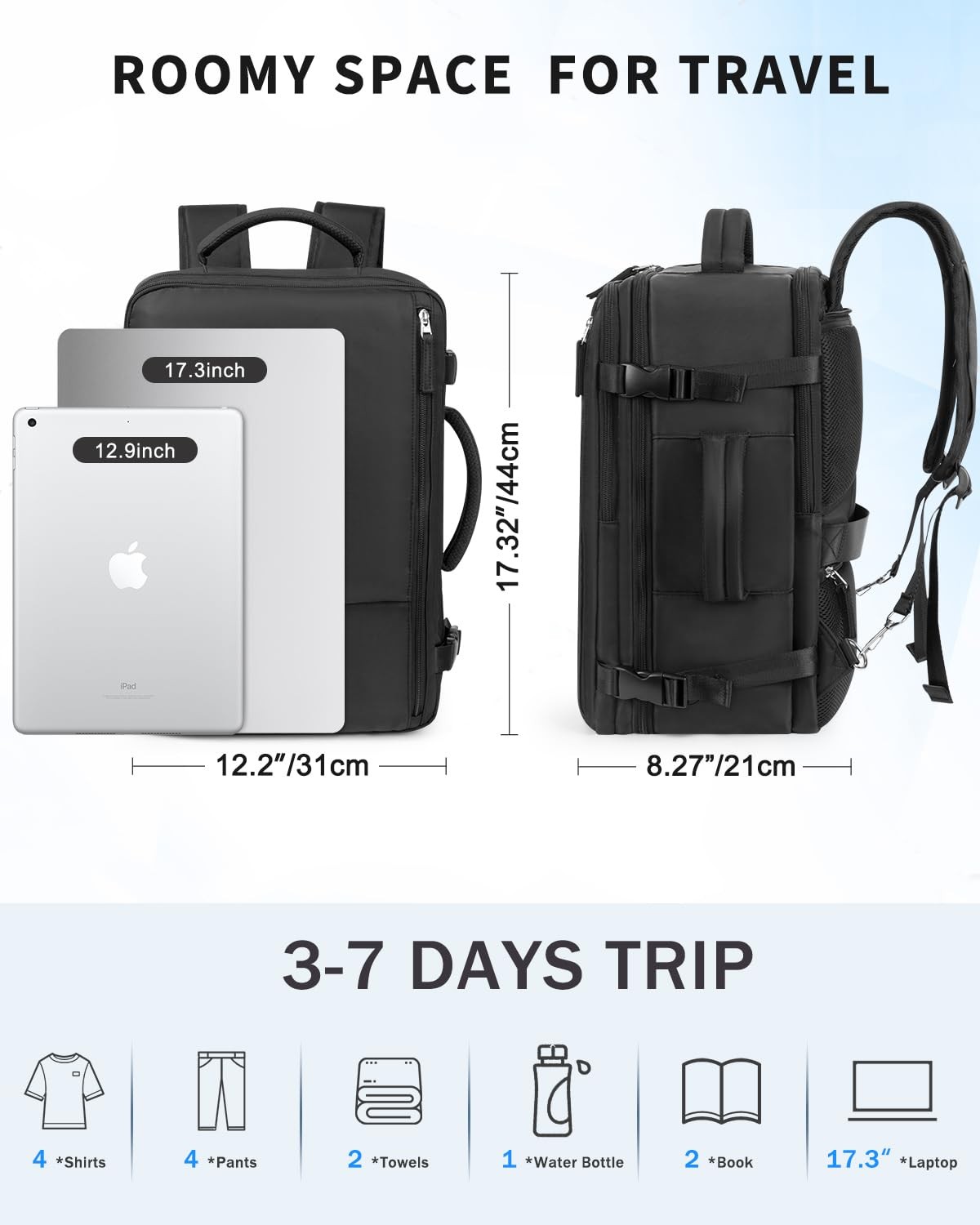 Travel Backpack for Women Men, Expandable 40L Carry On Backpack with USB Charging Port, 17.3 Inch Laptop Backpack Flight Approved Luggage, Waterproof Personal Item Bag for Weekender, Travel, College, Blue Roomy Capacity & Multi-Pocket: Dimensions 17.32*12.2*8.27'' travel backpack for women provides 40L capacity that can easily 5-7 days outfits, and the ''X'' clip in main compartment will keep your stuff from moving around. Various pockets of this traveling backpack allows you to stay organized and the thick padded laptop pocket will protects your device nicely and fits laptop up to 17.3inch. At the same time, travel backpack carry on is water resistant. Flight Approved Laptop Backpacks: travel backpack meets the requirement for personal item size for most airline companies includes Southwest, Spirit, JetBlue, United, Frontier Airlines and more, so you can put it under your seat or overhead bin to save extra money. This carry on backpack can be open to 180 degrees like a suitcase, which will help you get through airport security quickly. Multi Carry Ways: backpack for travel is equipped with a shoulder strap pocket that you can easily hide the shoulder strap in it to avoid the straps getting dirty when going through airport security or put on the ground. The handle on the side and the top makes it possible to carry the carry on backpack like a briefcase and easily grabbed from under the seat. Versatile Pockets: This personal item travel bag comes with 2pcs clear toiletry bags worth $4.99 that you can place your makeup, skincare and bath products, towels or more, also there is a high density waterproof wet pocket that you can place wet item or dirty clothe/shoes. The hidden pocket in the bottom back can be used to valuables to keep secure. The luggage strap allows the suitcase backpack to slip over the luggage handle for hands-free carrying. backpack suitcase for mens travel bag Providing dedicated space for your pen, textbooks, wallet, clothes, shoes, bottle etc. At the same time, small backpack men is water resistant Widely Application: backpack for women and men can be used as work backpack, college backpack, hiking backpack, weekender backpack, travel backpack, it is a ideal gift choice for friends, families, classmates at Anniversary, Birthday, Valentine's Day, Mother's Day, Halloween, Thanksgiving, Christmas, back to graduation; Premium Book bags for men also computer backpack for women and men. Expandable & Large Capacity: With size 17.32*12.2*8.27inch, extra large travel backpack for women provides 40L capacity that can easily 3-7 days outfits with expandable feature. Various pockets of this traveling backpack allows you to stay organized and the thick padded laptop pocket will protects your device nicely and fits laptop up to 17.3inch. The “X” clip in main compartment will keep your stuff from moving around. 【Flight Approved】Travel backpacks meets the requirement for personal item size for most airline companies includes Southwest, Spirit, JetBlue, United, Frontier Airlines and more, so you can put it under your seat or overhead bin to save extra money. This carry on backpack can be open to 180 degrees like a suitcase, which will help you get through airport security quickly 【USB Charging & Anti-Theft Design】: carry on backpack can provide convenient access to charge your while walking. And the anti-theft pocket design on the back of travel backpack for men women provides a secure place for your , passport, or wallet 【Multi Carry Ways】 backpack for travel is equipped with a shoulder strap pocket that you can easily hide the shoulder strap in it to avoid the straps getting dirty when going through airport security or put on the ground. The handle on the side and the top makes it possible to carry the carry on backpack like a briefcase and easily grabbed from under the seat 【Versatile Pockets】This personal item travel bag comes with 2pcs clear toiletry bags worth $4.99 that you can place your makeup, skincare and bath products, towels or more, also there is a high density waterproof wet pocket that you can place wet item or dirty clothe/shoes. The hidden pocket in the bottom back can be used to valuables to keep secure. The luggage strap allows the suitcase backpack to slip over the luggage handle for hands-free carrying 【Widely Application】 backpack for women and men can be used as work backpack, college backpack, hiking backpack, weekender backpack, travel backpack, it is a ideal gift choice for friends, families, classmates at Valentine's Day, Birthday, Back to school and etc