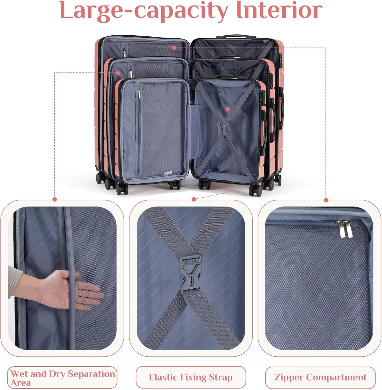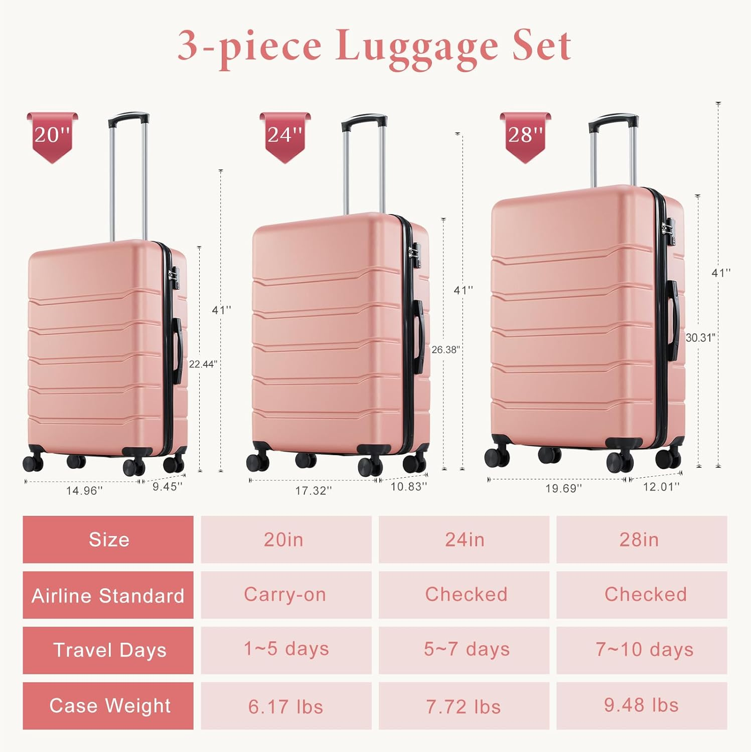 【Flexible Rolling Luggage】Equipped with 360° swivel universal wheels that are quiet and wear-resistant, this carry on luggage is perfect for any type of flooring. The ergonomic retractable trolley bar allows for easy shifting and maneuvering, making the suitcases with wheels an essential choice for all your travel and vacation needs. 【Ample Storage】Divided into left(with expandable space) and right sections, this luggage offers convenient storage and organization options. The left side features a compartment with an integrated mesh pocket for quick access to small items, while the right side is equipped with an X-shaped protective belt to keep your clothes secure and neatly organized throughout your trip. 【Premium Materials】Crafted from top-quality ABS material, the outer shell of this luggage is robust, wear-resistant, and scratch-resistant, offering superior anti-drop and anti-pressure capabilities to prevent deformation. The interior lining is made of durable polyester fabric, ensuring a neat and attractive appearance. The high-quality metal double trolley bar is lightweight and sturdy, light weight and not easy to bend. 【Secure & Stylish】 This suitcase is both reliable and fashionable, featuring a TSA lock, increased security and convenience. The zipper closure ensures effortless closing. The surface of the suit case shell has a small grain texture with multiple horizontal stripes, simple and beautiful. 【Lightweight & Effort-Saving】The luggage complies with most airline carry-on baggage regulations. Lightweight, with side and top handles for easy access and storage. Expandable double trolley bars 3 height adjustments, more height options, convenient for you to find the right height. Product Description