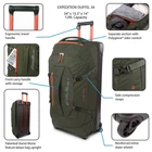 Description Lightweight, super durable, and easy-rolling, our Expedition luggage is built for superior performance and the long haul. Rugged polycarbonate and nylon construction keeps your gear protected, while the ultra-wide opening to the main compartment gives you easy access. Our patented Stand Alone feature keeps the duffel upright whether empty or overloaded. Ample Storage - The Expedition 34 Duffel Bag 2.0 offers ample storage with a two-section main compartment with under-lid zip pocket and a separate laundry compartment with Polygiene odor control. The patented Stand Alone feature ensures the duffel remains upright whether empty or loaded. Smooth and Easy Transit - The ergonomic retracting telescoping handle and reinforced inline skate wheels provide smooth and comfortable transportation, even on rough terrain. Comfort and Durability: The Expedition 34 Duffel Bag 2.0 has integrated compression straps that eliminate loose strap ends, making it perfect for large loads and 2 plus weeks of travel. Travel Friendly Dimensions - 34" x 15.5" x 14", Volume: 129L - Our travel ready duffel bag features a secure under-lid zipper closure, keeping your belongings safe during your journey. This travel duffel is sturdy and easy to haul over cobblestone streets and carry up stairs in hotels. Sustainable Gear - combines its adventure-driven innovation with sustainability and inclusivity, using materials and methods that minimize impact, and building an outdoor culture open to everyone. We believe the outdoors is for everyone and our mission is to inspire and enable all people to get outside and enjoy nature.