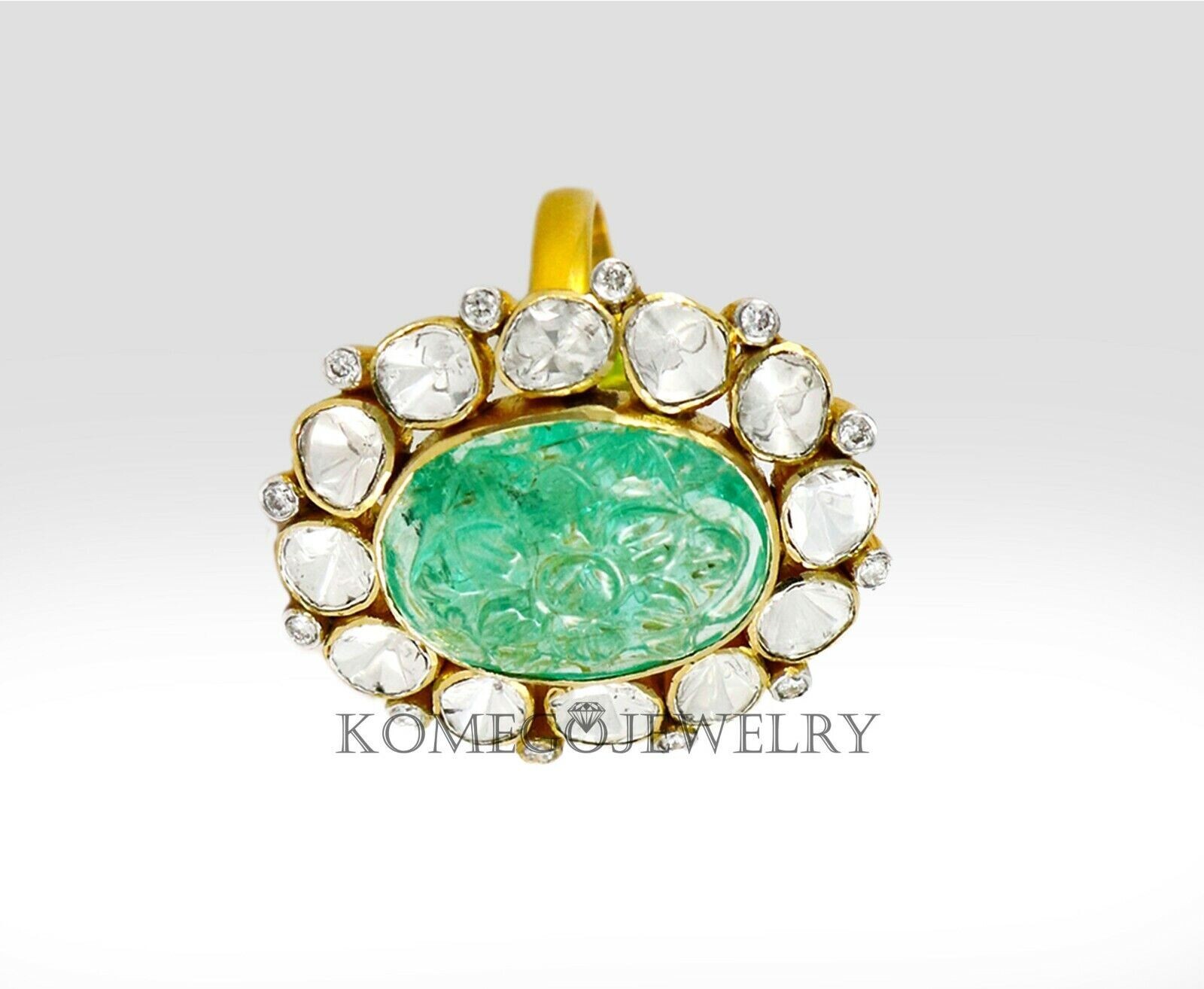 Exquisite Carved Natural Emerald Gemstone Cocktail Ring with Polki Diamond Slice