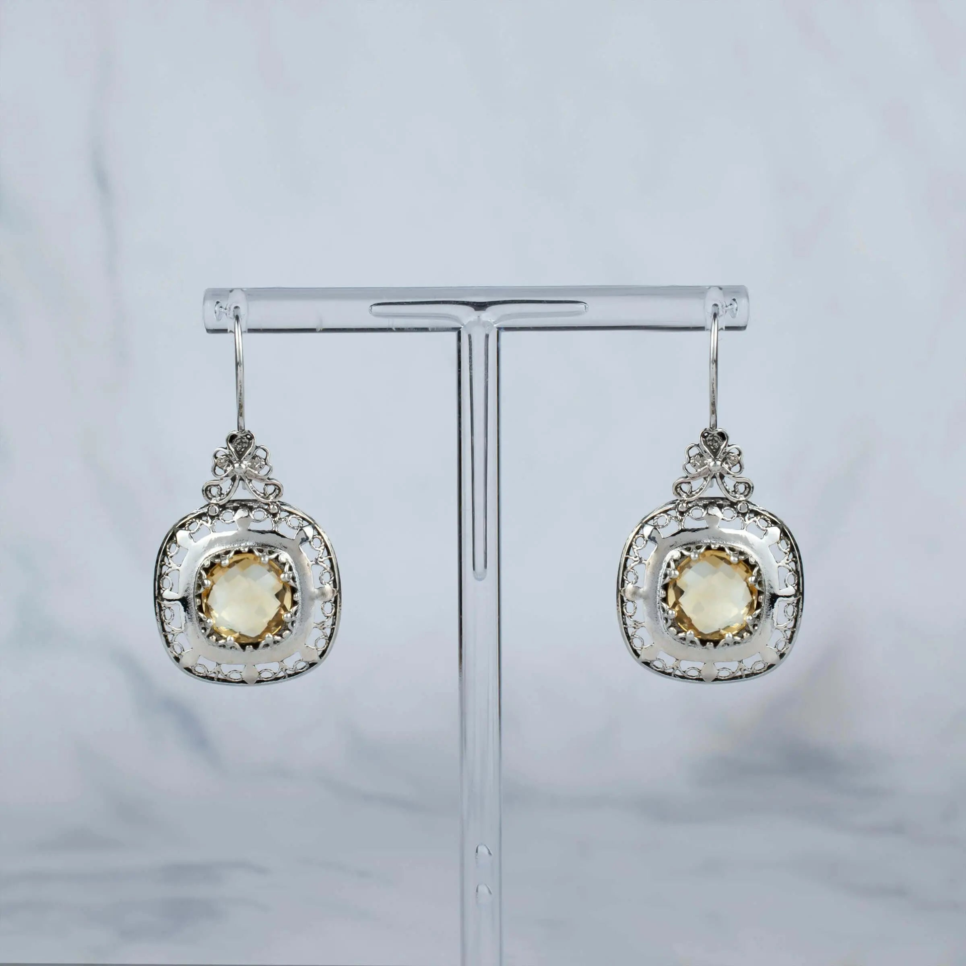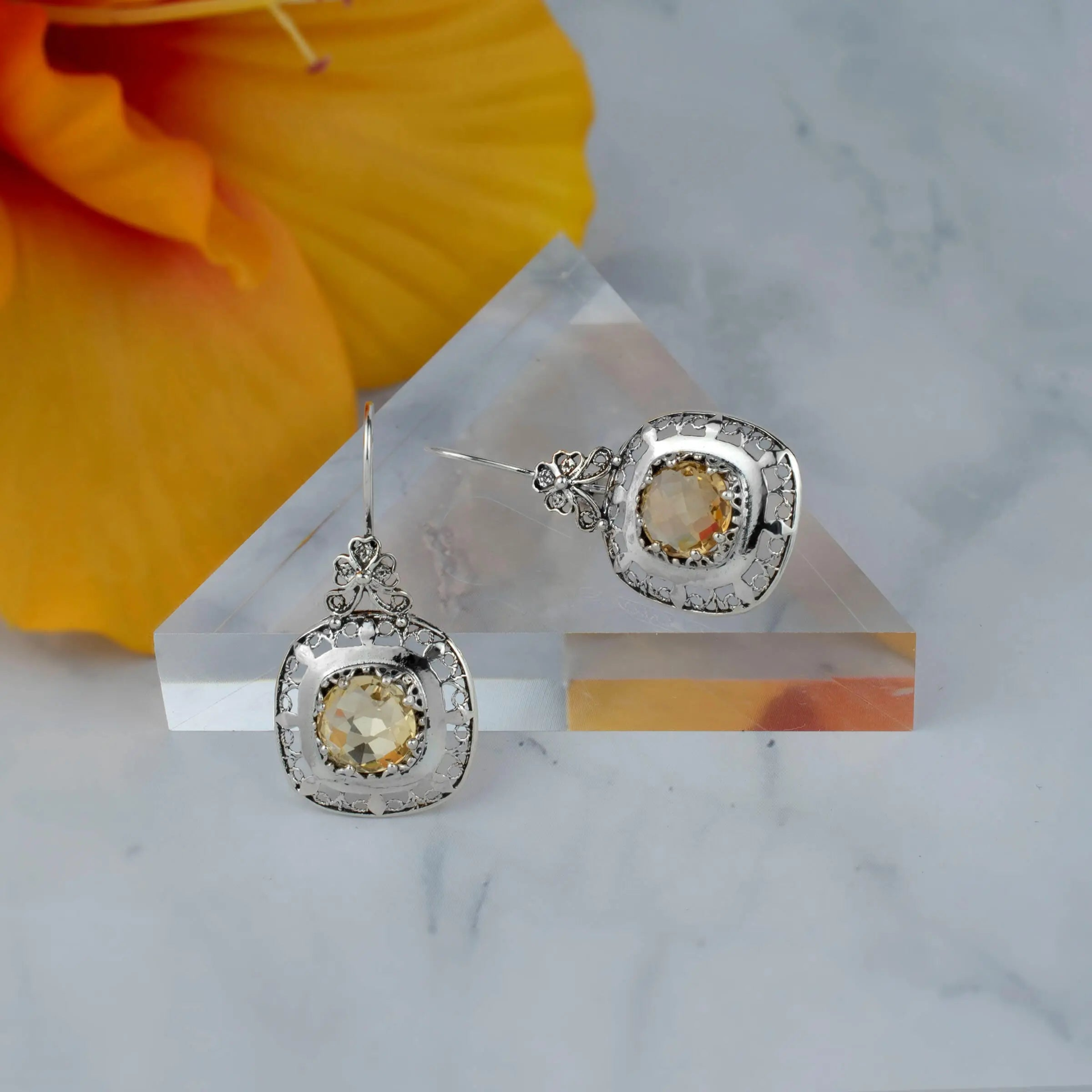 Make a statement with these stunning sterling silver filigree art drop earrings featuring a gorgeous Citrine gemstone. The Citrine gemstone is a beautiful and radiant golden-yellow hue that adds warmth and elegance to these earrings. Measuring at a length of 1.70 inches and a width of 0.85 inches, these earrings are sure to catch the eye. Crafted from high-quality 925 sterling silver, these earrings have been oxidized and highly polished to achieve a unique and sophisticated look. The intricate filigree art design showcases the expert craftsmanship and attention to detail that went into creating these earrings. Each order also comes with a silver polish cloth, velvet pouch, and a luxurious gift box for a stunning presentation. The Citrine gemstone is believed to possess powerful healing properties, promoting positivity, creativity, and abundance. It is also the birthstone for November, making these earrings an excellent gift for those born in that month. Filigree is made of delicate metal strands that have been skillfully fashioned to create an outstanding combination of old and modern art. Originating in Mesopotamia, Anatolia, this ancient technique has been utilized to create these stunning earrings. Elevate your style with these exquisite Citrine gemstone earrings, perfect for any occasion