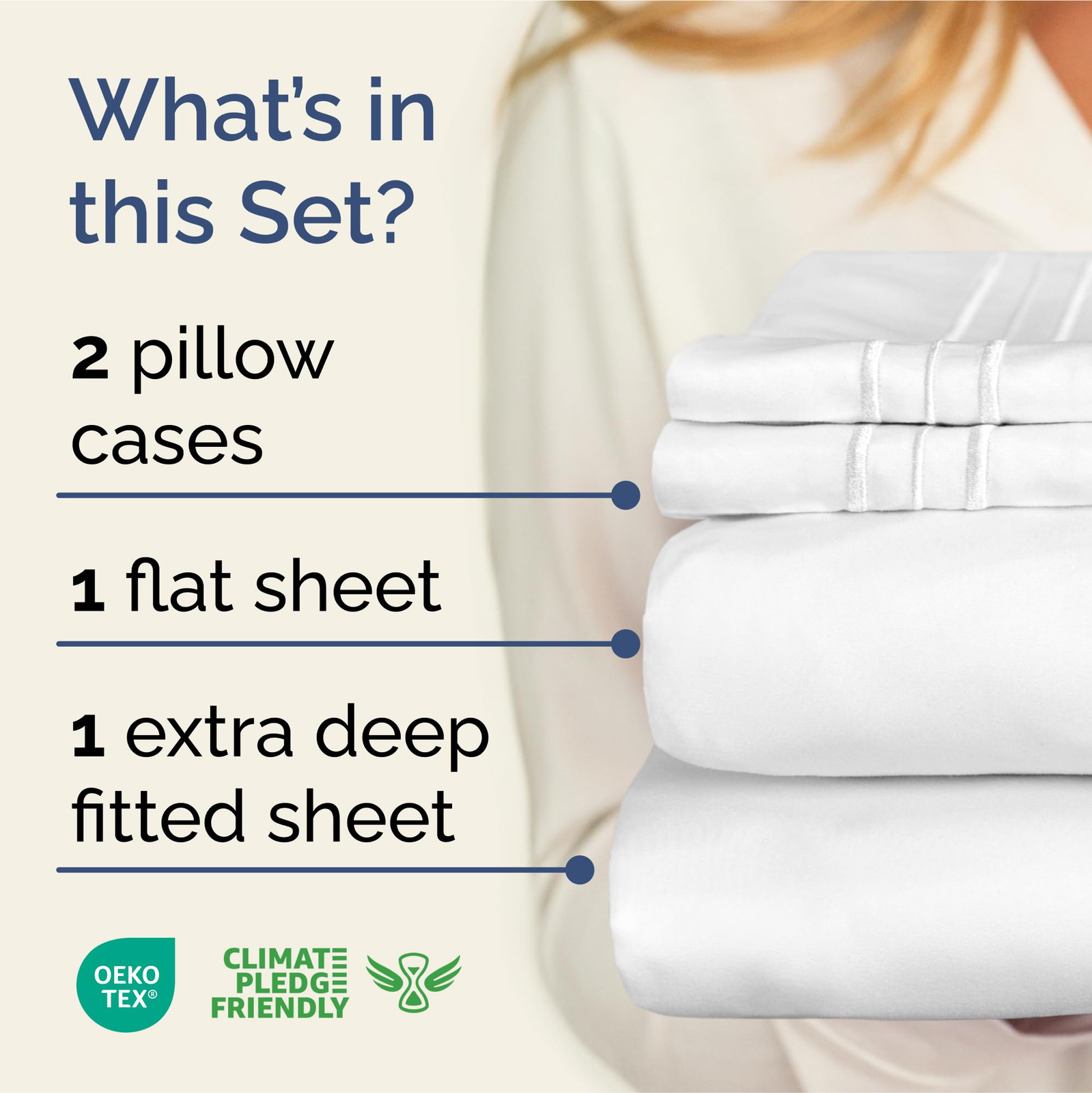 MICROFIBER: These are the softest type of microfiber bed sheets we have created. Super soft with a light feel. Not crisp like cotton. If you're accustomed to cotton sheets and you've never tried microfiber sheets we recommend you at least give these a try. They're even softer than Cotton! EXTRA DEEP POCKET QUEEN SHEETS / EXTRA DEEP FITTED QUEEN SHEETS: These bed sheets are for very deep pocket mattresses. They fit any mattress with pockets that are 18, 20, 21, 22 and 24 inches deep mattresses. There's a stretchable elastic around the extra deep fitted sheet which stretches for a nice tug around your mattress. Perfect for extra tall & large mattresses. Rest assured these oversized sheets will stay on tight & stay in place! 4 PIECE SHEET SET: This bed sheet set comes with 2 pillowcases total all with beautiful decorative embroidery design on each pillow case. The pillow cases have enclosure designs. This bedding set will accommodate your extra thick mattress perfectly. GREAT FOR DOUBLE PILLOW TOP MATTRESS: These bed sheets are perfect for mattresses with a 3 inch or 4 inch topper on top, memory foam toppers, big mattress pads, pillowtops, foam toppers, big foam toppers, pillow top mattresses and memoryfoam. These sheets will not come off and they will stay on! DIMENSIONS & SIZES: Flat Sheet 95 wide and 102 long. Fitted sheet 60 wide and 80 long with 21 inch pockets (has elastic so it can stretch). All two pillow cases are oversized 20 x 30 inch.