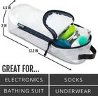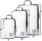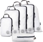 IMPORTANT: These sets are sold at discount because white fabric may contain blemishes or light staining. Sets are otherwise 100% functional and warrantied. PACKING CUBES MAKE TRAVEL EASIER -Compression cubes help you with packaging your clothes for upcoming trips by compressing the air out of them. Save up to 30% more space in your suitcase! LUGGAGE ORGANIZER - Keep different outfits in separate compression cubes and always be ready for what’s next! Easily pack away clothing like raincoats/heavier jackets that are not used as often. HOW MUCH DOES EXTRA LARGE SET HOLD? Extra Large packing cube holds approx 3 Mens Large Tshirts, Large puffy jacket, 2 long sleeve large shirts, one pair jeans, one pair mens pants. Large compression cube holds 2 mens tshirts, 1 pair mens pants, and 2 long sleeve shirts. Small compression cube holds about 8 womens shirts. Tube cube holds electronics, toiletries, underwear or swimsuits. Laundry bag is great for dirty clothes or shoes. USE EXPANDED OR COMPRESSED - Use these like normal packing cubes when you need to pack more. Packing less? Use the compression zipper to save even more space! Extra Large Dimensions Compressed size: 15.7x11x4in Large Dimensions Compressed size: 14x10x1in Expanded Size: 14x10x4in Small Dimensions Compressed size 10x7x1in Expanded Size: 10x7x4in NOTICE: These compression Packing Cubes may have some light staining on the white part of the bags from the handles. They are still 100% functional and warrantied.