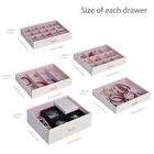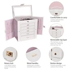Clean lined, sleek, contemporary designed jewelry box. Sturdy construction. It measures 12.00"L x 6.70"W x 12.75"H when closed. Comes in a white PU leather finish. Exquisitely hand-lined in pink suede fabric. Top lid has a large beveled glass mirror nestled inside. The removable top section has 2 compartments, each size is 7.25”L x 2.625”W x 1.125” H, and one compartment has 3 suede lined ring slots. 5 removable drawers for maximum jewelry storage. The deeper bottom drawer has only one compartment. Its size is 7.31"L x 5.81"W x 2.25"H. The other 4 drawers have the equal size. Their size is 7.31"L x 5.81"W x 1.00"H. Drawer 1 has 20 equal size compartments; Drawer 2 has 12 equal size compartments; Drawer 3 has 4 equal size compartments; Drawer 4 has just one compartment. 2 swing out cabinets, each with 8 necklace hooks and 2 storage ledges. Weight: 8 lbs 10 oz. One year warranty.