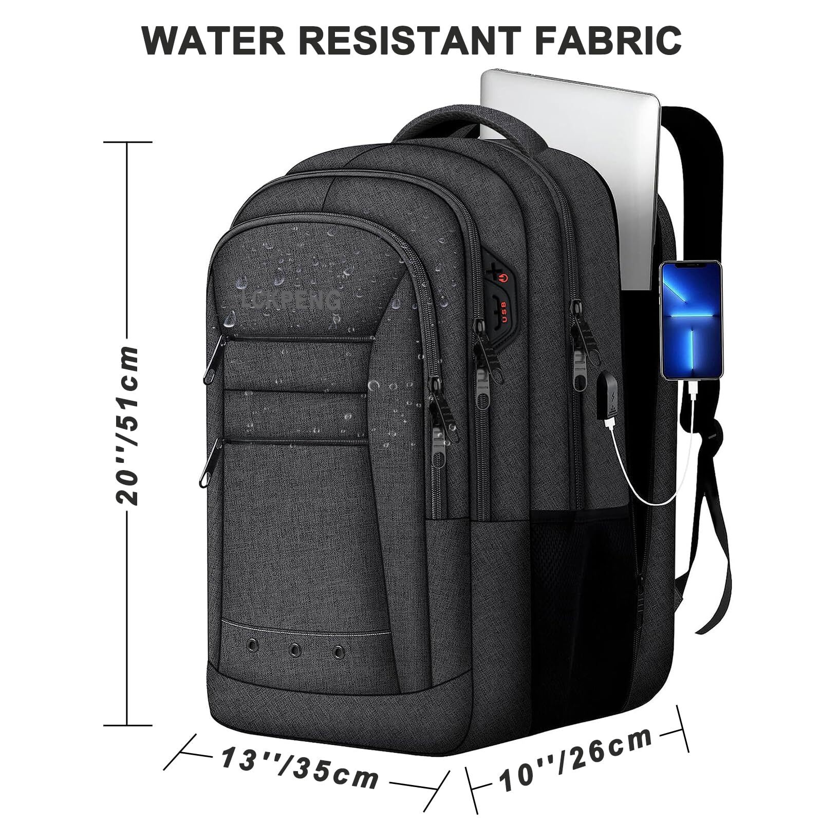 100% LIFETIME PROMISE,LOTS OF STORAGE SPACE&POCKETS: 17.3 Inch Laptop backpack has one separate laptop compartment that can hold 17 Inch,15 Inch and 13 Inch Laptop. Large travel backpack for men and women includes a spacious packing box can meet daily needs, high-tech electronic accessories. Front compartment provides many pockets,makes your item organized and easier to find USB PORT: practical design with the USB charging port can provide the convenient access to charge your electronic device that connecting your device with your own cable outside and your own power pack inside. (Tips: power pack is not included) FUNCTIONAL&SAFE: Travel laptop backpack has a luggage strap that allows the large laptop backpack fit on luggage/suitcase, slide over the luggage upright handle tube for easier carrying. There is a hidden anti-theft pocket on the back, which can protect your valuables from thieves. Suitable for international air travel and one-day tour COMFY & STURDY: Comfortable airflow back design with thick but soft multi-panel ventilated padding, gives you maximum back support. Breathable and adjustable shoulder straps relieve the stress of shoulder. The top handle of the 17 inch travel backpack is padded. The backpack is tested and designed for a very long time CONVENIENT STORAGE: Laptop backpacks front side zipper pockets, easy for holding a water bottle, readers and a bunch of other items, iPad, journal, pens and pencils, iPhone. Notebook Computer Bag Side pocket accommodates compact umbrellas and other small items