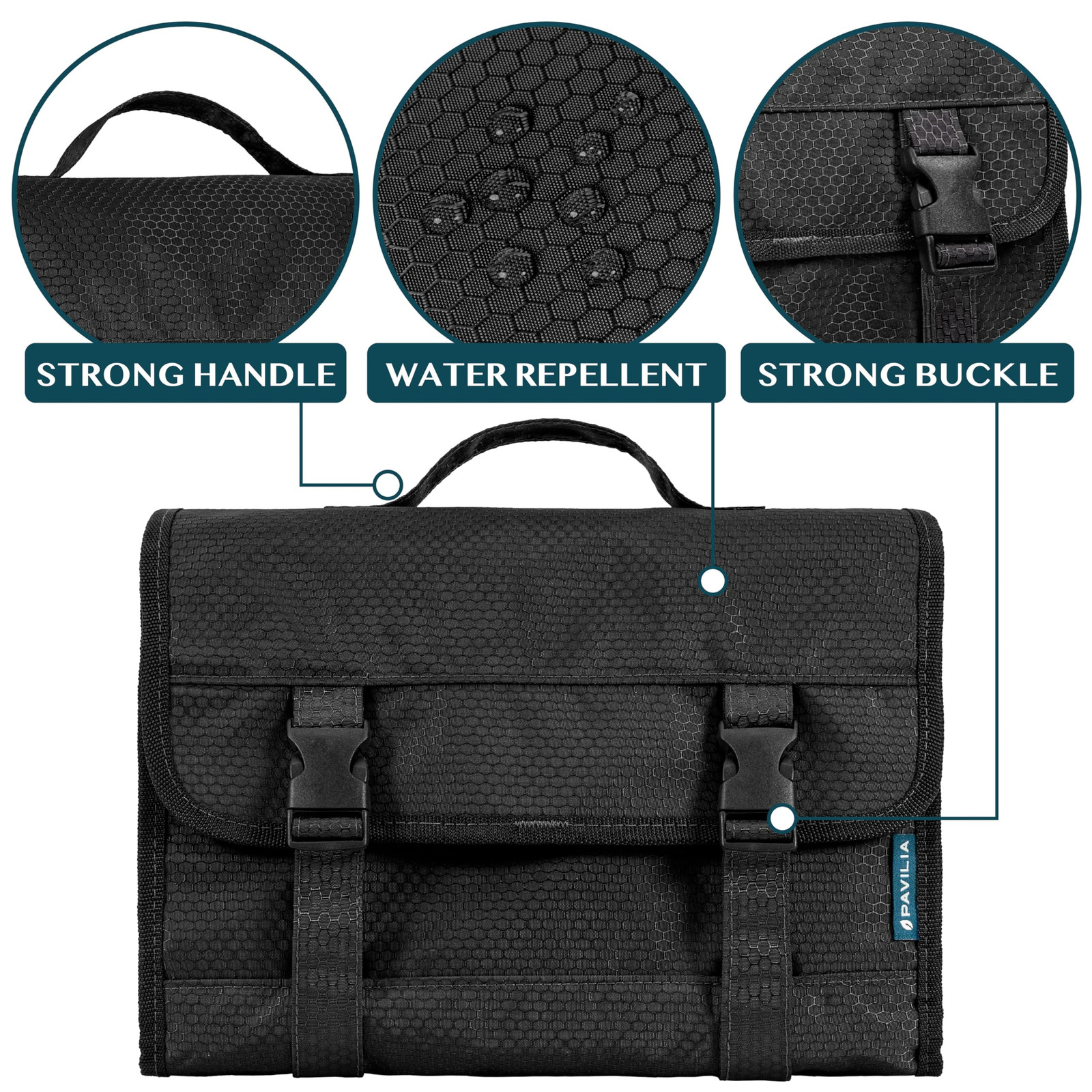 FOLDABLE TRAVEL TOILETRY BAG: large travel bag toiletry organizer case has a 4 main compartments to fit all your travel toiletries containers, makeup, and cosmetic bottles. Zipper pocket in front holds essentials when the toiletry bag is folded. Roll up waterproof pockets can fit skincare cream, shampoo, make up brush, toothbrush and wet items. This is a travel must have for vacation, flying, gym, cruise, and home. Large size at 14x9x2 inches (LxWxH), Size Unfolded 14x26x1 HANGING COSMETICS TRAVEL BAG ORGANIZER: This toiletry bag for women has a hanging hook and multiple pockets that help you stay organizer during business trip, vacation travel. The hanging hook makes it easy to hang the toiletry bag to bars in the hotel shower bathroom. Unzip your toiletry bag to reveal compartments to organize your shampoo, skincare face hygiene products. This toiletry travel bag is an essential accessory for cruise in Europe, plane, Hawaii Trip, and honeymoon. PADDED MAKE UP BAG KIT: The toiletry case bag for men has foam padding that protects toiletries container, shampoo bottle during flying, roadtrip, and plane. The toiletry bag kit also has elastic bands that secure makeup brush, face spray, lipstick, shaving razors. One waterproof compartment for wet toiletries. Clear pockets let you see all essentials clearly and is tsa approved. This large hanging toiletry bag holder for women will protect all gear, cosmetics, and travel gadgets. PACKABLE TOILETRY BAG GIFT: Large and portable, this compact hanging toiletry bag is perfect for business trips, traveling, gym shower, camping, dorm, home use. Easily fit this in any luggage and suitcase. This is a great travel toiletry gift set for travelers, women, men, flight attendants during Birthday, Christmas, holidays, and vacation. Also makes a great gift for mother, father, friend,wife and husband gift during Valentine Day. EASY TO CLEAN: Simply wipe clean with damp cloth to maintain the toiletry bag travel bag. With its water resistant polyester fabric and waterproof compartment, this travel kit for women keeps your travel-size item, shampoo, conditioner, lotion, face wash, medicine, toothpaste, toothbrushes, hair brush and daily makeups protected and organized for every trip, cruise, flight! A must have for every travel packing list!