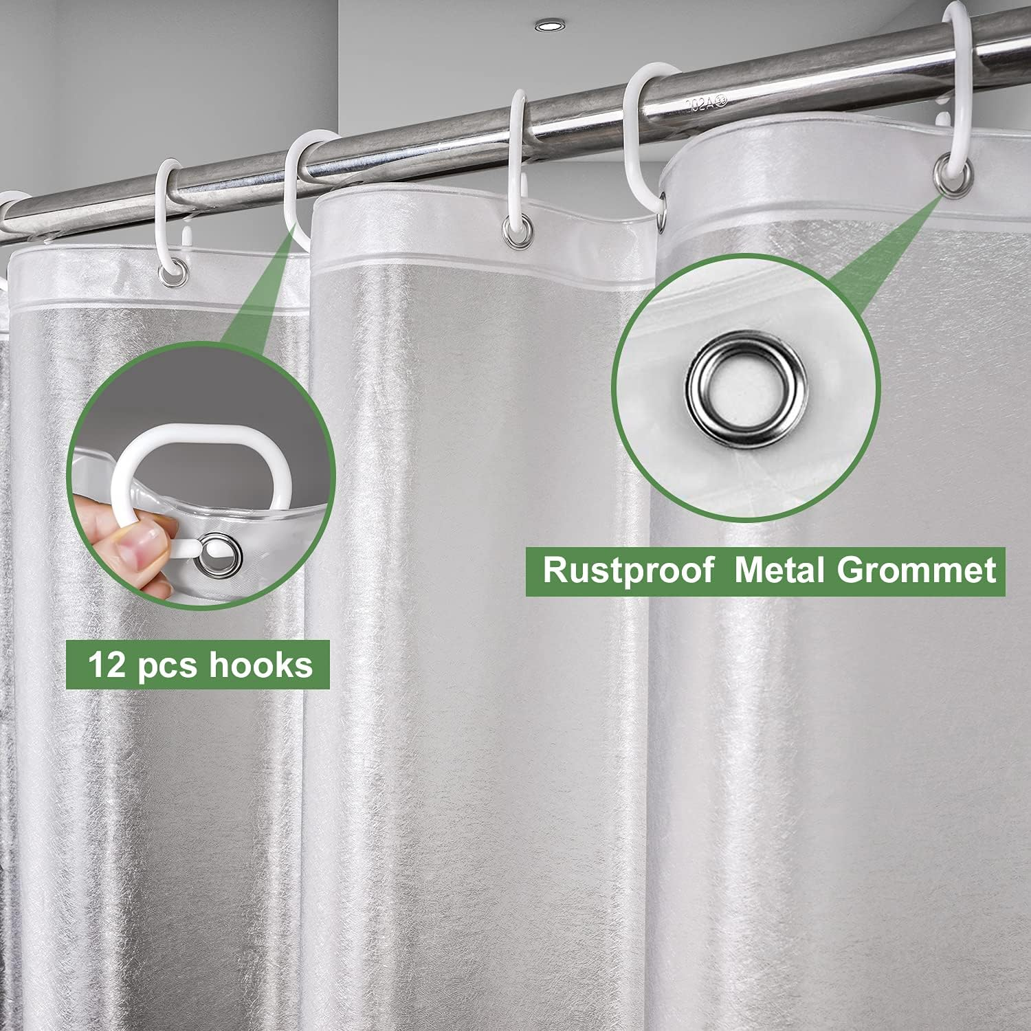 Pattern and Size:The extra long shower curtain liner is like silk pattern, frosted ,Semi transparent,Shower curtain measures 72" width x 86" length,shower curtain 86 inches long,suitable for long bathtub and shower area Metal grommets and Weighted Magnets:The weighted shower curtain liner has 12 metal grommet holes to hang standard shower hooks. There are 3 big weighted magnets at the bottom to keep the frosted shower liner sticks to the tub's side High Quality 100% EVA Material:The shower stall curtain liner is made of 100% Premium EVA plastic material, which is heavy ,thick, durable Create a Good Bathroom Environment:The weighted shower curtain liner Keep the bathroom clear and separating wet and dry in the bathroom.Creating a warm and romantic bathroom environment Easy Installation and Easy Care:The high quality metal grommet holes promote easier hanging and long-lasting use.e asy care, wipes clean with a damp cloth. Not machine Washable Product description WELCOME TO UFRIDAY With a professional design team ,ufriday is committed to providing customers with high-quality shower curtains and services.Shower bathroom is the most important place in our home. You can get rid of the tiredness, enjoy the cleanness and relaxation,be the best choice for your home to get this elaborate shower curtain from Ufriday. Heavy-duty 5 bottom meganets and rust-resistant grommets. Made using water-repellent and high-quality EVA. 3D frosted touch create an elegant look. Dry faster , hassle-free clean. Translucent shower curtain Liner Bring light and cleanliness to your bathroom, But protect your privacy, Enjoy your bath time to the fullest. Weighted Shower Curtain Liner 3 big magnets at bottom can keep the liner in place, making the item get weight to prevent the water from leaking out, therefore adds its versatility. Waterproof Shower Curtain Liner EVA, which are made to withstand moisture-rich bathroom environments. Firm yet smooth texture promotes water bead formation and easy to care for. Frosted Shower Curtain Liner 3D EVA Shower Curtain Liner Heavy Duty, Clear, with 3 Big Magnets Having A Great Showering Time!