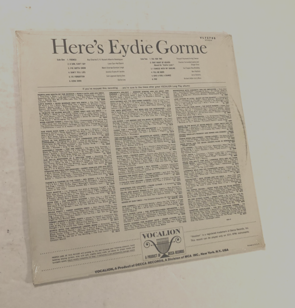 Dive into the nostalgic melodies of Eydie Gorme with the vintage 1963 LP "Here's," catalog number VL 73708, brought to you by Vocalion Records. This gem of a record, pressed on high-quality vinyl, promises to deliver the quintessential audio experience of the 1950s and 1960s. Immerse yourself in the timeless charm of Gorme's vocal prowess, elegantly presented in a cardboard sleeve, reflecting an era of authentic musical expression. Complete with the original cover, this LP encapsulates the essence of a bygone era, offering a rich auditory journey through the use of the classic 33 RPM speed and stereo audio channels. Whether you're a dedicated collector or a music enthusiast, the record's excellent grading and the artist's enduring appeal make for an exceptional addition to any collection. Sale conditions for all new/old stock vintage (20+ years) still-sealed record albums only *Please read the condition description carefully. *Visual grading only, to the best of my ability. *No returns accepted on all sealed albums if opened or shrinkwrap removed. *All returns must be in same condition when received. *All sealed albums are listed and sold as collectible, investment, and/or future PSA grading, and not as a playing copy. *For playing and enjoyment, I recommend an excellent to near mint copy. *I will list only albums that is in decent condition and playable for listening. *Please note: (New and sealed only) Album cover with minor creases, and flaws such as dented and/or creases corners, shrink-wrap with partial tears, and ring wear are possible. *If you have any questions or concerns before buying, feel free to contact me. Thank you. Vintage 60s Vocalion Records VL 73708 Stereo Eydie Gorme "Here's Eydie Gorme" (1963) LP Condition: New. Old stock. *This was recently pulled from storage after 35+ years of collecting. See photos provided for more details and condition.