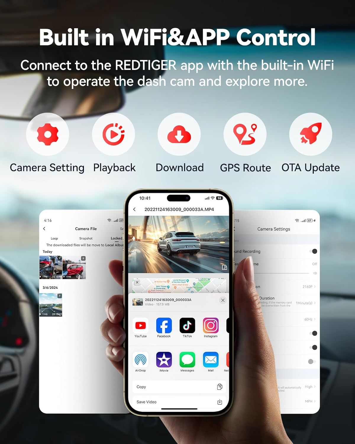[4K+1080P Dual Dash Cam] Universal car dash cam with FHD 1080P rear and 4K super HD front cameras. The REDTIGER F9 dash cam front and rear camera captures in-depth footage while driving thanks to its F1.5 aperture, excellent night vision, and 170°wide angle. [Smart APP Control and WIFI GPS] For real-time video, recorded video playback and GPS information, connect to the REDTIGER app with the built-in WiFi(Within five meters). Instead of using buttons, you can effortlessly control the dash camera with the app. [G-Sensor and 48H Parking Mode*] When the G-sensor is triggered, video files are automatically saved and locked. This REDTIGER dash camera for cars can record even while parking with a 48-hour parking monitor(*Extra hardwire kit needed), which keeps the automobile secure. [Loop Recording and 32GB Card] REDTIGER dashcam front and rear camera comes with a 32GB card and support up to 256GB cards. When the memory is full, the oldest video is automatically overwritten to make room for fresh recordings. [User-Friendly Design and Features] The F9 dashboard camera will automatically turn on while you are driving thanks to a super capacitor. The one-click lock and unlock video function and a unique bracket design make the REDTIGER dashcam easy to use and remove. Product Description The video showcases the product in use. The video guides you through product setup. The video compares multiple products. The video shows the product being unpacked. Two Parking Monitor Modes-Parking in Security Collision Emergency Recording After parked, the dash cam automatically starts to record when a sudden collision is detected and lock the footage.(Hardwire kit needed-B09WCTZ3Y8/B0CF54C4NK) Setting Steps 1.Set Collision Sensing Sensitivity-Low/Middle/High 2.Collision Boot Recording-On 3.Time-lapse Redcording-Off 24/48H Time-Lapse Recording After parked, the dash camera records at very low 1fps per second, no events will be missed and no capacity is wasted.(Hardwire kit needed-B09WCTZ3Y8/B0CF54C4NK) Setting Steps 1.Set Collision Sensing Sensitivity-Low/Middle/High 2.Collision Boot Recording-Off 3.Time-lapse Redcording-12H/24H/48H How can I view videos without a screen? This dash camera has a built-in WiFi that allows you to connect to REDTIGER app. Please download the app and connect to WiFi so that you can view real-time videos or replay them on the app. You can also palayback the videos on REDTIGER GPS Player(PC) How does built-in wifi work? How do I connect dash cam to my phone? Please download REDTIGER APP and connect to REDTIGER F9 WiFi to add camera, if you still have questions, please just contact the 24/7 Redtiger support team. I want to use the parking monitoring function, how to buy a separate hardwire kit? You can search for B0CNPHCJZB to purchase this hardware kit or consult our support team. How can I adjust the settings for this car camera? Please connect to F9 dashcam's WiFi and use the app to adjust the settings. You can also modify your WiFi password in the settings. How do i know if the dash camera is recording? The dash cam has a status light. This status light will flash during normal recording. If it remains on, it indicates that recording has stopped. REDTIGER,CAM GOOD! Add to Cart Add to Cart Add to Cart Add to Cart Add to Cart Add to Cart Customer Reviews 4.2 out of 5 stars 1,223 3.9 out of 5 stars 16 4.4 out of 5 stars 148 4.2 out of 5 stars 80 4.3 out of 5 stars 805 4.3 out of 5 stars 1,816 4.2 out of 5 stars 13,300 Price $67.99 $ 67 . 99 $149.99 $ 149 . 99 $99.99 $ 99 . 99 $99.99 $ 99 . 99 $169.99 $ 169 . 99 $149.99 $ 149 . 99 $129.99 $ 129 . 99 4G LTE ✘ ✔ ✘ ✘ ✘ ✘ ✘ Video Resolution 3840*2160P+1080P 2560*1440P+1080P Front 4K/2.5K/1080P Front 2160P/1440P/1080P 3840*2160P+1080P+1080p 3840*2160P+1080P 3840*2160P+1080P Screen Size ✘ 3" IPS Screen 2.2" Touch Screen 3.18" Touch Screen 3" Screen 3.18"Touch Screen 3.18" Screen Wi-Fi(APP Control) ✔ ✔ ✔ ✔ ✔ ✔ ✔ GPS ✔ ✔ ✔ ✔ ✔ ✔ ✔ Mounting Type Adhesive Mount Adhesive Mount Adhesive Mount Adhesive Mount Adhesive Mount Suction Mount Suction Mount Memory card included 32GB Card Included 32GB Card Included 32GB Card Included 32GB Card Included 64GB Card Included 64GB Card Included 32GB Card Included Storage/Battery 256G Max, NO battery 256G Max, NO battery 256G Max, NO battery 256G Max, NO battery 512G Max, NO battery 256G Max, NO battery 256G Max, NO battery Charging Type-C Port/,DC12V/24V, 2.5A Type-C Port/,DC12V/24V, 2.5A 256G Max, NO battery Type-C Port/,DC12V/24V, 2.5A Type-C Port/,DC12V/24V, 2.5A Type-C Port/,DC12V/24V, 2.5A Type-C Port/,DC12V/24V, 2.5A