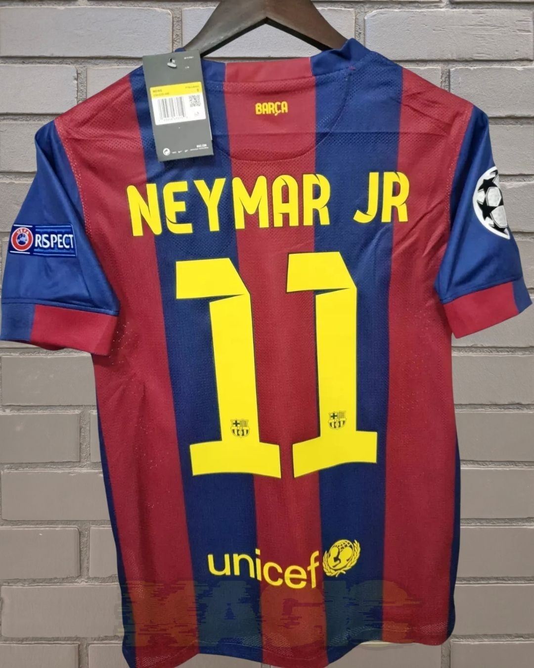 The FC Barcelona 2014-15 Home Blue Red Short Sleeve UCL Final Jersey Neymar Jr #11 is a Nike-branded soccer jersey featuring Lionel Messi for FC Barcelona fans. Made in Thailand, this jersey in multi-color design is perfect for men who want to show their support for the team. With a capacity of 8 oz, this official team jersey is a must-have for any fan looking to represent their favorite club in style. Shipping: Free shipping worldwide Processing within 2 business days Get it delivered within 5-10 Business days. Tax free: All taxes are covered, what you see at checkout is the final price you pay. Returns: We got you covered, Simply reach out to us within 30 days of delivery for a smooth solution. Take care of your jersey: Wash: Inside out, cold water (30°C max), and a delicate cycle. Detergent: Mild liquid only; no fabric softener or bleach. Dry: Air dry only on a hanger. Never use a dryer. Iron: Steamer only, or iron inside out on the lowest heat with a towel barrier. Storage: Hang it up to avoid creasing the logos/printing.