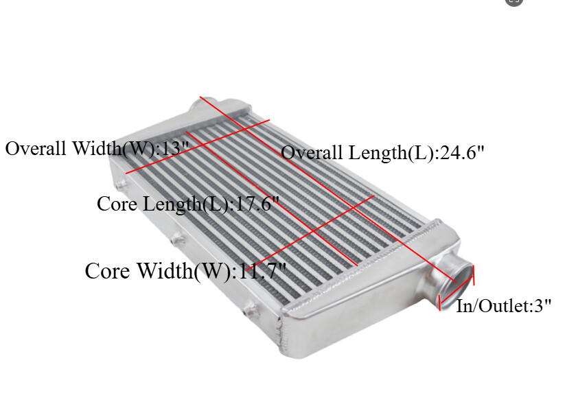 Product Description: Here is a universal 25 "x13"x3 " turbo intercooler + 3 " pipe kit . Made of high-quality aluminum, durable and suitable for long-term use. It is perfect for all turbocharged cars, upgrades and replacements. More importantly, a professional installation is strongly recommended, and modifications may be required. Intercooler: Inlet / Outlet Size : 3 " Core Size : 17.6"x11.7"x2.8" Full Size: 24.6 " (L) X 13 " (W ) X 3.3 "(H ) Pressure drop: 2~5psiat35psi, 0.2~0.5psiat15psi Made of Aluminum, Light weight designed. (Increase 10-20 HP). Compress Air Flow Rate<350Cubic Feet/Min, Rated up to500 Max HP Applaction: Universal (Please take correct measurements to make sure it will fit in the location) Piping Kit: Made of aluminum, pipe thickness: 1/16 Inch (1.58 mm). 3 inch diameter piping kit with high quality silicone couplers and T-bolt clamps. The couplers will not split easily, the clamps will not strip like the cheap kind. Package Includes: 1 x 24.6"x13"x3.3" Intercooler 1 x 3" pipe kit Note: 1. No installation guides are included, we highly recommend seeking a professional installer. 2. Universally fits any vehicle and turbo project. 3. Please measure the area where the intercooler is planned to mount on to see if the dimension of this item fits the allotted space, modification might be required for some vehicles. Shipping: 1.Product will be shipped in 1- 2 business days . 2.We ship the package to your shipping address in eBay instead of the one in PayPal. 3.We are not responsible for any wrong or undeliverable addresses. Please carefully check your shipping address before purchasing on eBay to ensure a smooth transaction Payment: We accept Paypal Visa Master card payment and so on methoods. Return: If you receive any wrong items, or damage during the transportation or defect items, we will accept the return and pay the return freight. Please kindly contact us before return, we will send you the detailed return instruction. Returns accepted within 30 days of delivery date and item must be in original new condition, not worn or altered in any way with attached tags & wrap. Otherwise deal is final. Return shipping must be paid by buyer. Feedback and Contact Us: If you are dissatisfied for any reason, please do not be quick to leave negative/neutral feedback.Before and after purchasing the product, if you have any questions or seek help, please feel free to contact us at any time.We will do our best to make sure EVERY CUSTOMER 100% SATISFIED and resolve any problem for you .If you are satisfied with the product you received, please leave us positive feedback.
