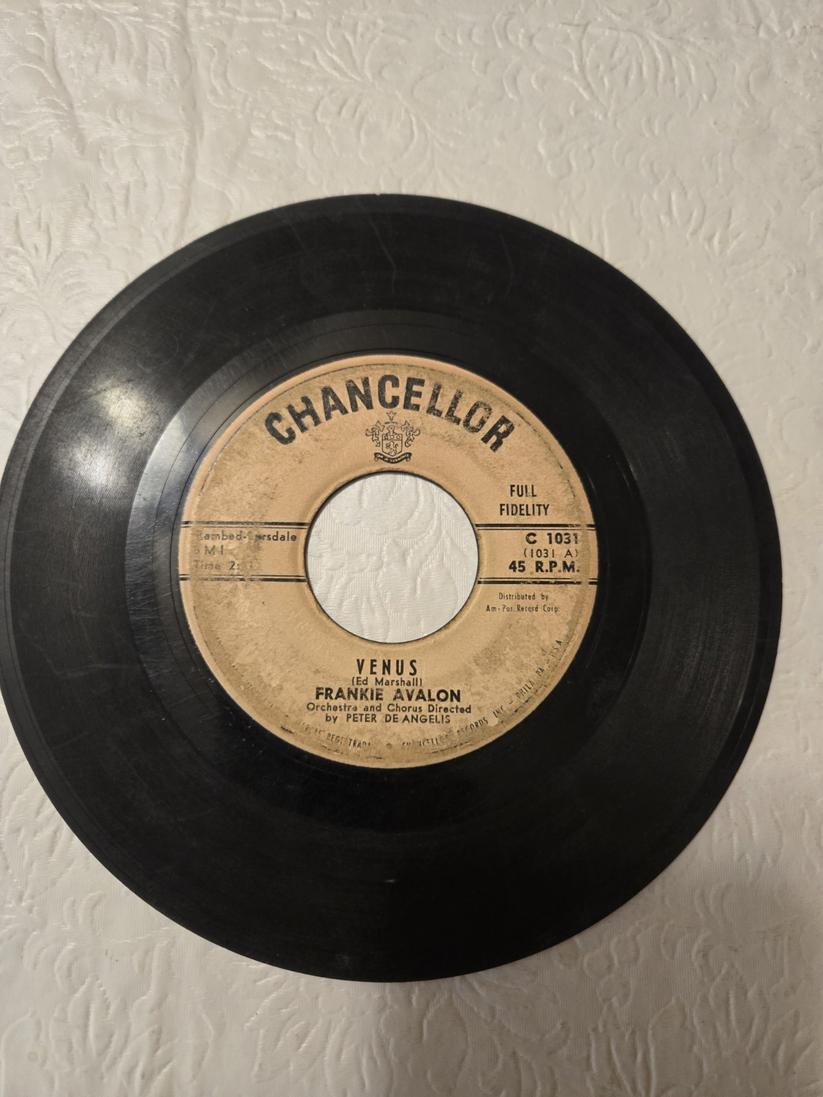 This is a vintage vinyl record single by Frankie Avalon, featuring the songs "Venus" and "I'm Broke." Released in 1959 by Chancellor on a black 7" record with a paper sleeve, this promotional edition plays at 45 RPM in mono. The record is in very good plus (VG+) condition, with the inlay and sleeve graded as very good (VG). With a pop rock style and falling under the genres of pop and oldies, this classic piece of music history represents the 1950s era of American music. A vinyl sleeve encases this single to enhance and protect the beauty of this 45 record.