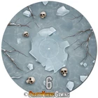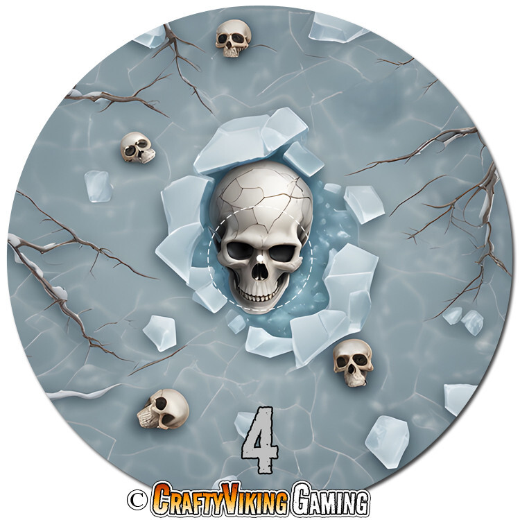 Frozen Frost Set of 6 objective markers for Warhammer 40K and Age of Sigmar 4th Edition . This set features a Frozen Frosty Landscape with skulls, trees & military debris. Numbered 1-6 40 mm (marked center circle) for simple measuring plus 3 inches to the edge Total diameter 192 mm or 7.57 inches 2 mm thin neoprene (mouse-pad) material Non-slip rubber backing Enhance your gaming experience with these high quality attractive objective markers. No more guessing if a model is in range. Thanks for shopping & happy gaming!
