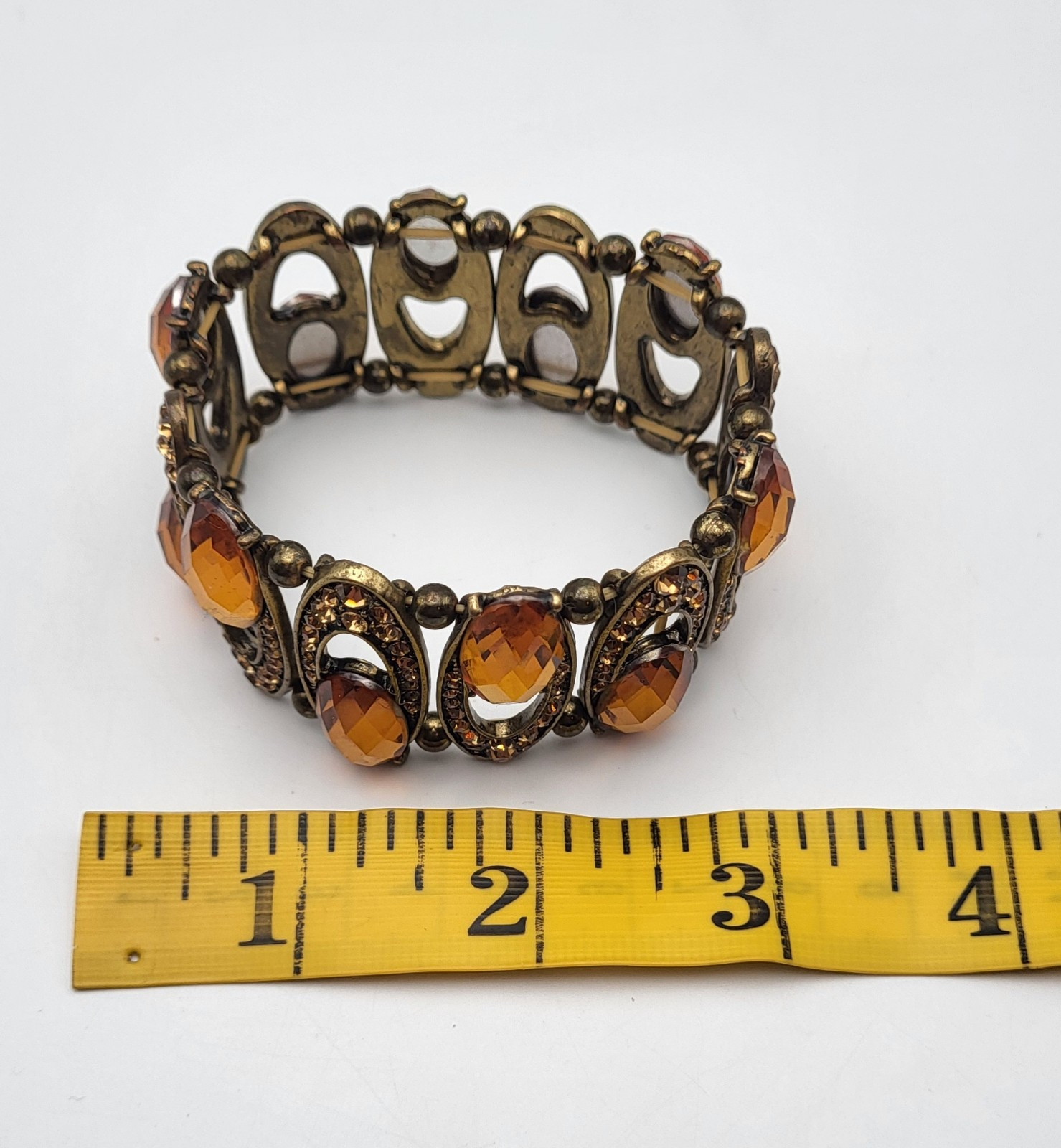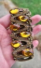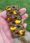 Featuring Amber and Citrine colored faceted rhinestones set in an antique brass-tone metal. These rhinestones catch the light in the most stunning way, especially outdoors in the sunlight, as seen in the last 3 photos. This bracelet is in great condition!