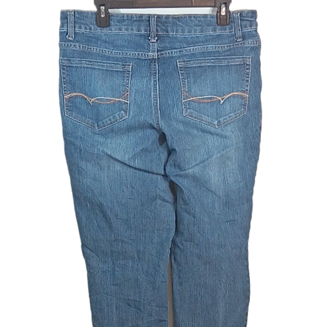 Color: Medium wash Brand: Faded Glory Fabric: 63% Cotton, 35% Polyester, 2% Spandex Soft stretch denim Size: 16 Waist: 34 inch Inseam: 30 1/4 inch Rise: 10 1/4 inch Length: Regular Mid rise jeans Zip fly, button closure Five pockets Style: Straight leg jeans C ondition: Very good Pre-owned Faded Glory straight jeans in very good condition with light wear from being washed or worn.