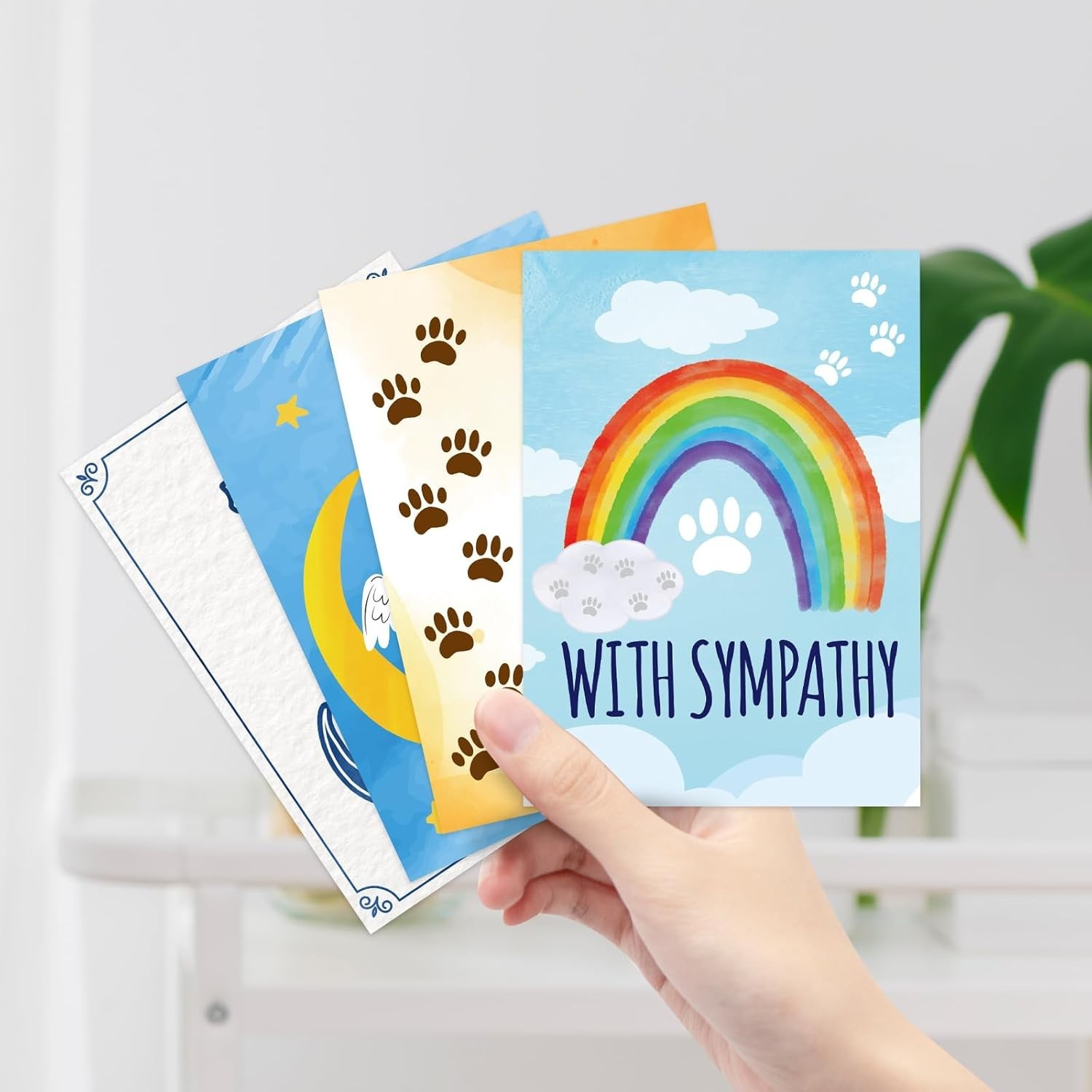 Package Includes: 18 pet sympathy cards, 18 envelopes, 36 stickers 6 Unique Designs: Sympathy cards for pets include 6 designs, featuring angel, rainbow, paw print, dog; each pet loss card includes unique message inside Material and Size: Loss of dog sympathy card are made of quality paper stock; each sympathy card measures 5 x 7 inch Loss of pet sympathy card is great choice for vets, shelters, or any dog or cat lover Pet sympathy cards are a thoughtful way to recognize any pet in your life; when family ot friends have lost a beloved four-footed family member, care for them with our warm card