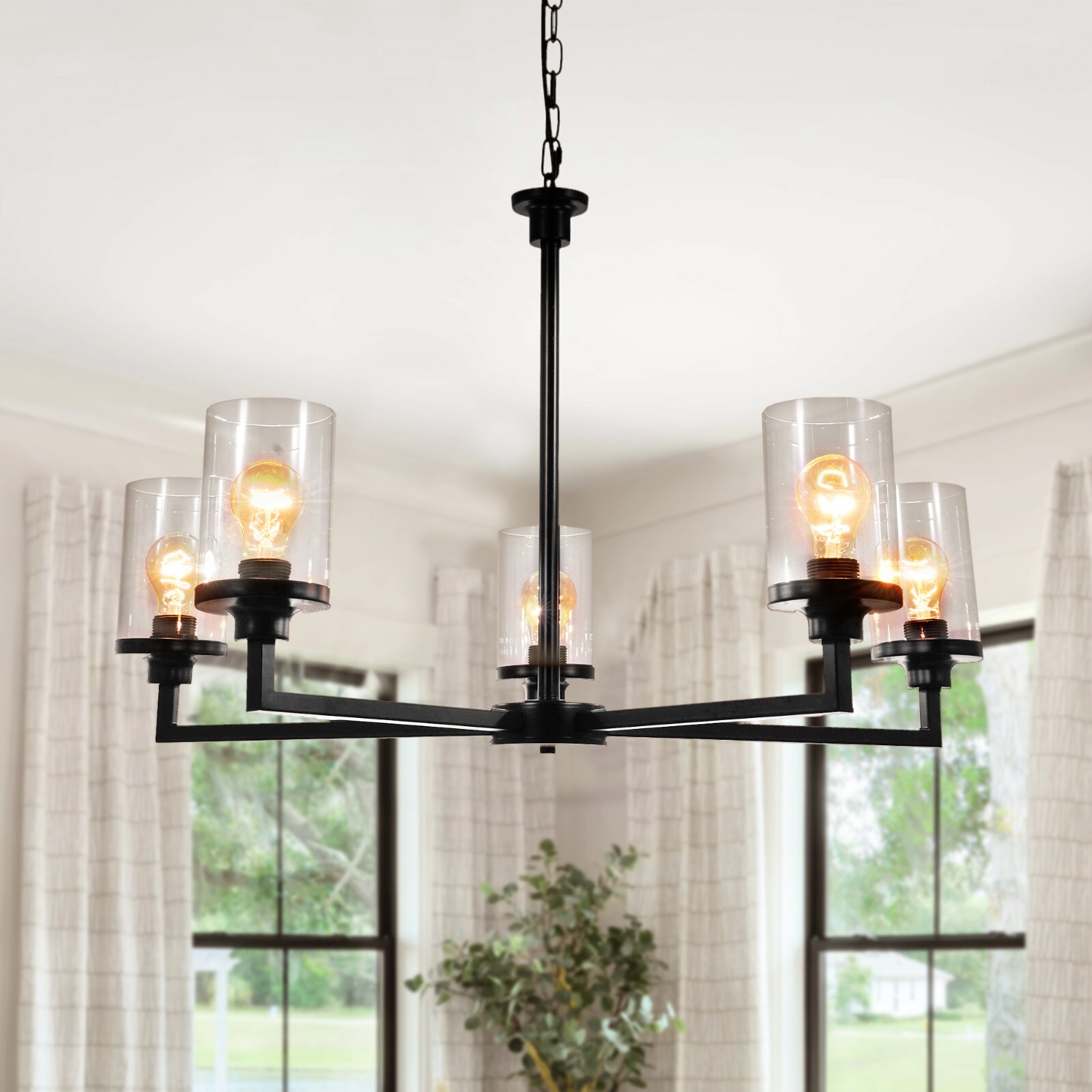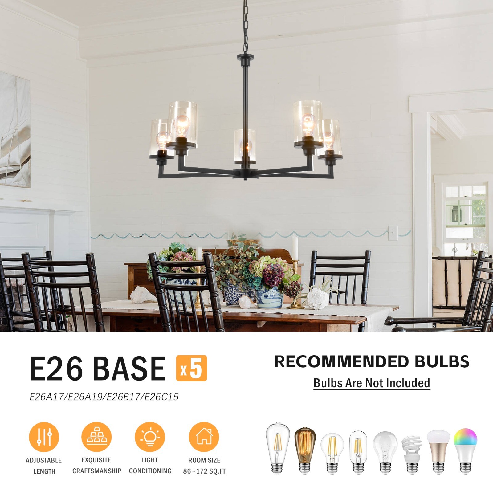 Farmhouse Chandelier Cylinder Clear Glass Vintage Black 5-Light Pendant Lamps About this item 【Farmhouse & Industrial Design】Dining room light fixture use durable black metal body and 5 Lights E26 base, offers enough lights for your home, reflecting a unique modern style. The angle-adjustable base of this black chandelier can be installed on a sloping ceiling. 【Farmhouse Light Fixtures Size】The diameter of this farmhouse chandelier is 25.5 inches, 35.3" in height after installation. The hanging chain of this farmhouse chandelier is about 23.6", can be adjusted. Center boom 15.7" . Using this farmhouse chandeliers for dining room creates warm vintage relaxing atmosphere. 【Bulb Requirements】Black dining room light fixture needs 5 * E26 base bulbs(Bulbs NOT Included). It is also dimmable when you use the dimmer switch and dimmable bulbs.(Switch Not Included). 【Wide Application】This dining room light fixtures over table is suitable for the kitchen island, dining room, bedroom, living room, rustic home,office, workshop,etc. Dining room chandelier over table is easy install, please follow the installation instruction and finish this beautiful black farmhouse chandelier. 【Our Service】After you receive the dining room light, if the foyer lighting fixtures is damaged or has other quality problems, you can contact us at any time, and we will give you a satisfactory answer within 24 hours. Specification Material: Glass, Metal Voltage: 110V Color: Black Mounting Type: Ceiling Number of Lampheads: 5 Bulb Requirements: Use E26 Bulbs, Maximum 40watts, Options Include Incandescent, Fluorescent, LED, Halogen, etc. (Bulbs Are Not Included) Packaging details 1 * light pack in foam carton box.(Neen assembly) Suggestion: Installation By A PROFESSIONAL ELECTRICIAN Assistant after sales: For any question or installation methords about the light fixture,pls contact us via ebay message firstly for help. Payment Delivery details Terms of sales About us Contact us Payment You could make payment via: Delivery details Packages will ship via by UPS or USPS within our handling time,once the package is shipped out ,normally shipping takes about 3-10 working days,but due to different cities and states,shipping time will be different. Terms of sales If you any problem about shipping information, or the item you got : Arrived damaged; Wrong item sent; Missing parts or pieces; Doesn't work or defective; Doesn't match description or photos. Pls click "Contact Seller" and send us message firstly. Then we could have a check and will take responsibility to resolve the problem with you in good communication. About us Our company specializing in selling all kinds of light fixtures,such as ceiling fans,chandeliers,crystal lights,retro lamps,pendant light,etc. If there's any light fixture you are interested,pls feel free to contact us for more details. Contact us Normally your message will be replied in 1 business day,If after 24 hours you do not receive our reply,please kindly re-send us the message,because sometimes ebay message system will have technical problem,so your message can't send to us successfully.
