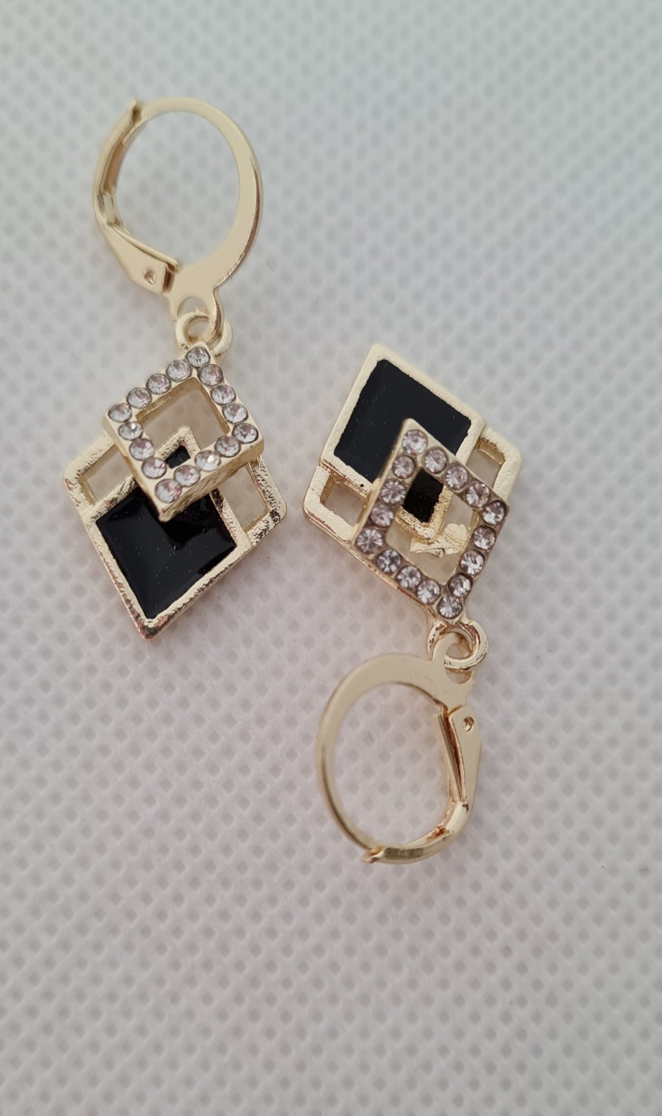 These fashion earrings feature a stylish diamond shape design in black aluminium and rhinestones, with a shiny gold colour accent. The dangle/drop style adds a touch of elegance to any outfit, making them a versatile and trendy accessory for any occasion. Perfect for adding a chic and contemporary touch to your ensemble.