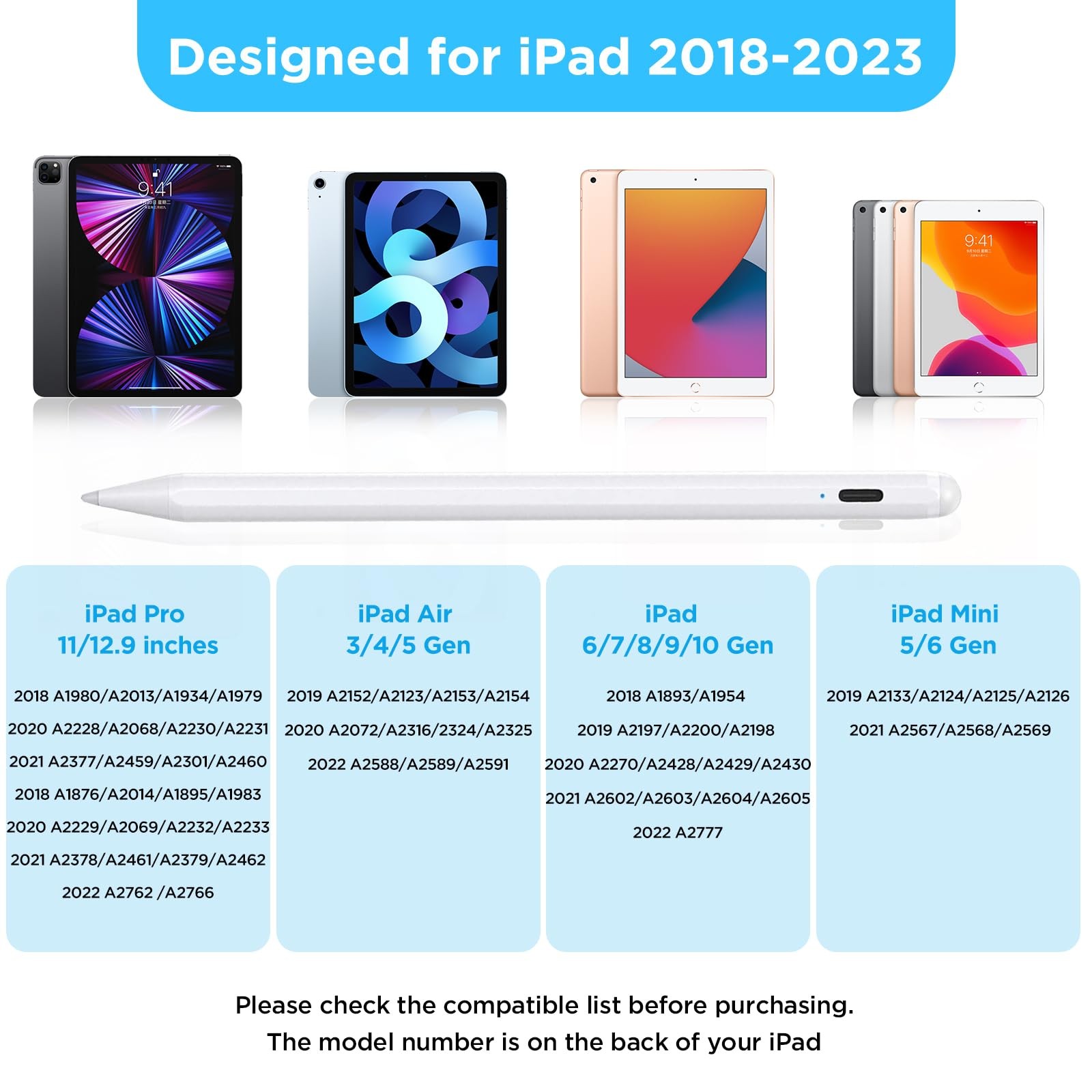 Stylus Pen for iPad, 2X Fast Charge Pencil Compatible with 2018-2023 Apple iPad, iPad 10/9/8/7/6th, Air 5/4/3, Pro 12.9/11 inch, Mini 6/5 Generation Alternative Pencil with Palm Rejection stylus pen for iPad compatible with 2018-2023 Apple iPad Pro11/12.9 inch, iPad Air 3/4/5 gen, iPad 6/7/8/9/10th, iPad Mini 5/6. It can also work seamlessly with Procreate, Notability, Sketch, and more app! Quick starting iPad pencil no Bluetooth pairing needed, ready to use out of the box. Simply hit the button and transform your iPad into a brilliant tool for creating digital art. ipad pen will simplify your digital life. High precision iPad pen with pixel-perfect precision, you can write or draw pictures as small as ants without fear of missing a single line or detail. No offsetting between where the iPad pencil is located and what's shown on the screen. Ultra-responsive iPad stylus pen whether you are virtual learning, sketching, taking notes in class, jotting down meeting notes, or signing PDFs. Extreme fluency allows there no delay between the movement of your styluses and what is displayed on the screen. Widely applications smart pencil are ergonomically designed for little kids, professional creators, business people, and students so that stop big finger bothers, truly capture the traditional pencil feeling.