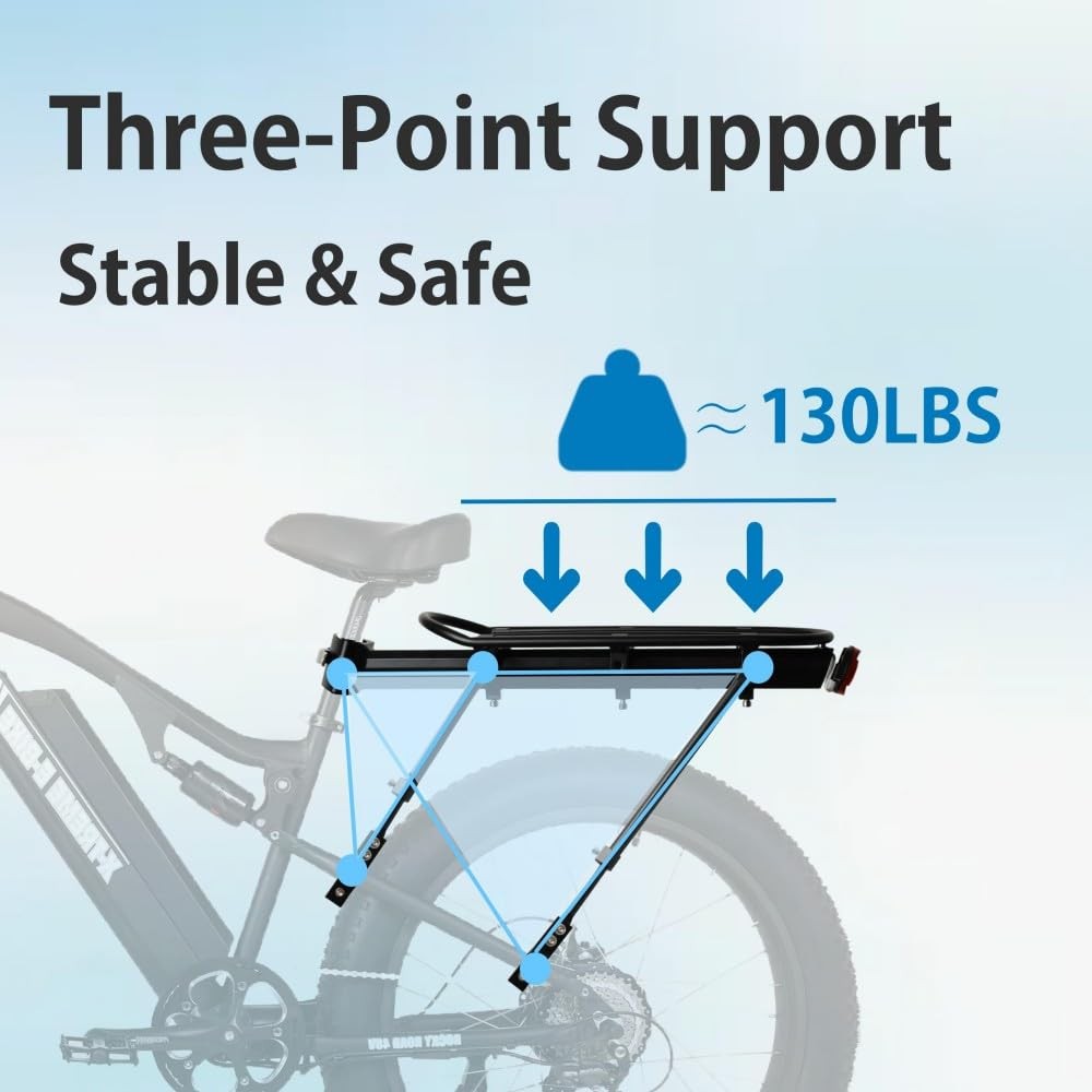 The goal: affordable and functional. We are offering a rear back rack solution that does not require you to take a third mortgage on your house! (Assume your took the second mortgage to buy the electronic ebike already) There are many options on the market that ask for too much for a simple metal made rack. In the end, we just need a bike rack that works fine for ebike and fat tire bikes. Al final, sólo necesitamos un portabicicletas que funcione bien para bicicletas eléctricas y de neumáticos gruesos. Our e-bike rack is expandable from 14 in to 20in, load capacity 60KG/132LB. Quick release. Our ebike bike rack is easier to install, with less moving parts. Made with Aluminum Alloy. Perfect use as fat tire bike/ebike rack. See pictures for installation details. Affordable alternative to ibera bike rack, and others such as rockbros bike rack. Ideal for jetson electric bike, wooken electric bike and others such as heybike, aventon, jasion eb5