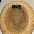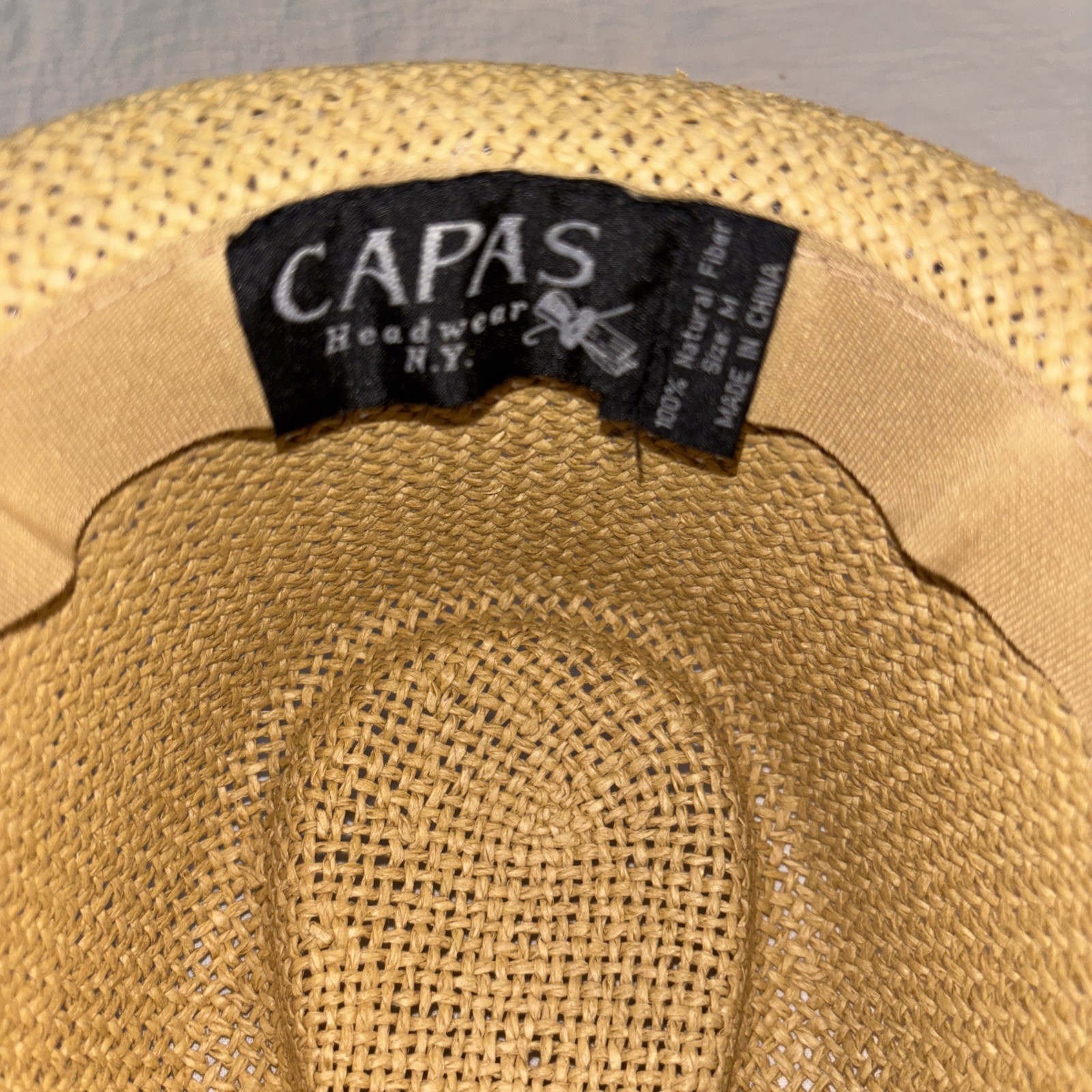 The Capas Headwear Fedora Straw Classic Vent Natural Fiber Godfather Hat in Tan is a stylish and lightweight accessory perfect for weddings, parties, or cocktail events. Made from straw with a solid pattern, this vintage-inspired hat exudes a classic and sophisticated vibe. Handmade in the United States, this Fedora hat in size M is breathable, making it ideal for warmer seasons like summer and spring. Perfect for men looking to add a touch of dapper style to their ensemble. New old stock.