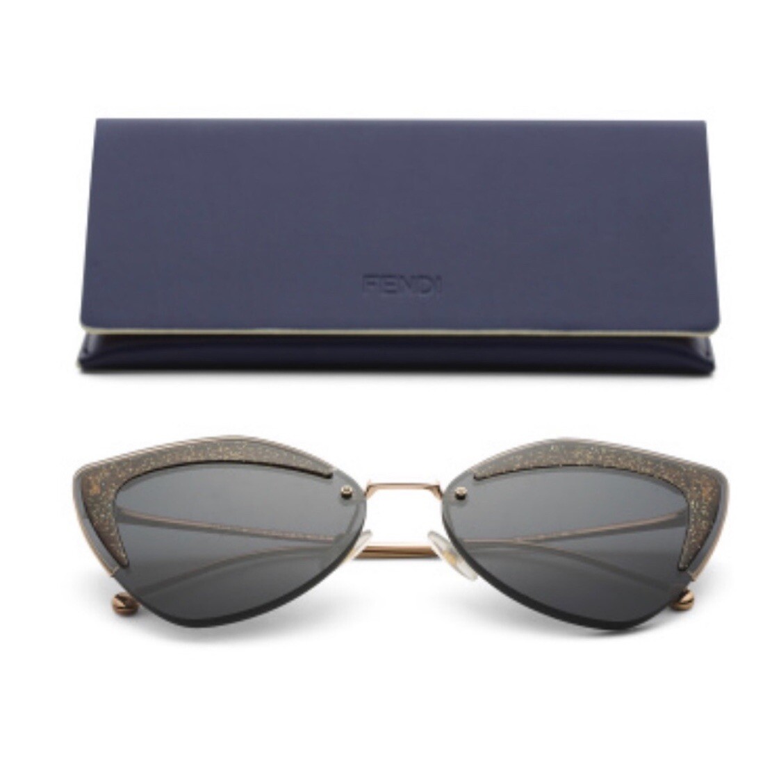 Fendi Cat Eye Sunglasses. Fendi sunglasses feature a lightweight gold-tone metal frame. The Cat Eye silhouette is embellished with a hand-applied glitter insert on the lens and tiny crystal rivets. Thin temples with Fendi lettering and round F logo tips. Glitter trim, adjustable nose pads, case and cleaning cloth included. Measurements: 66mm - 16mm - 140mm. Imported. Made in Italy. Excellent Condition. From my personal collection. Retail Price: $525.00