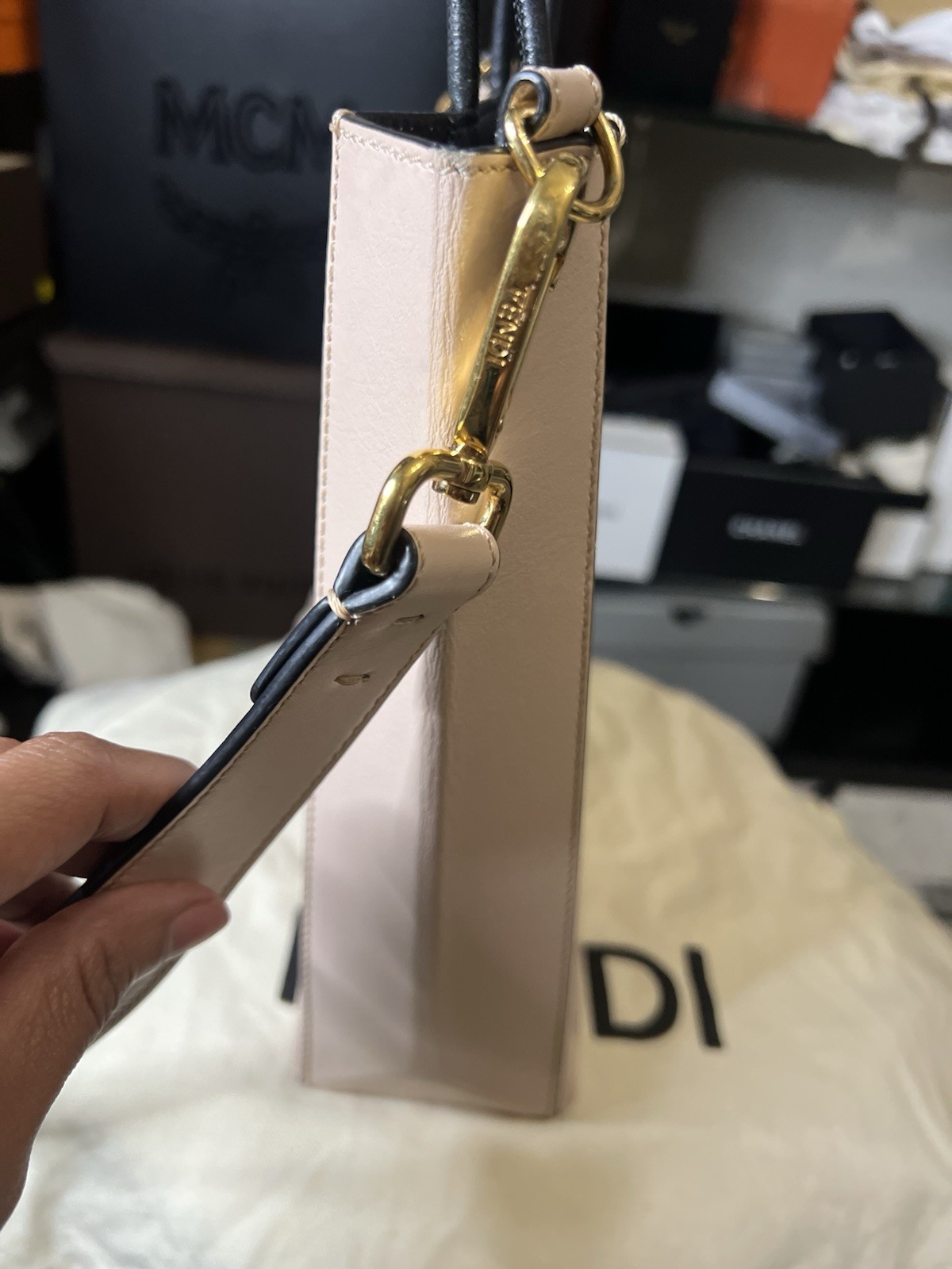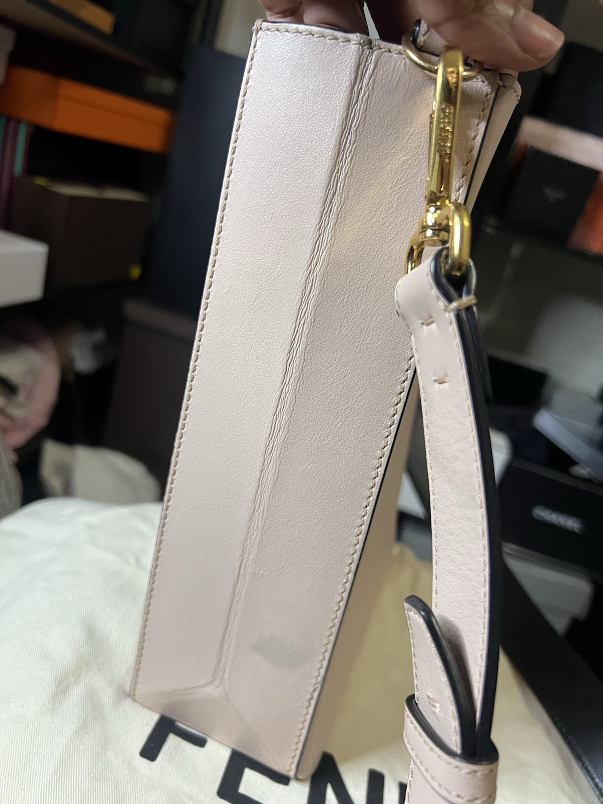 Authentic Fendi Mini Sunshine Shopper Tote in a stunning blush pink leather with black top handles and a removable shoulder strap. Features bold FENDI ROMA logo on the front and structured silhouette. Includes Certificate of Authenticity and original Fendi dust bag. 👜 Details: • Color: Light pink with black accents • Material: Leather • Style: Mini shopper / crossbody • Includes: Dust bag + COA • Condition: Gently used – minor creasing on bottom, clean exterior See pictures for more. Light color transfer on side. Minor pressure spot on front. Ships fast and secure! Feel free to message with questions.