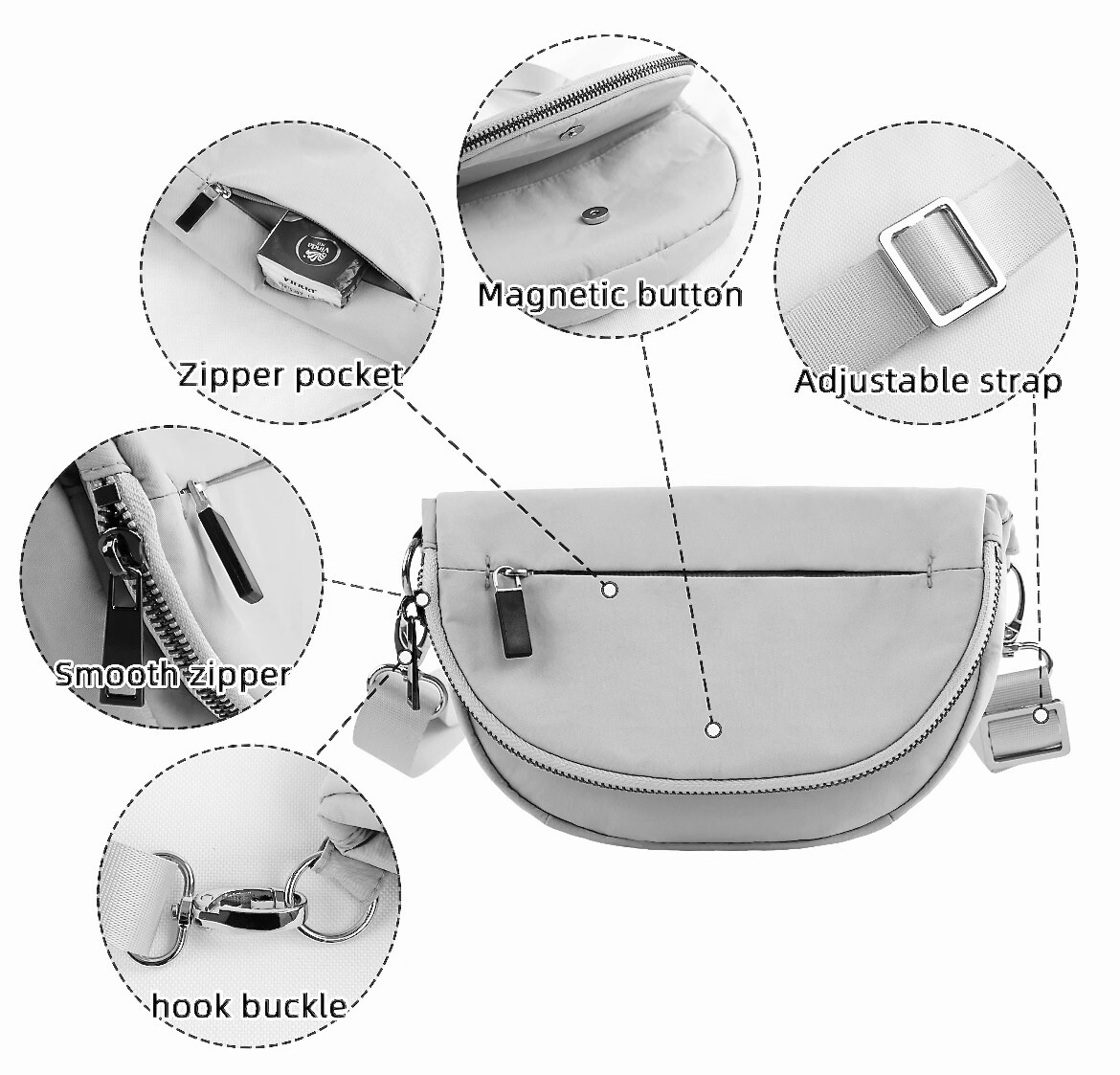2L Capacity 5' X 8' (unfolded) 100% Nylon Lining: 100% Recycled Polyester Water Repellent Adjustable Straps w/ Metal Hardware Magnetic Button Front Zipper Pocket Foldable Large Main Body Storage w/ Zipper Closure Additional slip pocket