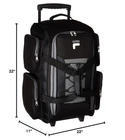 Fila 22" Lightweight Carry On Rolling Duffel Bag, Black, One Size Product Details Color: BLACK Brand: Fila MPN: FL-LUD-522-BK UPC: 844040033037 EAN: 0844040033037 Product Dimensions: 22 x 11 x 11 inches Item Weight: 4.7 pounds Department: unisex-adult Manufacturer: Fila Luggage Country of Origin: China Item model number: FL-LUD-522-BK Number of Compartments: 5 Item Weight: 4.7 Pounds 22" W x 11" H x 11" D Multiple side zippered pockets Internal handle system Handle extends up to 22" Top bungee cord Travel easily with everything you need with this small rolling duffel bag. A full zippered main compartment allows you to easily access almost everything packed inside this rolling duffel bag. Four side zippered pockets makes your items easy to access. A bungee cord allows you to store your jacket or other lightweight items. Carry on size.
