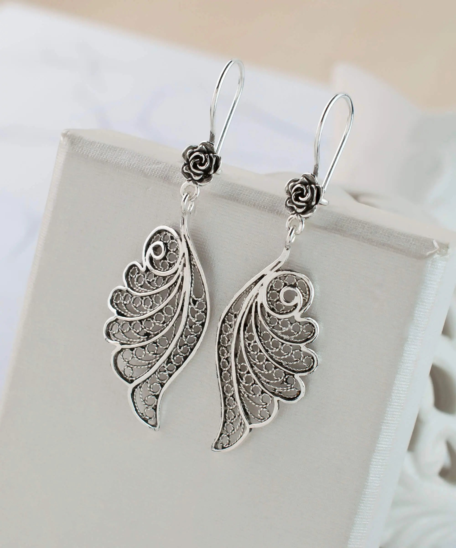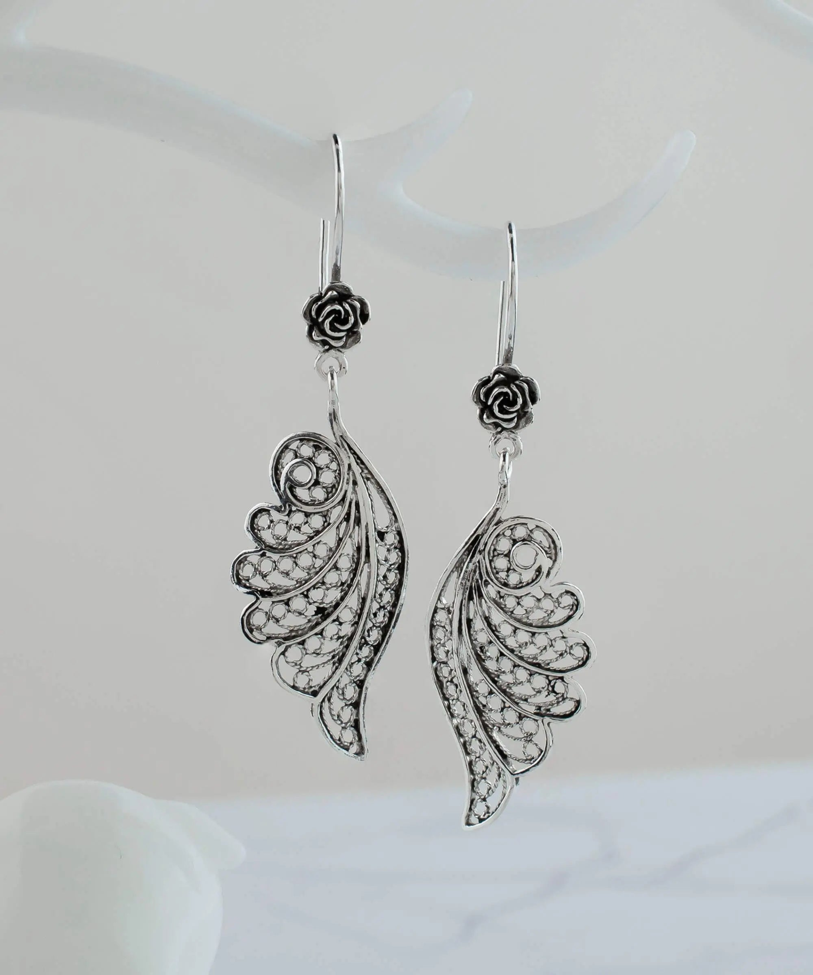 Introducing our stunning handmade earrings crafted from high-quality 925 sterling silver with a beautiful design of angel wings featuring intricate filigree detailing. With both oxidized and highly polished finish, these earrings offer a unique, antique-inspired look that is both elegant and timeless. These earrings are designed to dangle delicately from the earlobes, making them an eye-catching accessory perfect for special occasions or everyday wear. Each pair comes with a silver polish cloth, velvet pouch, and luxurious gift box, making them a thoughtful and impressive gift option for loved ones. Measuring at 2.15" in length and 1.35" in width, these earrings are lightweight at just 4.80 grams. Filigree is an ancient art originating in Mesopotamia, Anatolia and made of delicate metal strands skillfully fashioned to create an outstanding combination of old and modern art. Shop our exquisite angel wings filigree earrings today!
