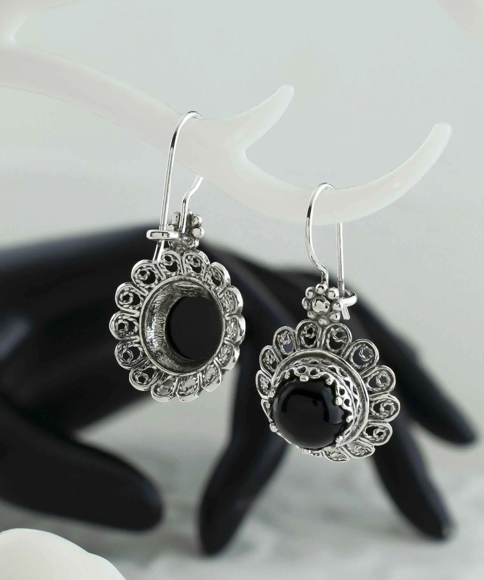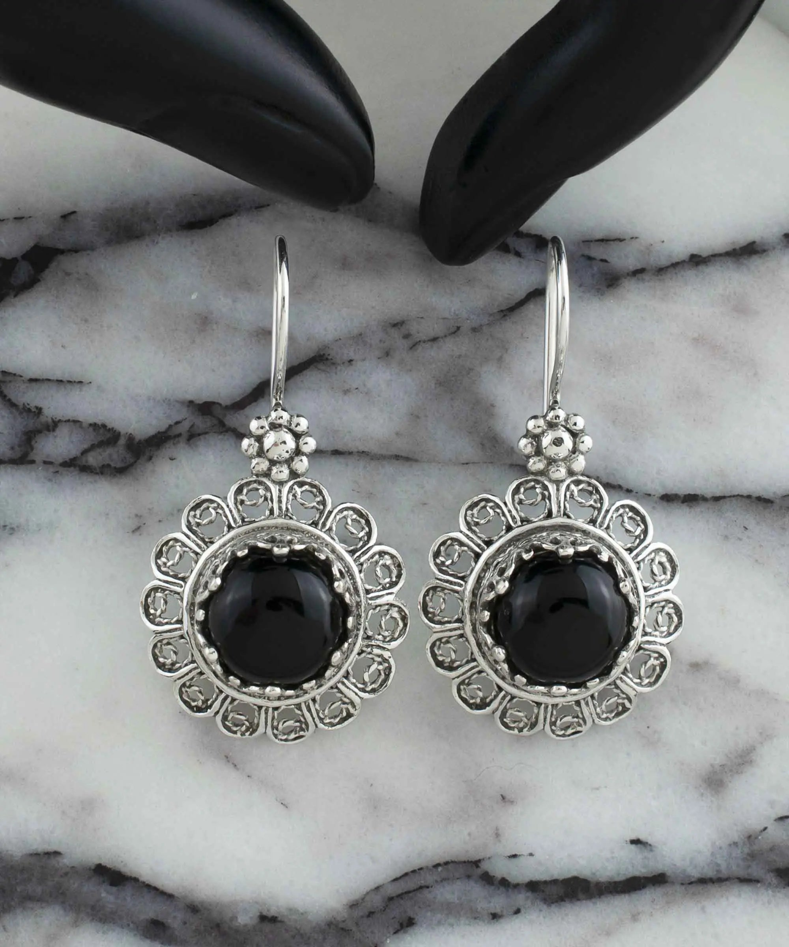 Looking for a unique and elegant gift option for a special occasion? Our Handmade Filigree Art Flower Design Black Onyx Gemstone Women's Sterling Silver Dangle Drop Earrings are the perfect choice. These earrings are handmade by skilled artisans and feature an intricate flower design that is sure to capture attention. The earrings are made of premium quality sterling silver and feature a 10mm double-side cabochon round-cut Black Onyx gemstone, which is a December birthstone. This gemstone is known for its deep black color and is believed to provide strength and protection to the wearer. The gemstone is securely set in the sterling silver, adding an extra layer of durability to the design. These dangle drop earrings are hypoallergenic and gentle on sensitive skin, making them a comfortable and stylish accessory for any occasion. The earrings come with a silver polish cloth to help maintain their natural shine, and a luxurious gift box, making them the perfect gift option for Mother's Day, Valentine's Day, birthdays, anniversaries, or any other special occasion. With their unique flower design and stunning Black Onyx gemstone, these earrings are sure to make a lasting impression. The high-quality craftsmanship and attention to detail make them a truly special gift option. Order yours today and give your loved one a gift that will be treasured for a lifetime.