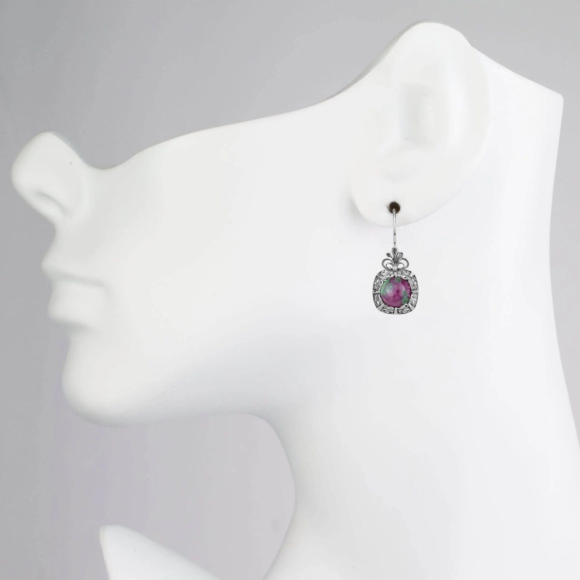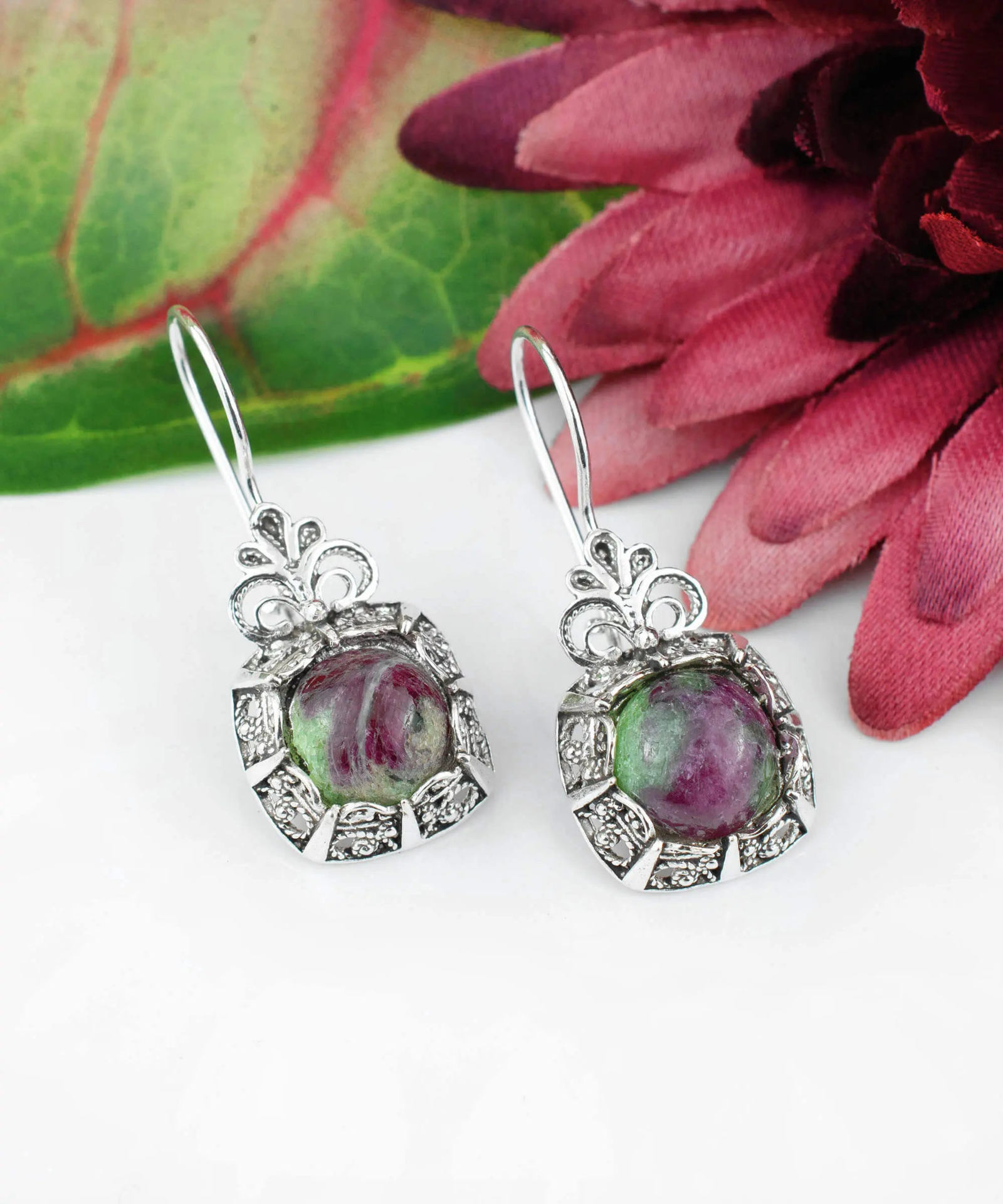 Indulge in the exquisite beauty of these handmade earrings, featuring an intricate flower pattern and delicate filigree work, crafted from premium 925 sterling silver. Each earring is adorned with a stunning ruby zoisite gemstone, creating an alluring appeal that captures the heart. These earrings boast a vintage look, thanks to the oxidized finish, coupled with a high polish shine that exudes a timeless allure. They are packaged with a silver polish cloth, velvet pouch, and luxurious gift box, making them the perfect choice for gifting on special occasions, such as birthdays, anniversaries, or other meaningful events. These earrings are a testament to the exceptional skill and artistry of the maker, evoking the beauty and grace of nature in a piece of jewelry. The ruby zoisite gemstones exhibit a vibrant red and green hue, perfectly complementing the silver filigree work, making these earrings a unique and stylish addition to any jewelry collection. Earring Length: 1.40 Inches; Width: 0.60 Inches Ruby Zoisite Gemstone: 10.00 mm, Cabochon Round-Cut. Filigree is an ancient art form, dating back to Mesopotamia and Anatolia, crafted from delicate metal strands, skillfully fashioned to create an outstanding combination of old and modern art.