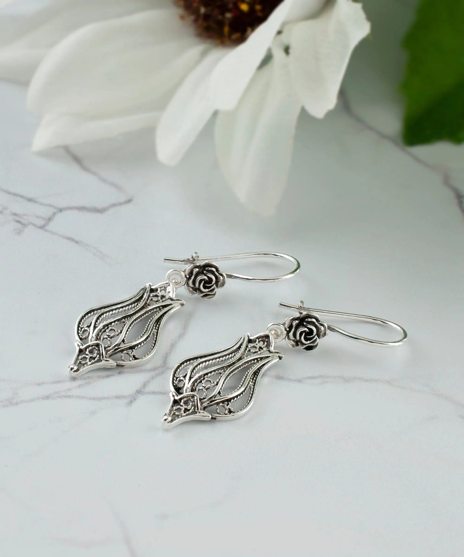 Introducing our stunning tulip filigree earrings, handmade from high-quality 925 sterling silver. The intricate filigree detailing on the tulip design is both delicate and eye-catching, while the oxidized and highly polished finish gives them an antique-inspired look that is both elegant and timeless. These earrings are designed to dangle delicately from the earlobes, making them perfect for special occasions or everyday wear. To make them an even more special gift option, they come with a silver polish cloth, velvet pouch, and luxurious gift box. The tulip earrings measure 1.75 inches in length and 0.50 inches in width, with a weight of 4.80 grams. Filigree is an art form originating in Mesopotamia, Anatolia, where delicate metal strands are skillfully fashioned to create an outstanding combination of old and modern art. Don't miss out on adding these lovely tulip filigree earrings to your collection or gifting them to a loved one. Shop now and experience the beauty of these timeless accessories!