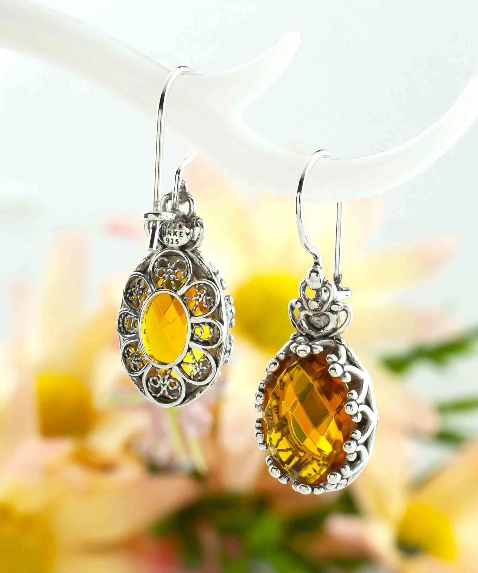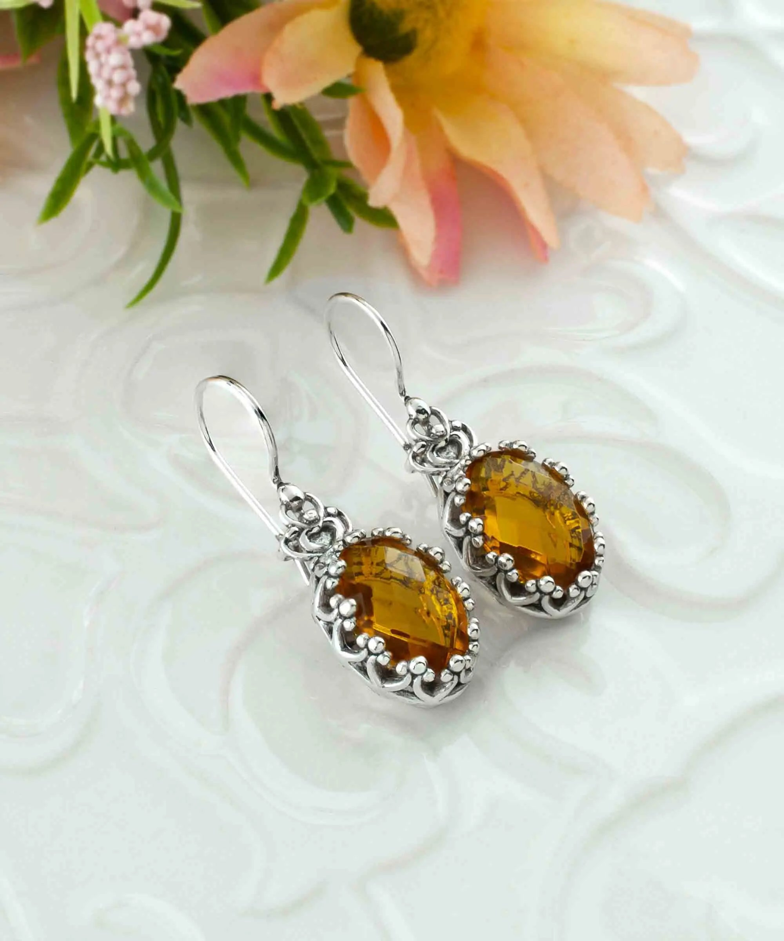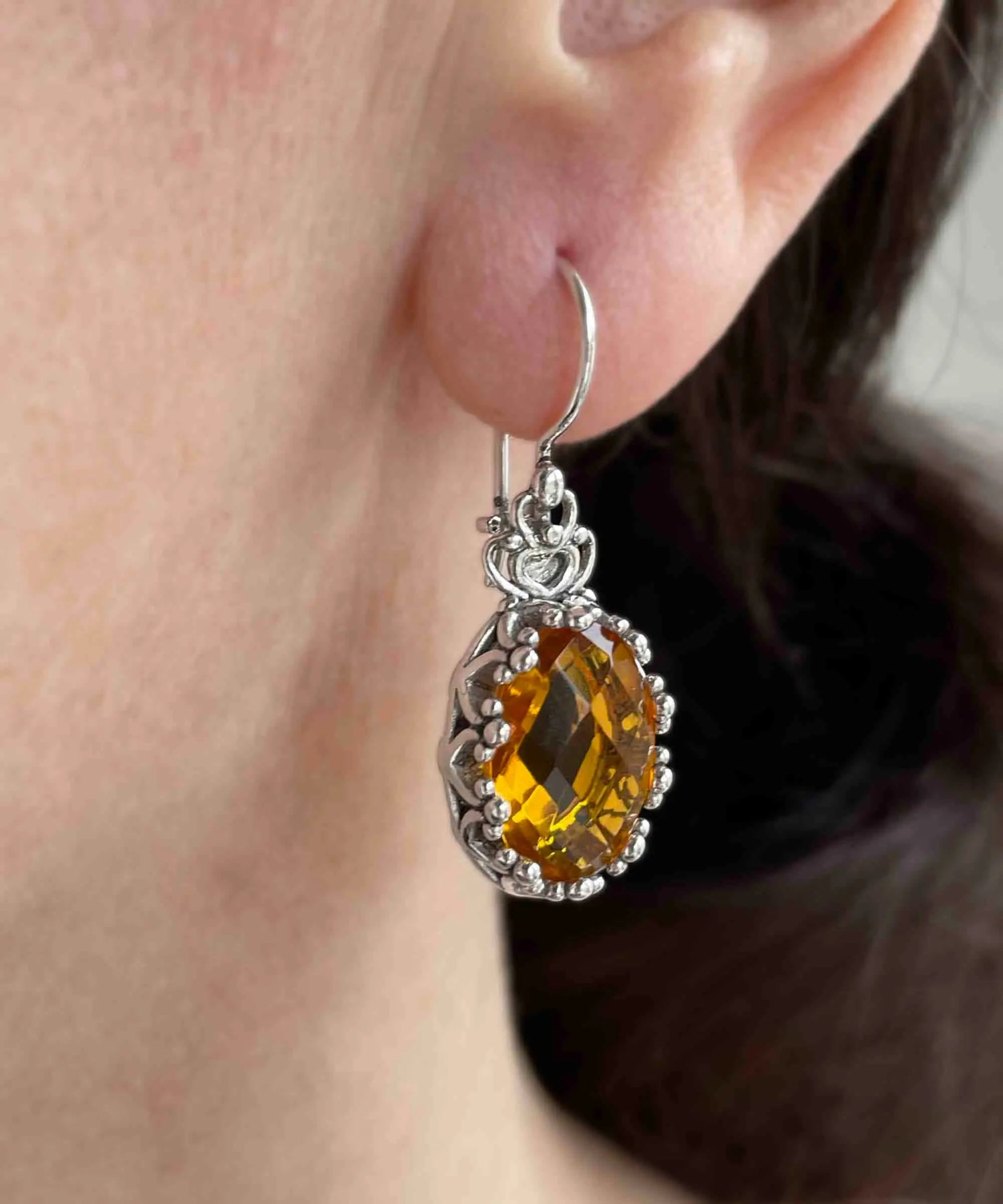 Looking for exquisite and unique earrings that showcase the delicate beauty of filigree art? Look no further than these handmade queen's crown design earrings crafted from high-quality 925 sterling silver. With their stunning citrine gemstone oval drops, these earrings are sure to make any occasion extra special. At 1.40" in length and 0.50" in width, these earrings are the perfect size for any outfit. The citrine gemstones are double side faceted rose cut and measure 10x14mm, giving them a beautiful and dazzling appearance. In addition to their exceptional craftsmanship and gemstones, these earrings are also oxidized and highly polished for an elegant and sophisticated look. And with every order, you'll receive a velvet pouch, luxurious gift box, and silver polish cloth, ensuring that your earrings arrive in pristine condition. Citrine is a beautiful and powerful gemstone, believed to promote happiness, success, and abundance. It's perfect for boosting self-confidence and creativity, and is said to have a cleansing and energizing effect on the body. So whether you're looking for a special gift for a loved one or just want to treat yourself to something extraordinary, these filigree art solid silver citrine gemstone oval drop earrings are the perfect choice. Order now and experience the beauty and elegance of filigree art for yourself.