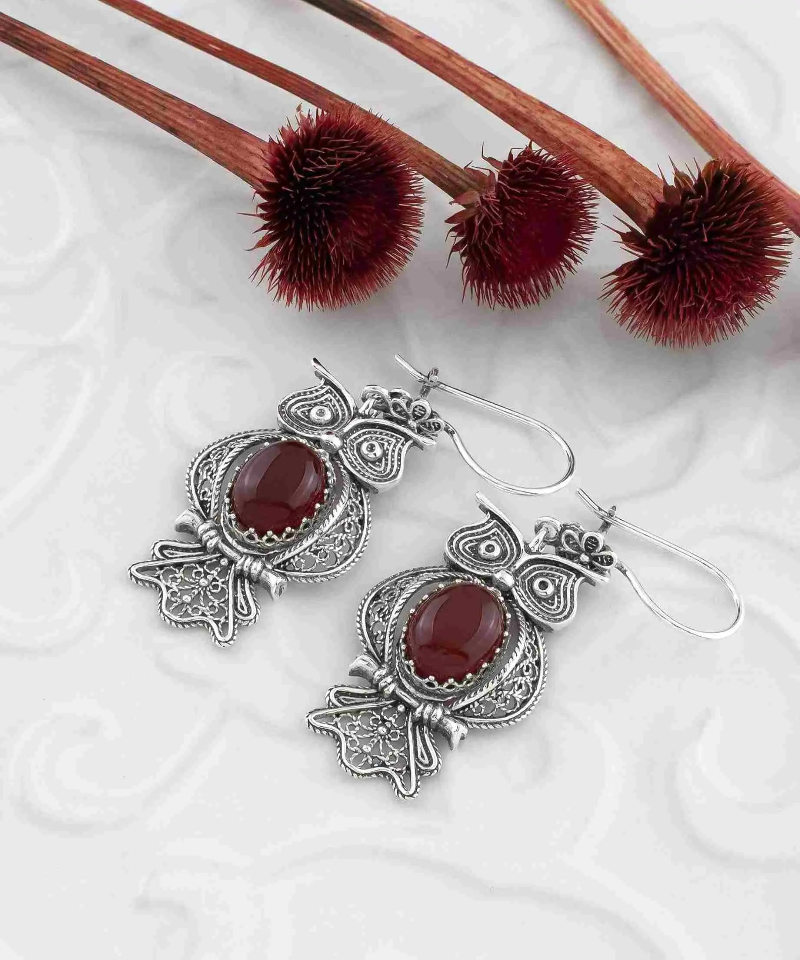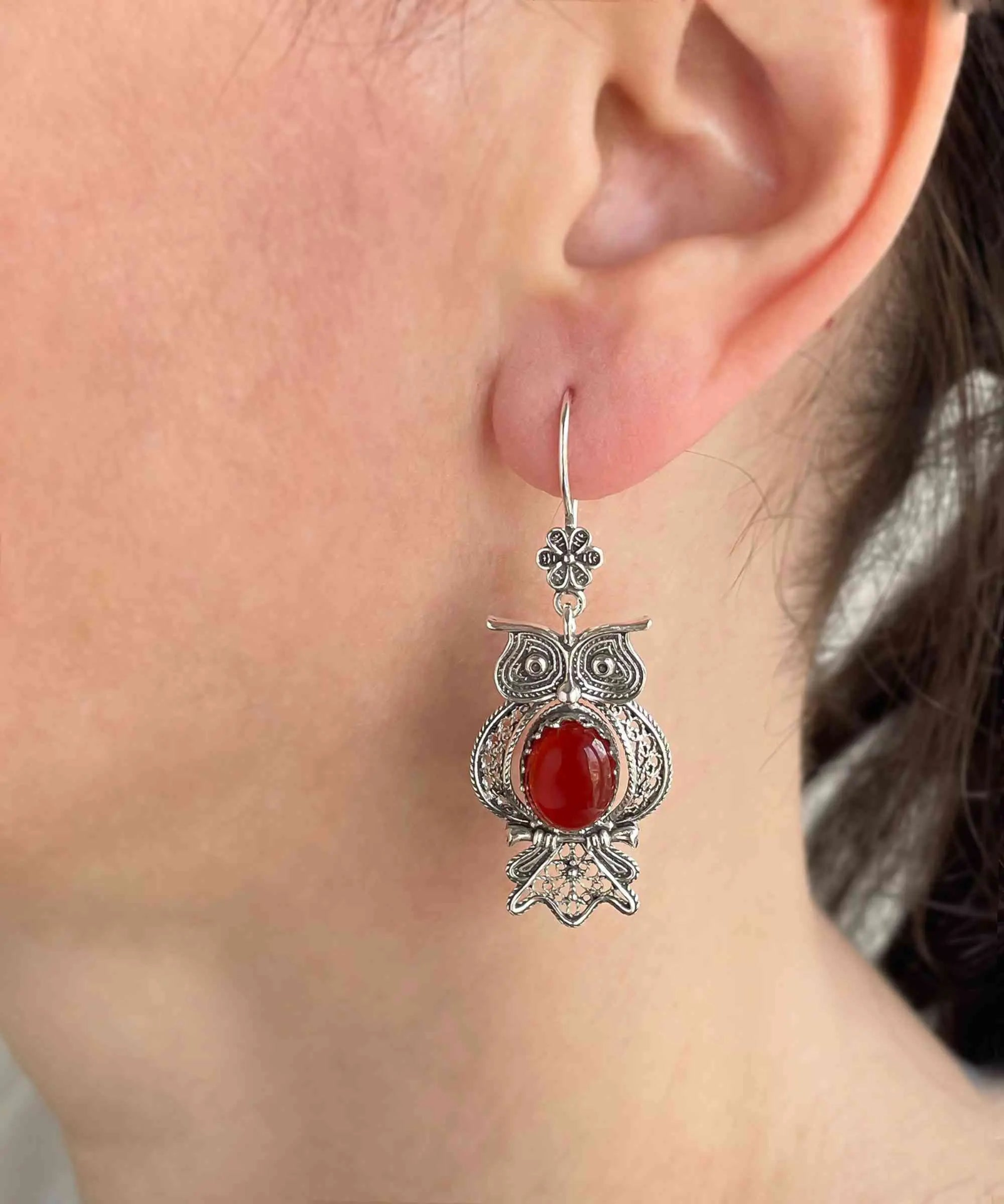 Introducing our stunning owl-figured 925 sterling silver filigree art women dangle drop earrings featuring a beautiful Carnelian gemstone. These earrings showcase gorgeous filigree details, expertly handcrafted by a master artisan in our workshop. The multi-layers of 925 Sterling silver oxidized finishes are set on a rich red stone, with a detailed center-cut Carnelian gem of 8x10 mm, cabochon oval-cut. Elevate your style with these intricately designed traditional dangle drop earrings, perfect for wearing with cultural attire or with an everyday outfit. These delicately carved spiritual artifacts make a unique and thoughtful gift for your loved ones. The length of the owl earrings is 2.00" / 51.00 mm and the width is 0.70 "/18.50 mm, with a weight of 7.80 gr. Each pair of earrings comes with a velvet pouch, silver polish cloth, and a luxurious gift box, making it the perfect present for any occasion. Discover the art of filigree, originating in Mesopotamia, Anatolia, which uses delicate metal strands skillfully fashioned to create an outstanding combination of old and modern art.