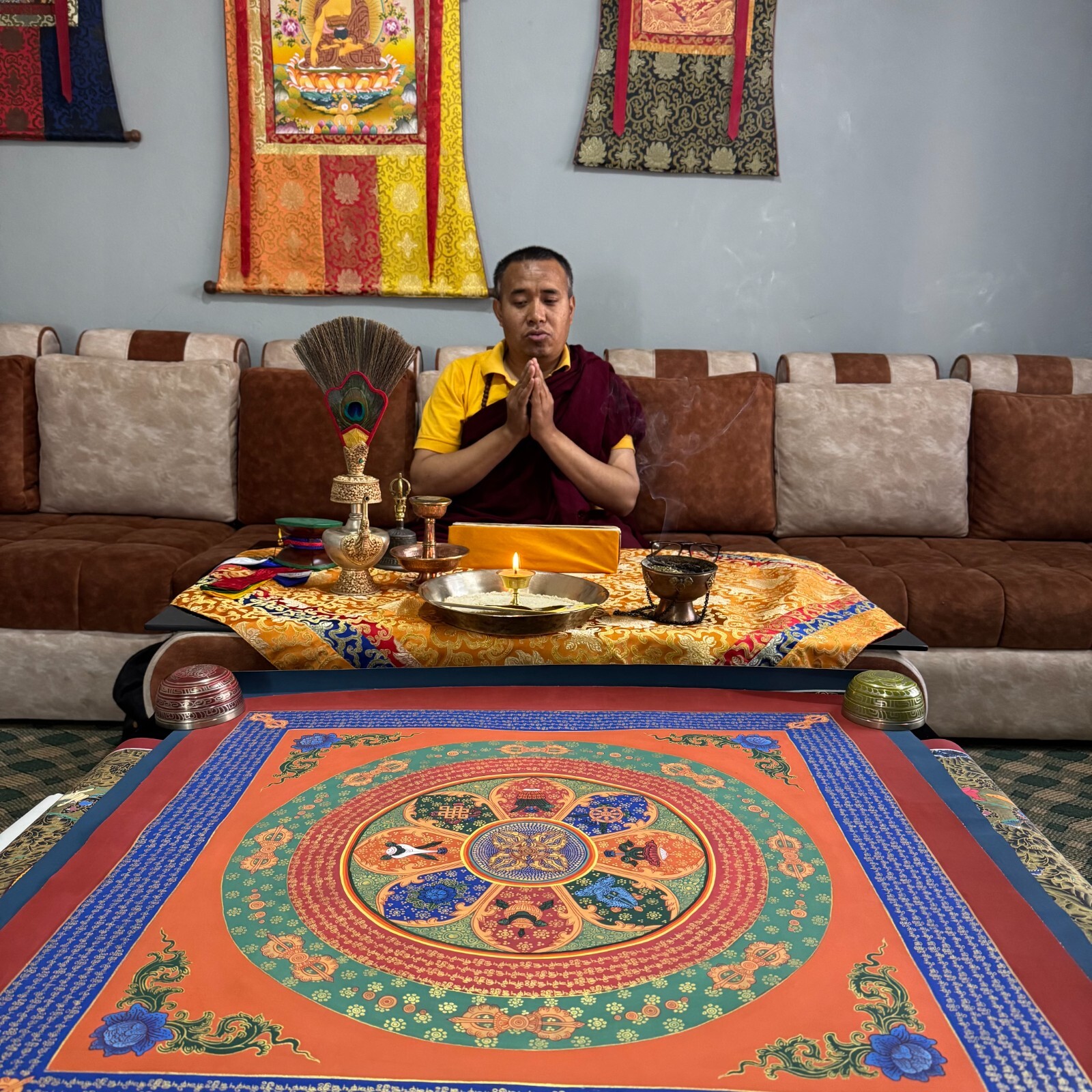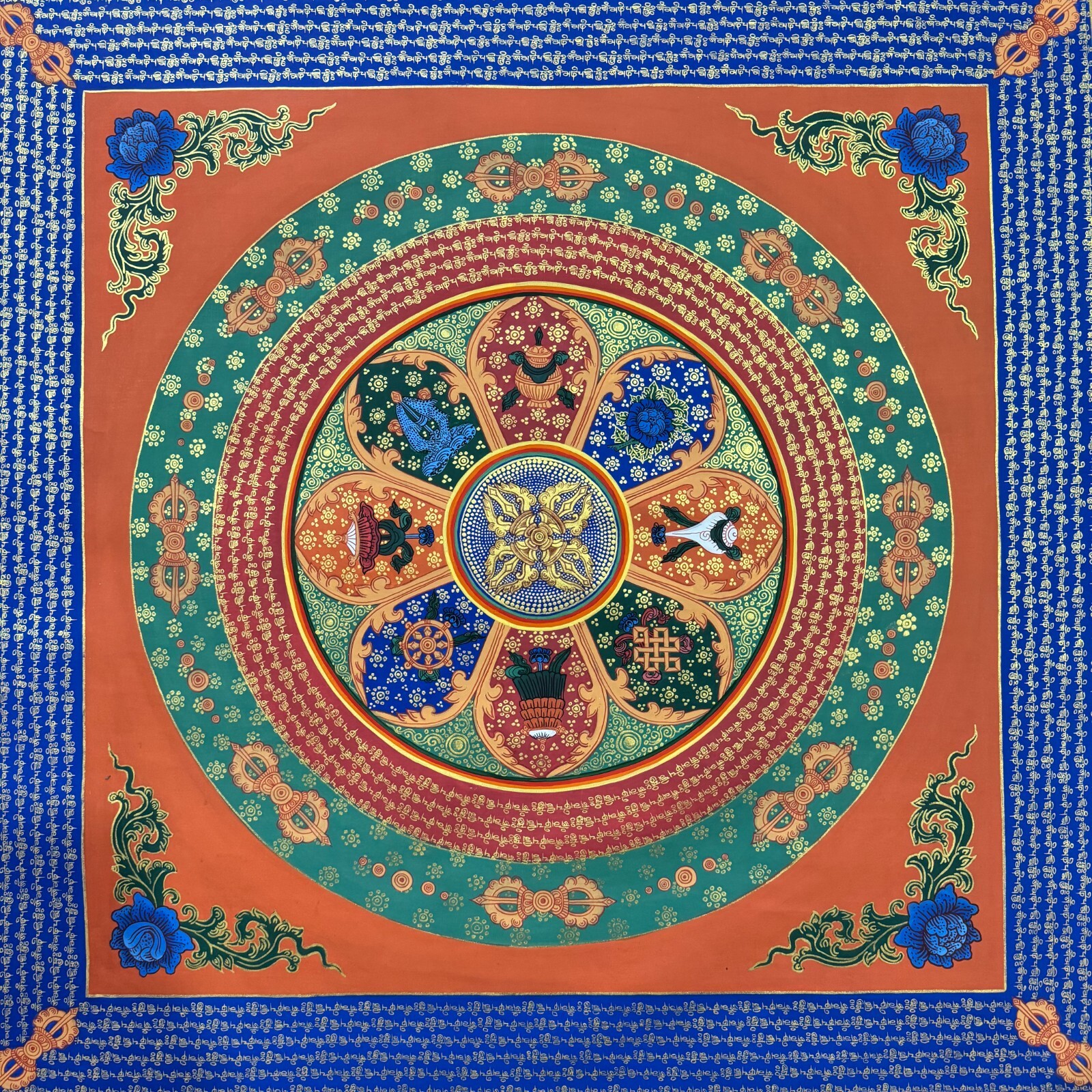 Namaste and Welcome to my Gallery!!! All of the paintings and arts in my gallery are originally handmade and hand-painted by my family members and other local artists who have been practicing their craft for over two decades. My father is Master Artists Nepal with an experience of more than four decades; you can see some of his work in this Gallery. Also you can see some of the beautiful and soulful artwork of talented local artists from Himalayas. ~~Double Vajra Mandala Thangka~~ Mandala is a geometric pattern of squares & concentric circles as a projection of the cosmos. The basic form of mandalas is square with four gates containing a circle with a center point. Mandala is regarded as a place separated and protected from the ever changing and impure outer world of samsara. Size = 78cm x 78cm Material Used: • Cotton Canvas • Natural Pigments and colors • Gold leaf ~Excellent for meditation or home/office décor, ~Tibetan Yoga Wall Art ~Genuine 100% hand-painted from Himalayas Please feel free to contact me if you have any question regarding the painting.