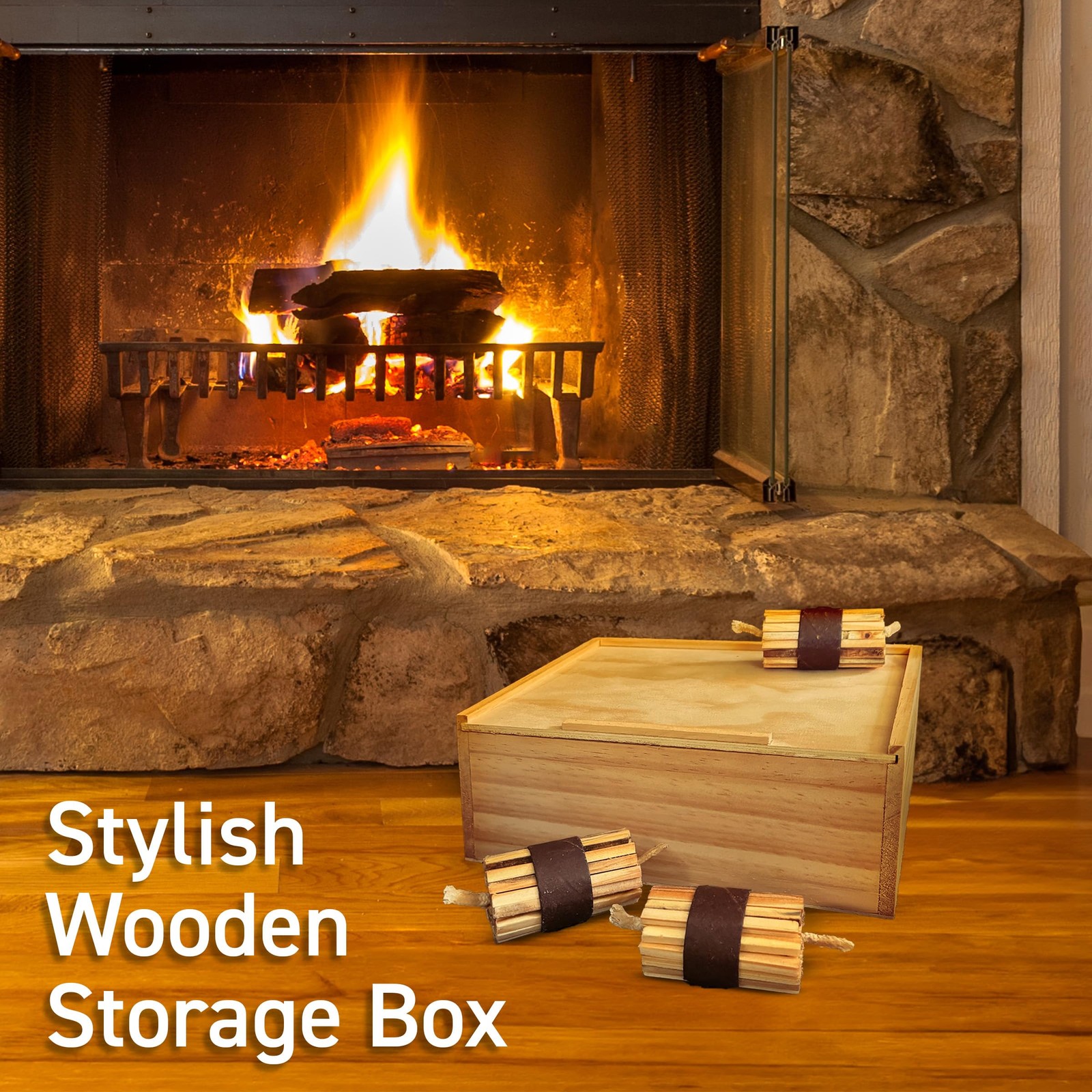 FIRE STARTER 20-PACK - Quickly create a roaring fire indoors or out with these 3-inch-long camp fire starter sticks, which are made using a small bundle of natural pinewood sticks imbedded with non-toxic and odor-free paraffin wax. EASY TO LIGHT - These fire starters for fire pit and indoor fires have wicks at both ends for easy lighting. The fire plugs catch quickly and burn intensely for 15 minutes to create a steady flame fast, with or without extra kindling. MULTIPURPOSE USE - Use these firestarters for outdoor fire pit bonfires in your own backyard, as kindling wood for a campfire, for lighting charcoal briquettes without the need for lighter fluid, or for creating a roaring fire in your indoor fireplace. STORAGE BOX INCLUDED - These fire kindling sticks come packaged in a wooden storage box that will look great next to your fireplace, while also making these firepit sticks easy to transport on your next outdoor adventure. PRODUCT DETAILS - Materials: Natural Pine Wood and Non-Toxic Paraffin. Dimensions: Box - (L) 9.25” x (W) 6.75” x (H) 4”; Individual Fire Wood Starter Stick - (L) 3” x (W) 2” x (H) 2”. Includes Pack of 20 Firestarters, Matches, and Wooden Box.
