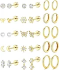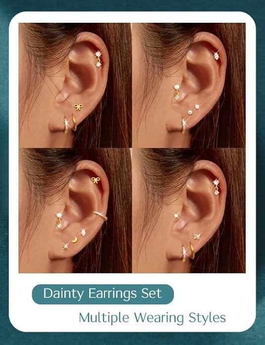 14K Gold Plated Hypoallergenic Earrings for Sensitive Ears---Dainty Earrings Set Made From 316L Stainless Steel,No Lead &No Nickel ,Hypoallergenic Surgical Steel Earrings Adopt Real 14K gold plated,Long Lasting Shiny.14K gold plated Cartilage Earrings,No Skin Irritation,Non Tarnish,Suitable for Women Over 4 Years Old.5A Cubic Zirconia Inlaid,Sparkle With Elegance,Add More Brilliance To Your Ear Look Cartilage Earring Sets for Multiple Piercing---20G Cartilage Earrings for Women Girls,Including 10 Pairs Stud Earrings:Such as Flat Back Earrings,Cute Butterfly Bow Flat Back Earring,Dangle Helix Earrings,Cute Star Flowers Earring for Girls Kid; 5Pairs Conch Hoop Earrings for Women.Super Cute Variety Of Earrings. Different Styles So You Can Wear These In Many Different Spots On Your Ears.The 14K gold plated Earrings Set Look Great Whether You Wear It Alone Or Mixed Or Matched With Other Earrings Cartilage Earring Flat Back---Comfortable Flat Back Stud Earrings for Women Girls Remove The Pain And Hassle Of Traditional Earrings, Without Stabbing Your Neck. Perfect For Wearing While Sleeping, Bathing Or Exercising!Screw Back Design,Easy To Screw On And Take Off,Suitable For 24/7 Wear,Won't Easy To Slip Off.Comfortable To Wear,Perfect For Daily Wearing Comfortable Earring Size---14K gold plated Cartilage Earring Gauge 20G=0.8Mm,Post Length 6Mm,Flat Back Size: 5Mm.Cz Huggie Hoop Inner Diameter 8/10Mm,Smooth Hoops:8/10/12Mm,20G Piercings Earrings Can Be Used As Cartilage Earring For Women,Tragus Piercing Jewelry,Daith Earrings,Helix Piercing Jewelry,Conch Hoop And Other Ear Piercing Or Lobe Stud Earrings,Perfect For People Who Have Many Ear Piercings Style Stylish Gift&Ready Jewelry Set----Dainty 14K gold plated Earring Set With A Beautiful Gift Box,A Timeless Gift for Girlfriend, Ladies, Wife, Daughter, Mother, Classmates Or Friends On Birthdays, Mother’S Day,Christmas,Graduation,Anniversary,Holidays, Or Self-Pampering.Trendy,Classic,Dainty,Lightweight,Comfy,Hypoallergenic.Suitable For Everyday Or Special Occasions 14K Gold Plated-15Pairs' Dainty Cartilage Earring sets for Multiple Piercing: Including 12 Pairs Tiny Flat Back Stud Earrings and 3Pairs Small Hoop Earrings in Gold Tone.Lightweight Dainty 14K Gold plated Earrings Sets for Multiple Piercing,Such as Cartilage Earring,Helix Piercing Jewelry,First Hole,Second Hole,Third Hole,Tragus Jewelry,etc.Multipack Earring to Match Your Ears Flexibly Vacuum Plated Hypoallergenic Stud Earrings: 14K gold plated 316L Surgical Steel Earrings,Newly Upgraded Vacuum Plated with 14K Gold tone,Safer than Normal Electroplating.No Rust,No Tarnish,non lead & non nickel,Hypoallergenic Earrings for Sensitive Ears,Flat Back Earrings Stacks,You Can Wear 24/7 Comfy Flat Back Stud Earrings for Women: Screw Back Flat Back Earrings,Simple to Wear.Not easy to fall off.14K Gold plated Flat Back Earrings Remove The Pain and Hassle of Traditional Earrings,Without Stabbing Your Neck or Squishing Your Earlobes.Now You Can Comfortably SLEEP,WORKING,PLAY with Flat Back Earrings.Comfy Nap Earrings Fit for Sleeper Flat Back Stud Earrings Size: 14K Gold plated Earrings Studs Gague: 0.8 mm (20 g),Mini Studs: 2 mm (0.08 in),Tiny Studs: 3 mm (0.12 in),Small Studs: 4 mm (0.16 in).Hypoallergenic 14K Gold plated Cartilage Earring Sets for Multiple Piercing.Including Ball Stud Earrings,Star,Moon,Heart Stud Earrings,Pearl Stud Earrings and Cubic Zirconia Stud Earrings,etc Hoop Cartilage Earring Size: Mini Hoop Earring: 6 mm (0.24 in),Tiny Hoops: 8 mm (0.32 in),Small Hoops Earring: 10 mm (0.40 in).Thickness: 8/10/12 mm.Gague: 0.8 mm (20 g). Hypoallergenic 14K Gold plated Hoop Cartilage Earring Sets for Multiple Piercing Surprise: Hypoallergenic Flat Back Stud Earrings pack comes with a exquisite present box.The Multipack Tiny Cartilage Earrings,14K Gold plated Earrings for Women - Trendy,classic,Dainty,Lightweight,Comfy,Hypoallergenic.A Surprise for your family,your friends and yourself