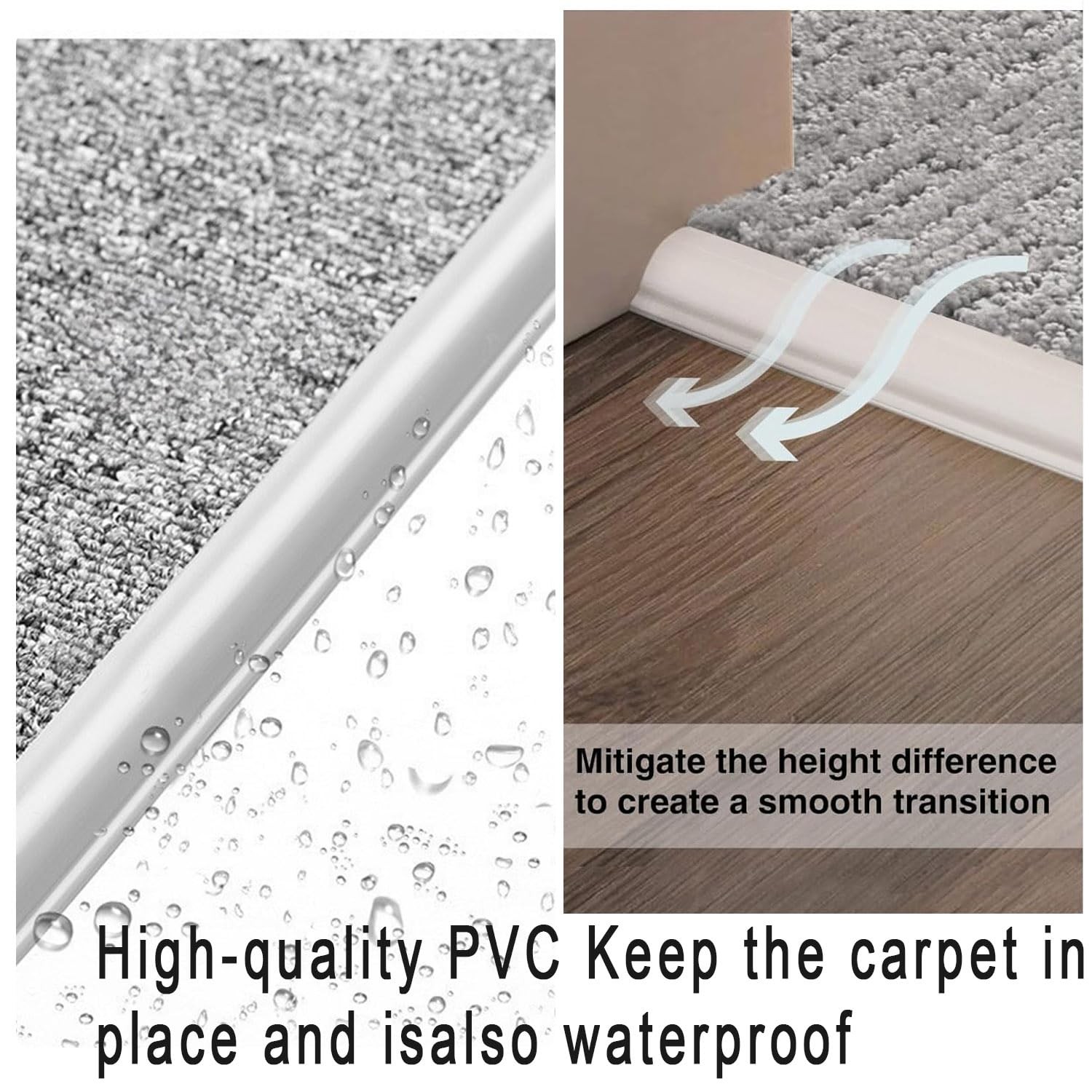 Flooring Transition Strips:This threshold transition strip is specifically designed to provide a fix, protection, and decorative solution for the transition between floors and thresholds or carpets.It Not Only Connects The Carpet And The Floor Smoothly, But Also Provides A Sealing Effect. It Protects The Edges Of The Carpet From Wear And Tear Rug Edge Protector: Are You Still Worried About The Carpet Buckling, Wrinkling, And Walking Back And Forth, Creating Safety Hazards? Are You Still Worried About The Germs Caused By Children And Pets Producing Waste Under The Carpet That Is Not Cleaned In Time? The Floor Carpet Transition Strips Are Made Of High-Quality Pvc Materials, that can easily cover the edges of floor tiles and carpets Carpet Edge Sealing Strip: It is made of premium material and features a strong adhesive that. Additionally, it is scratch-resistant, abrasion-resistant, stain-resistant, water-resistant, heat-resistant, and environmentally friendly.The carpet edging trim is durable, withstands high foot traffic areas in the home Flexible Cutting: Easy To Customize And Cut To Size With Scissors Or Knife, Easily Adjust To The Length You Need. It is also easy to clean and maintain. Suitable For 0-0.4 Inch Thick Carpet.please ensure the floor surface is clean and free from grease, dust, or moisture, as stickiness may be slightly reduced otherwise This transition strip finds wide application in various locations such as homes, hotels, restaurants, conference halls, etc. It can be used for multiple floor transitions and decorative purposes. The most common transitions include wood floor to carpet, tile to carpet, and tile to door threshold, among others