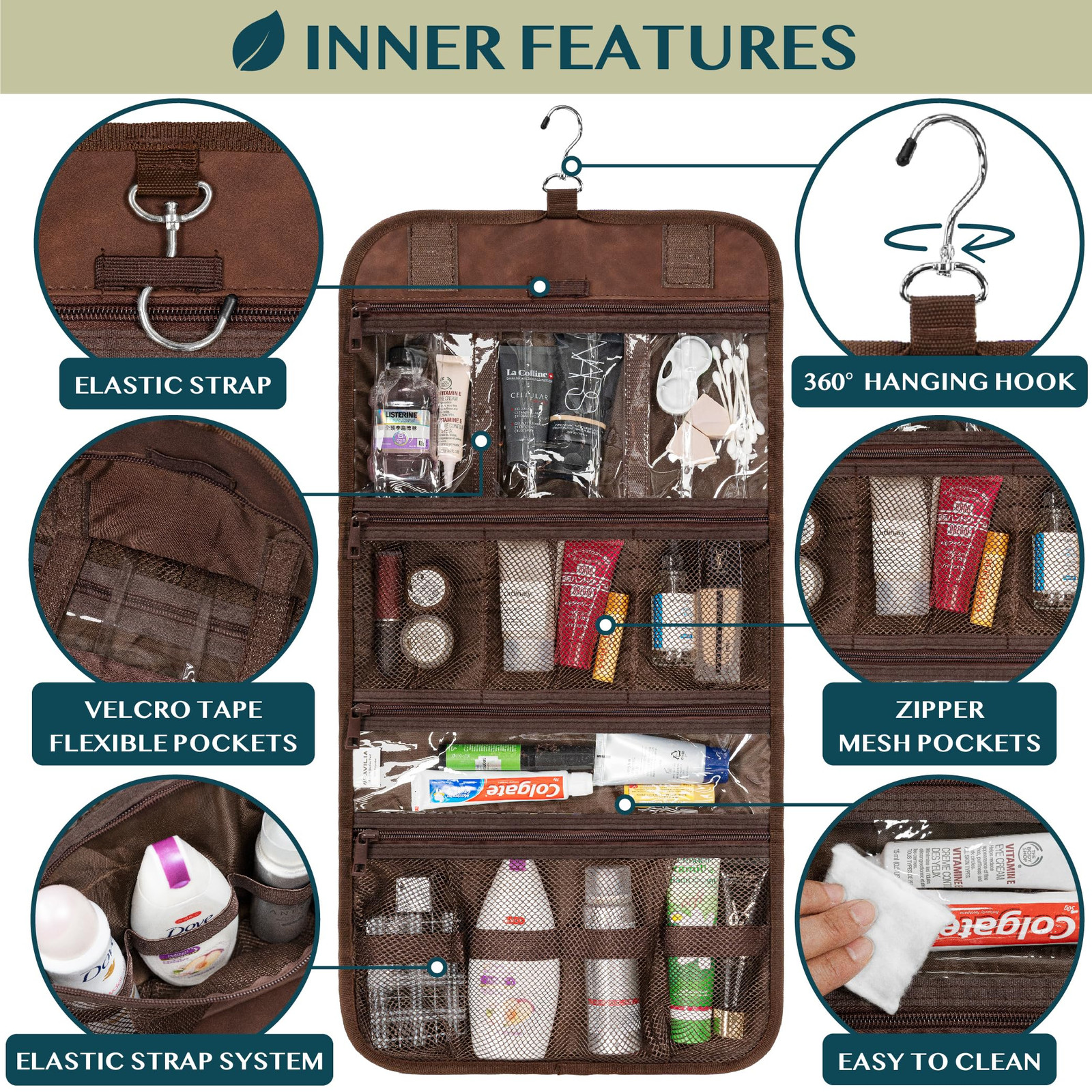 FOLDABLE TRAVEL TOILETRY BAG: large travel bag toiletry organizer case has a 4 main compartments to fit all your travel toiletries containers, makeup, and cosmetic bottles. Zipper pocket in front holds essentials when the toiletry bag is folded. Roll up waterproof pockets can fit skincare cream, shampoo, make up brush, toothbrush and wet items. This is a travel must have for vacation, flying, gym, cruise, and home. Large size at 14x9x2 inches (LxWxH), Size Unfolded 14x26x1 HANGING COSMETICS TRAVEL BAG ORGANIZER: This toiletry bag for women has a hanging hook and multiple pockets that help you stay organizer during business trip, vacation travel. The hanging hook makes it easy to hang the toiletry bag to bars in the hotel shower bathroom. Unzip your toiletry bag to reveal compartments to organize your shampoo, skincare face hygiene products. This toiletry travel bag is an essential accessory for cruise in Europe, plane, Hawaii Trip, and honeymoon. PADDED MAKE UP BAG KIT: The toiletry case bag for men has foam padding that protects toiletries container, shampoo bottle during flying, roadtrip, and plane. The toiletry bag kit also has elastic bands that secure makeup brush, face spray, lipstick, shaving razors. One waterproof compartment for wet toiletries. Clear pockets let you see all essentials clearly and is tsa approved. This large hanging toiletry bag holder for women will protect all gear, cosmetics, and travel gadgets. PACKABLE TOILETRY BAG GIFT: Large and portable, this compact hanging toiletry bag is perfect for business trips, traveling, gym shower, camping, dorm, home use. Easily fit this in any luggage and suitcase. This is a great travel toiletry gift set for travelers, women, men, flight attendants during Birthday, Christmas, holidays, and vacation. Also makes a great gift for mother, father, friend,wife and husband gift during Valentine Day. EASY TO CLEAN: Simply wipe clean with damp cloth to maintain the toiletry bag travel bag. With its water resistant polyester fabric and waterproof compartment, this travel kit for women keeps your travel-size item, shampoo, conditioner, lotion, face wash, medicine, toothpaste, toothbrushes, hair brush and daily makeups protected and organized for every trip, cruise, flight! A must have for every travel packing list!