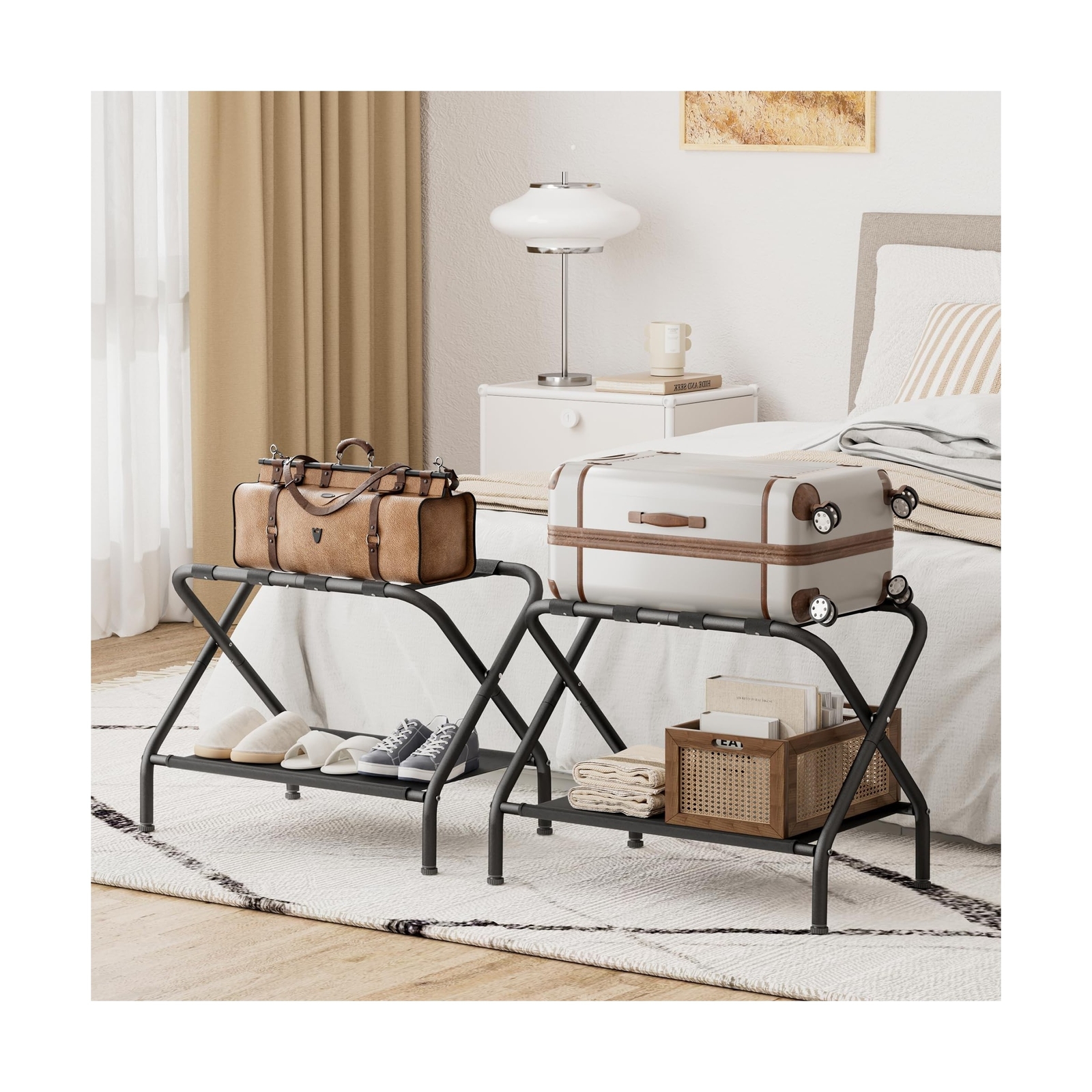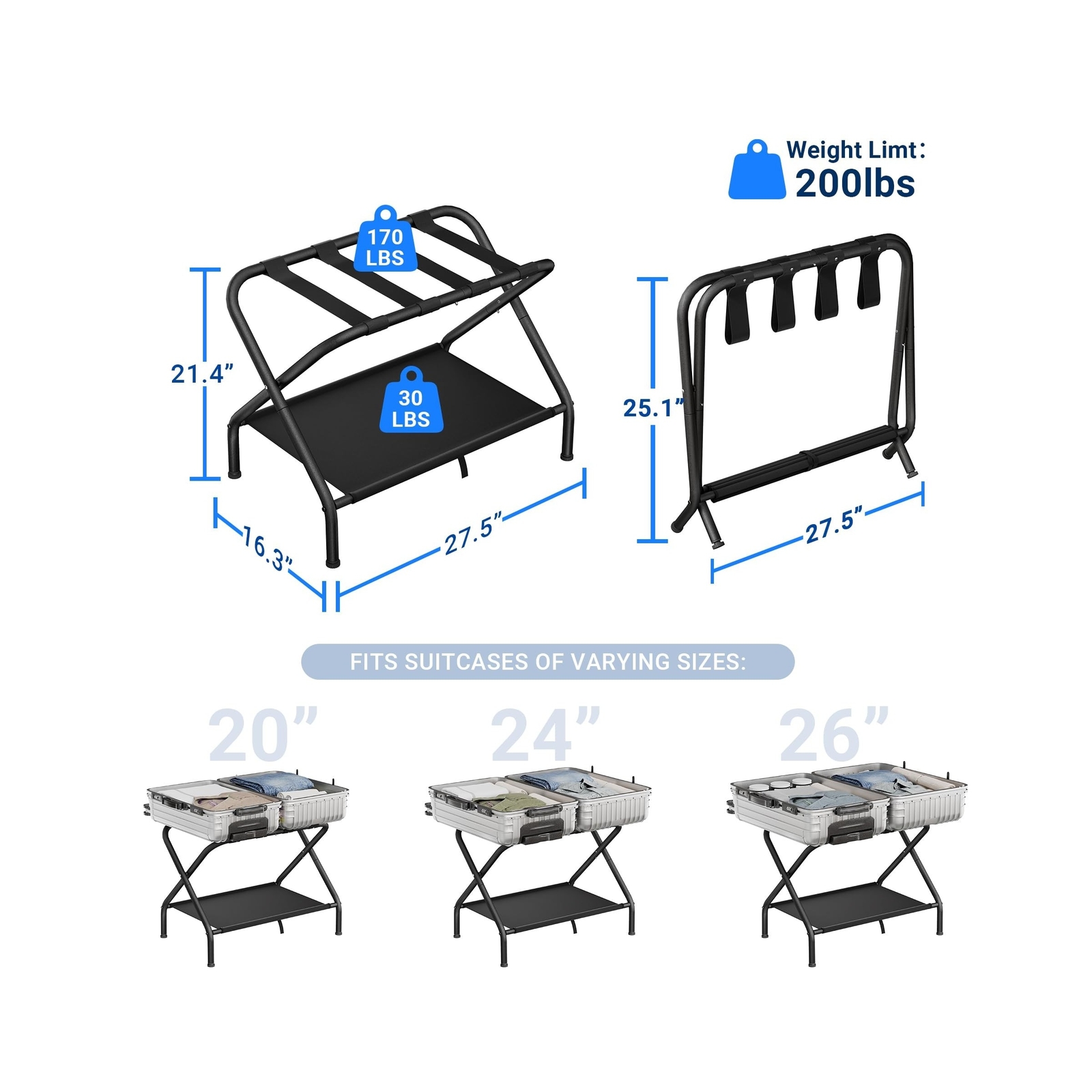 Brand New Luggage Rack, Folding Luggage Stand, Collapsible Metal Luggage Holder, Heavy-Duty Suitcase Stand with Storage Shelf, Luggage Racks for Guest Room, Bedroom, Hotel Space Storage Rack, Black Manufacturer model: 718543 Strong Stability-- This luggage rack is built with anti-wear materials and a reinforced metal steel frame for durability. The luggage rack has a sturdy structure and 4 nylon belts; The suitcase holder is sturdy and can withstand up to 200 pounds; Adjustable feet improve stability and balance, prevents items from falling and protects floors. Practical Design-- Luggage Stand has double compartments provide more storage space for suitcases, bags, shoes, and other items. The underlying fabric layer also has small strings that allow you to roll up the fabric layer so that it can be folded up with maximum space when not in use. Multi Function-- This durable luggage Holder is perfect for an alternate bedroom or hotel for guests to pack or unpack their luggage. Not only can you use it to organize and store your luggage, and put your shoes on them, but you can also use it to dry clothes or towels. Saving Your Back-- Use this Suitcase Stand to make your guests' stay more comfortable. It keeps luggage off the floor, preventing you or your guests from bending over to the floor to take things out after a tiring journey, making packing and unpacking for travel easier. Easy Install-- You can find all the necessary accessories in the package and can install them yourself according to the instructions without using any additional tools. It only takes one person 5-10 minutes to install a Luggage Racks . Description Shipping and Handling Please allow 5-7 business days for the package to arrive, regardless of buyer location within the US. We will provide an online tracking number to you once the item has been shipped. It may take a few business days for our automated system to process the tracking number onto eBay. However, this will not affect the shipping times. Return Policy All our products are brand new and sealed. All items qualify for returns within 30 days of receipt. Feedback We take our reputation seriously. If you have any questions or concerns, please contact us and we will respond back to your message within 24 hours.