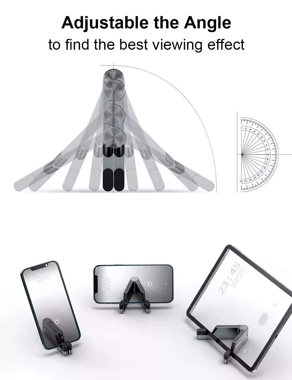 Stable & Durable - Premium aluminum alloy foldable for durability and easy portability, non-slip silicon can protect your device from scratches. This is a well-made, high-quality and sturdy upgrade cell phone stand. Mini Delicate Stand - Take it anywhere, this cell phone stand for desk is collapsible that can be fully folded into a pocket size. Storage little place, easy to carry it in your pocket or bag in travel or business trip. 2 in 1 Phone Holder and Tablet Stand - Compatible with iPhone, Smartphones, iPad and most tablets in smaller than 10.5 inches. Designed on a low center of gravity makes it more stable, so it fits all size of the cell phone and various tablets. User-Friend Design - Adjust the tilt of your phone or tablet by using an extendable or foldable V-shaped design to choose the best viewing angle, and the depth of groove fits exactly with the phone and does not block the screen. Our Advantages: Combined with the newest design, made of sturdy solid materials, exquisite workmanship, smooth edge, lightweight, portable, perfectly works with your smart phones.