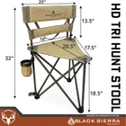 Product Description HD Tri Hunt Stool BUILT FOR THE OUTDOORS : This Tripod style chair is the complete choice for hunting, fishing, travel, sports games and more! Complete with an adjustable cupholder for storing drinks. COMFORTABLE DESIGN : Durable poly oxford padded seating and backrest offers all day comfort, and double layered back design provides a cozy ergonomic support perfect for all day use. LASTING SUPPORT : Built with a heavy-duty powder coated steel frame that can support 300 lbs. This chair measures 32”H, 18” L, 20.5” D when open PORTABLE : This lightweight chair has a carry strap included, making the Tri-Hunt Stool perfect for easy transport while camping, hunting, hiking, or on the sidelines. CONVENIENT : Easy to set up and take down. Quick folding capability makes this the perfect chair for any time you are on the go! Features Lightweight The HD Tri Hunt Field Chair only weighs 6 lbs. With a built in carry strap, this chair is perfect for all camping, hunting, and fishing trips Tough Frame Equipped with a heavy duty powder coated steel frame and a weight rating of 300 lbs, this chair ensures durability in the field Folds Down This compact stool folds down, making it easy to set up and take down while on the go HD Tri Hunt High Back Field Chair Tri-Pod Stool XL Tri Leg Stool Add to Cart Add to Cart Add to Cart Add to Cart Customer Reviews 4.3 out of 5 stars 137 4.2 out of 5 stars 66 4.6 out of 5 stars 116 4.4 out of 5 stars 177 Price $45.99 $ 45 . 99 $32.99 $ 32 . 99 $36.99 $ 36 . 99 $31.99 $ 31 . 99 Weight Capacity 300 lbs 300 lbs 225 lbs 225 lbs Size 30"H x 15.5"W x 11"D 32"H x 18"W x 20.5"D 38"H x 24"W x 25"D 20"H x 16.5"W x 16.5"D Folded Size 22" x 16" 32" x 8" 31.5" x 4" 27" x 3.5" Weight 5 lbs 6 lbs 3 oz 3 lbs 1 oz 2 lbs 5 oz Feature Easy to Transport / Storage Easy to Transport Easy to Transport Easy to Transport