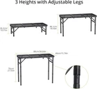 About this item 3 Height Adjustable up to 27.5 in: The height of Anbte folding table is adjustable between 10 in, 20 in and 27.5 in.You can adjust the height of the table according to the suitable for different occasions: picnic / bbq / beach / coffee / camping / fishing etc Iron Mesh Table Top, Heat Resistant & Easy to Clean: The tabletop is designed with a unique coated metal mesh that prevents the tabletop from rusting or warping due to standing water. And it reduces surface stains, which can be easily removed by simply wiping with a damp paper towel Easy Portable Assembly: This folding camping table can be set up or folded to the size of a briefcase in less than a minute and comes with carrying handles, making it very easy to carry and store. Perfect for storing in your car, camper, backpacks, rafts, motorcycle rear seats Premium Quality Material, Stable and Sturdy: Anbte outdoor grill table is made of updated and thickened aluminum frame, very durable. Side snaps secure the tabletop in place and keep it level. U-shaped frame improves the stability of the table Multifunction Table: Anbte small foldable table is suitable for indoor and outdoor use. It can be used as a camping table, barbecue table, fishing table, picnic table, side table, RV outdoor activities, campfire, card table, etc Note: 1. The dimensions of our camping tables are all measured by hand, so please allow an error of about 1 cm. Thank you for your understanding. 2. This product adjusts the height by inserting and pulling out the leg, please use it in a flat place. 3. Gently press the table top in the middle to make sure it is flat › See more product details