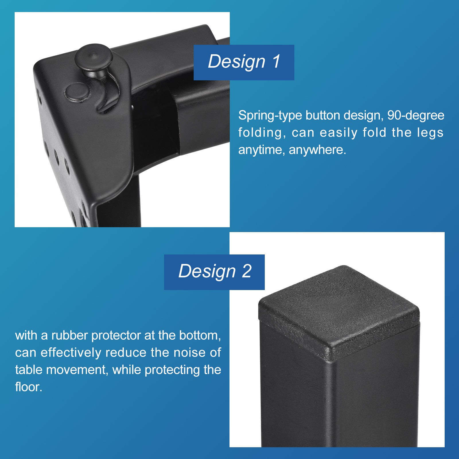 Document Descriptions:1. Material: The folding table legs are made of iron with black coating on the surface, which is rust-proof and load-bearing, durable, and easy to clean.2. Design: Spring-type button design, 90-degree folding, can easily fold the legs anytime, anywhere, with a rubber protector at the bottom, can effectively reduce the noise of table movement, while protecting the floor.3. Installation: It can be installed directly with screws, is flexible in design, is suitable for multiple directions, and can be folded up for convenient storage when not in use.4. Application: Foldable table legs can DIY furniture, just replacing the table legs can improve the height of furniture, cabinets, nightstands, sofas, chairs, shelves, desks, coffee tables, living room tables, laptop tables, etc.Specification:Material: IronTotal Size: 400 x 45mm / 15.7" x 1.8"(L*W)Square Tubing Size: 25 x 25mm / 1" x 1"Folding Thickness: 31mm / 1.22"Plate Thickness: 2mm / 0.08"Mounting Hole Diameter: 5mm / 0.2"Mounting Hole Distance: 25mm / 1", 52mm / 2"Package Content: 4pcs x Folding Furniture Legs Folding Table Legs, 4pcs 40cm(15.7") Metal Foldable Table Furniture Legs Descriptions: 1. Material: The folding table legs are made of iron with black coating on the surface, which is rust-proof and load-bearing, durable, and easy to clean. 2. Design: Spring-type button design, 90-degree folding, can easily fold the legs anytime, anywhere, with a rubber protector at the bottom, can effectively reduce the noise of table movement, while protecting the floor. 3. Installation: It can be installed directly with screws, is flexible in design, is suitable for multiple directions, and can be folded up for convenient storage when not in use. 4. Application: Foldable table legs can DIY furniture, just replacing the table legs can improve the height of furniture, cabinets, nightstands, sofas, chairs, shelves, desks, coffee tables, living room tables, laptop tables, etc. Specification: Material: Iron Total Size: 400 x 45mm / 15.7" x 1.8"(L*W) Square Tubing Size: 25 x 25mm / 1" x 1" Folding Thickness: 31mm / 1.22" Plate Thickness: 2mm / 0.08" Mounting Hole Diameter: 5mm / 0.2" Mounting Hole Distance: 25mm / 1", 52mm / 2" Package Content: 4pcs x Folding Furniture Legs Hot Item Payment 1.We accept eBay payment . 2.Payment must be received within 7 business days of auction closing. Shipping 1.We ship to your eBay or Paypal address. Please make sure your eBay and Paypal address is correct before you pay. 2.Items will be shipped within 1-3 business day when we received payment. 3.Delivery time depends on destination and other factors. Description Policy Folding Table Legs, 4pcs 40cm(15.7") Metal Foldable Table Furniture Legs Descriptions: 1. Material: The folding table legs are made of iron with black coating on the surface, which is rust-proof and load-bearing, durable, and easy to clean. 2. Design: Spring-type button design, 90-degree folding, can easily fold the legs anytime, anywhere, with a rubber protector at the bottom, can effectively reduce the noise of table movement, while protecting the floor. 3. Installation: It can be installed directly with screws, is flexible in design, is suitable for multiple directions, and can be folded up for convenient storage when not in use. 4. Application: Foldable table legs can DIY furniture, just replacing the table legs can improve the height of furniture, cabinets, nightstands, sofas, chairs, shelves, desks, coffee tables, living room tables, laptop tables, etc. Specification: Material: Iron Total Size: 400 x 45mm / 15.7" x 1.8"(L*W) Square Tubing Size: 25 x 25mm / 1" x 1" Folding Thickness: 31mm / 1.22" Plate Thickness: 2mm / 0.08" Mounting Hole Diameter: 5mm / 0.2" Mounting Hole Distance: 25mm / 1", 52mm / 2" Package Content: 4pcs x Folding Furniture Legs Hot Item Payment 1.We accept eBay payment . 2.Payment must be received within 7 business days of auction closing. Shipping 1.We ship to your eBay or Paypal address. Please make sure your eBay and Paypal address is correct before you pay. 2.Items will be shipped within 1-3 business day when we received payment. 3.Delivery time depends on destination and other factors.